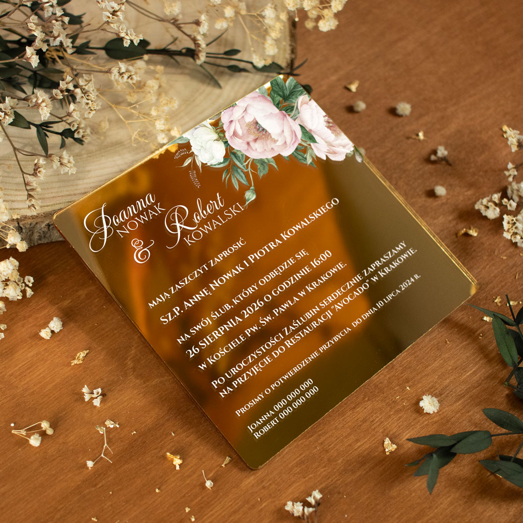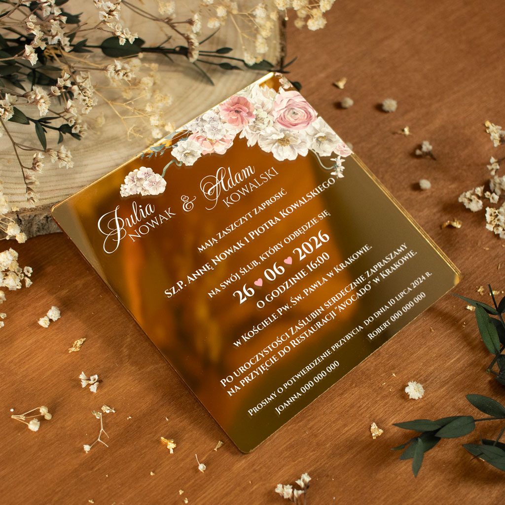 Akrylowe Zaproszenie Ślubne – lustrzane złoto – Wiktoria2
