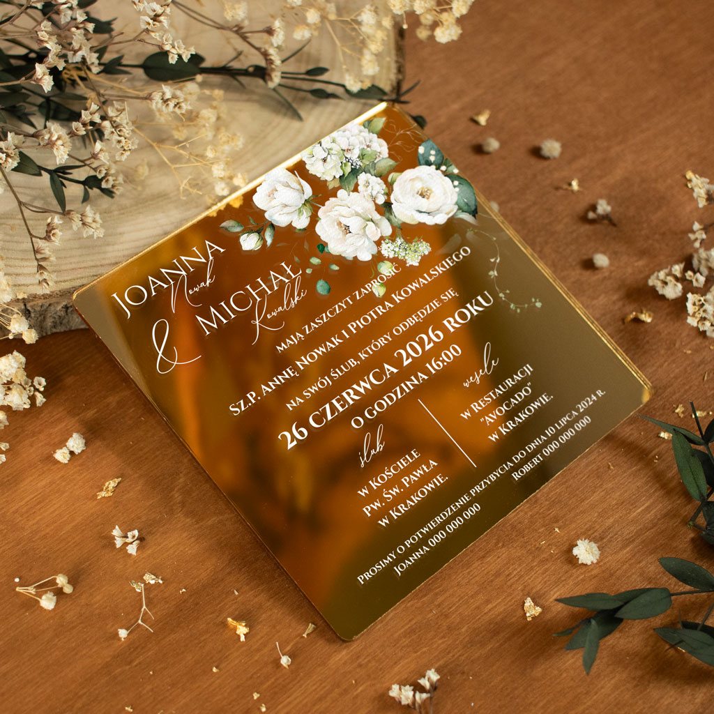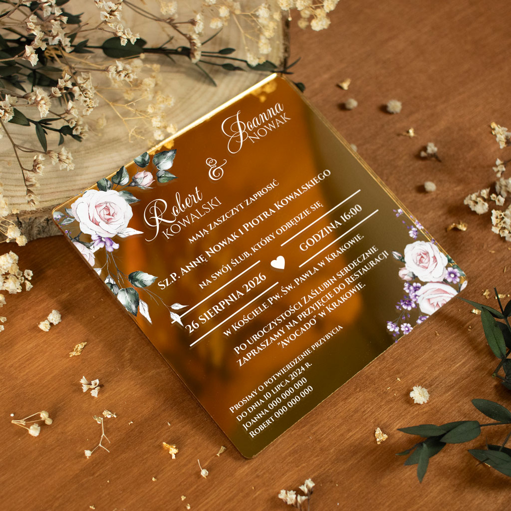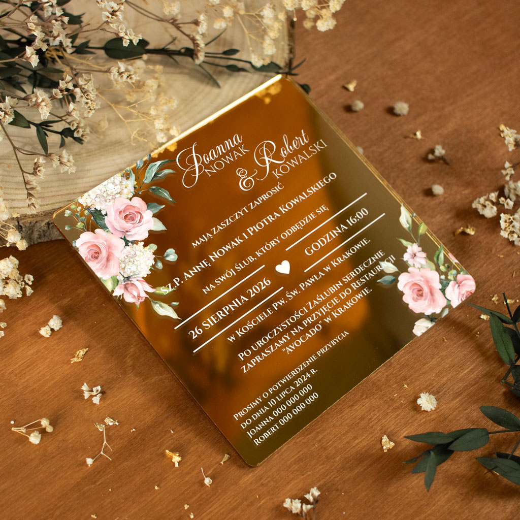 Akrylowe Zaproszenie Ślubne – lustrzane złoto – Wiktoria2