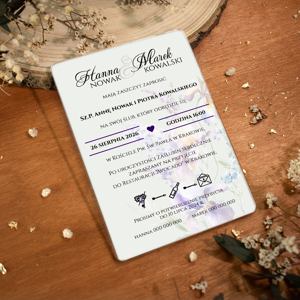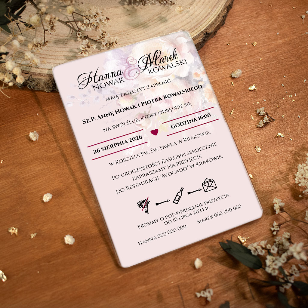 Stylowe zaproszenia ślubne wykonane na przezroczystym akrylu, co nadaje im wyjątkowy charakter.
