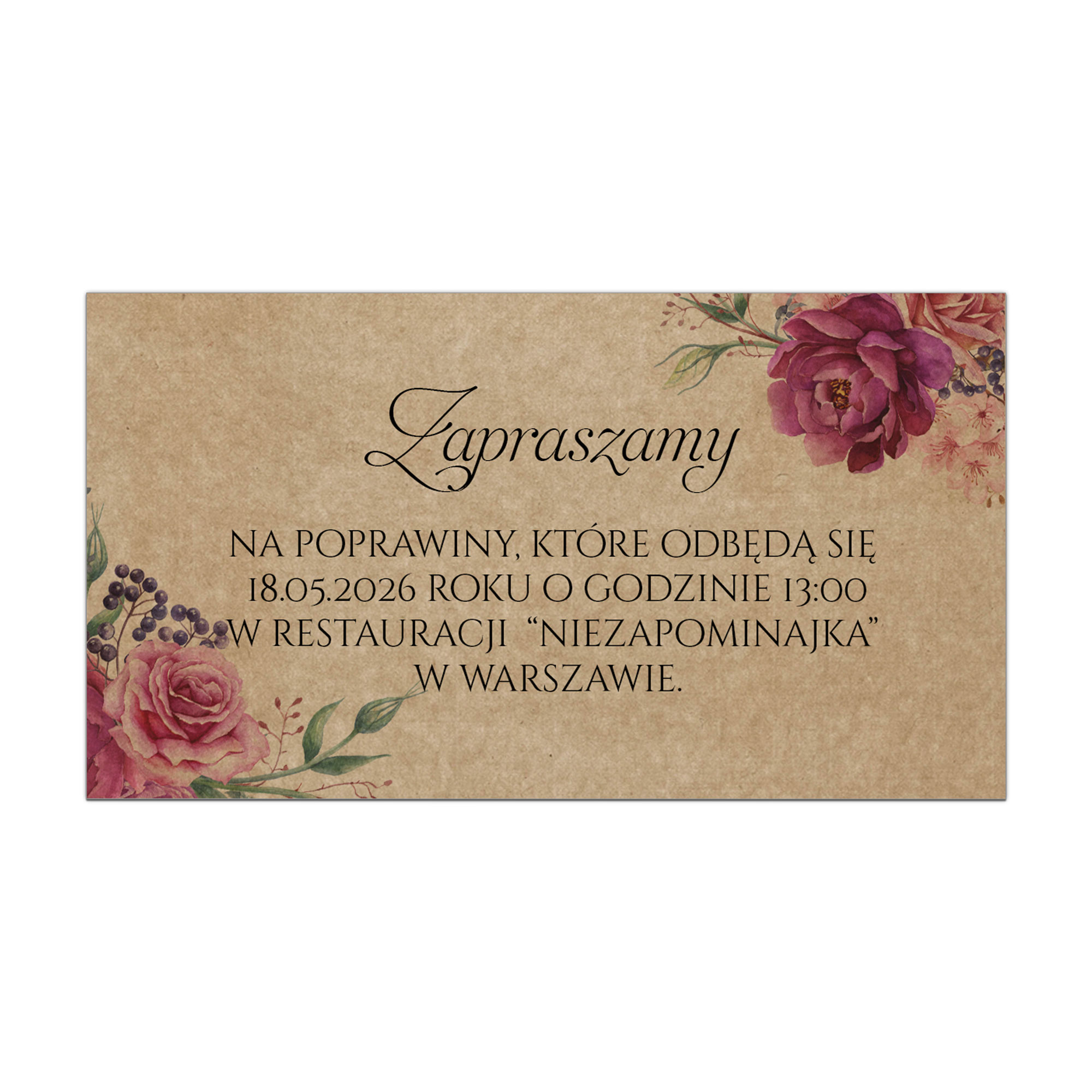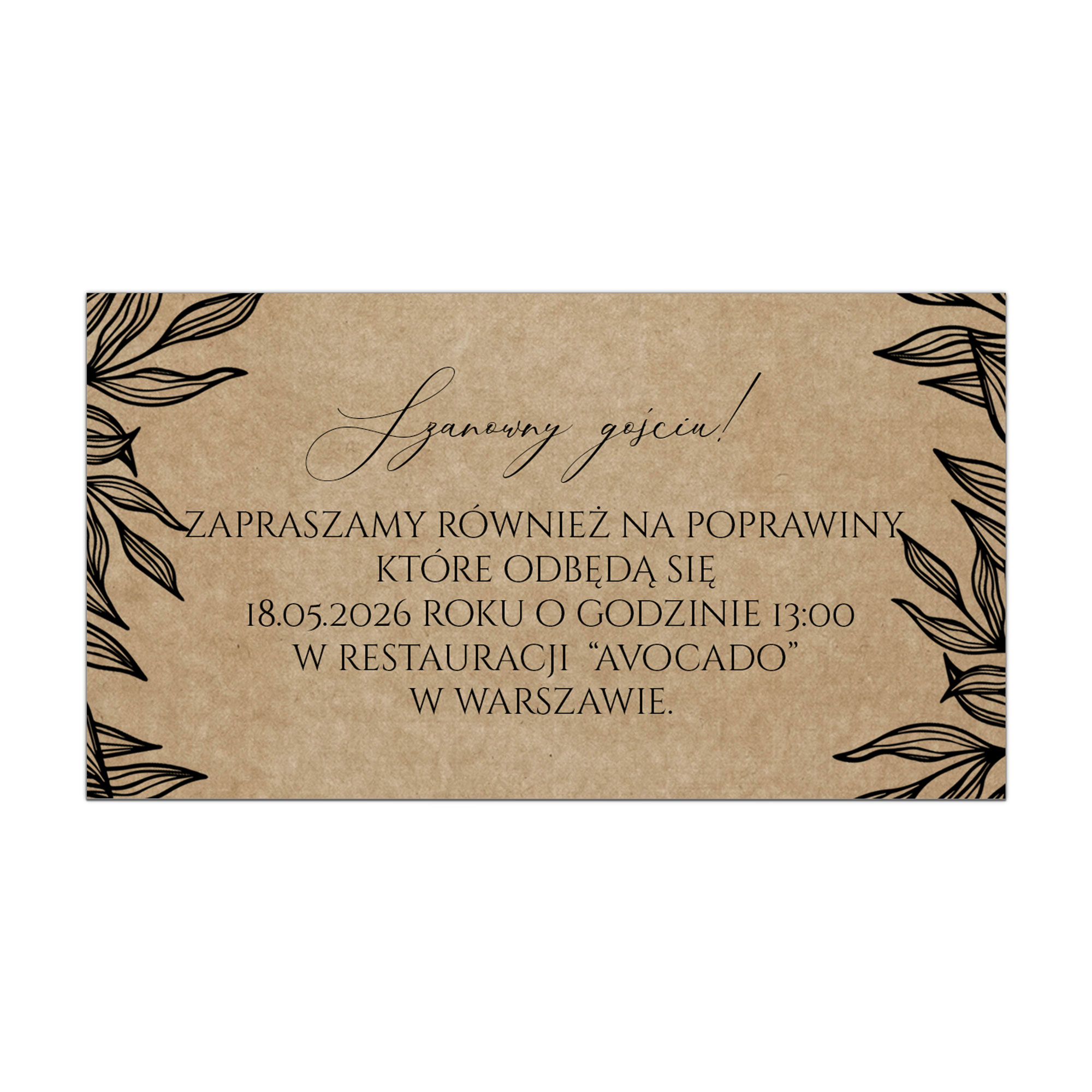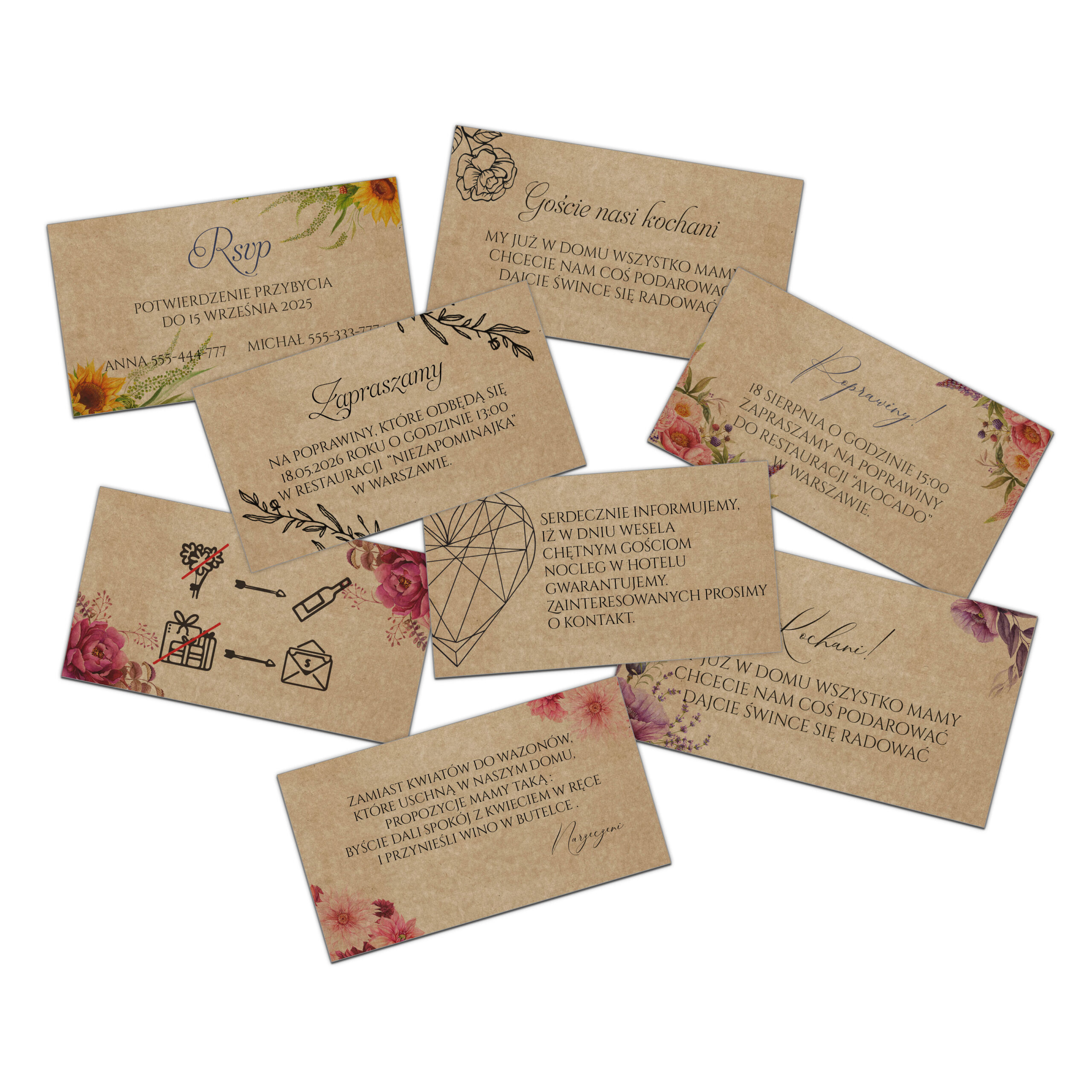 Niezwykle praktyczny dodatek do zaproszeń – ozdobna karteczka z dowolną treścią. Idealne do przekazania gościom wszelkich dodatkowych informacji. W ofercie posiadamy bardzo wiele różnych wzorów. Treść jest całkowicie dowolna.