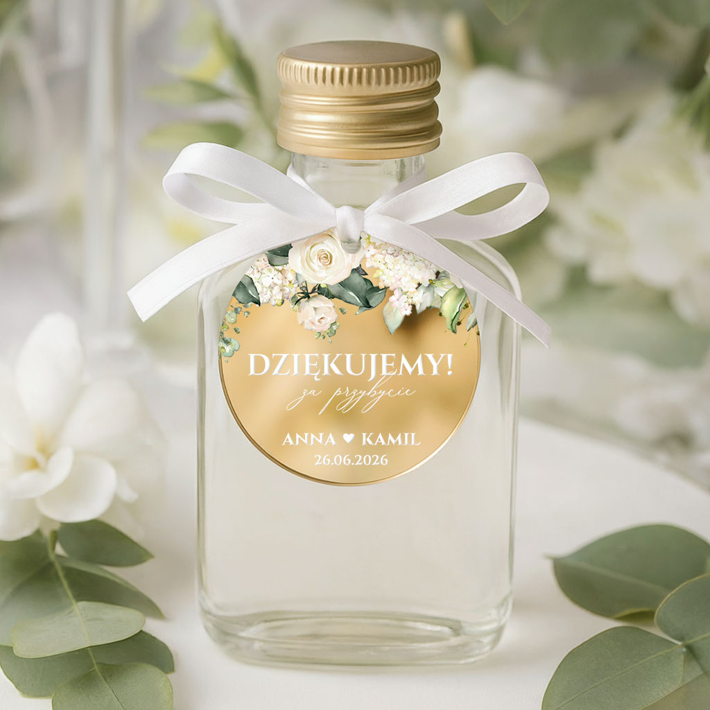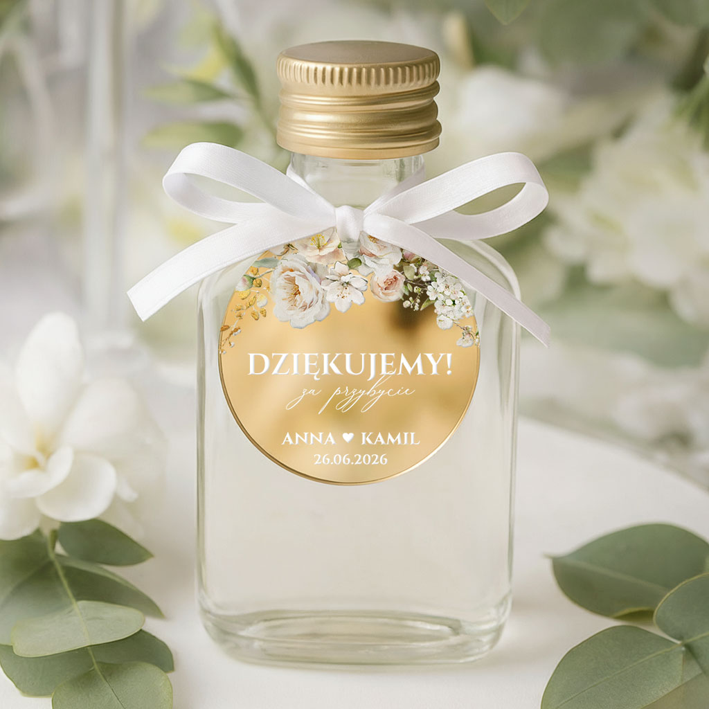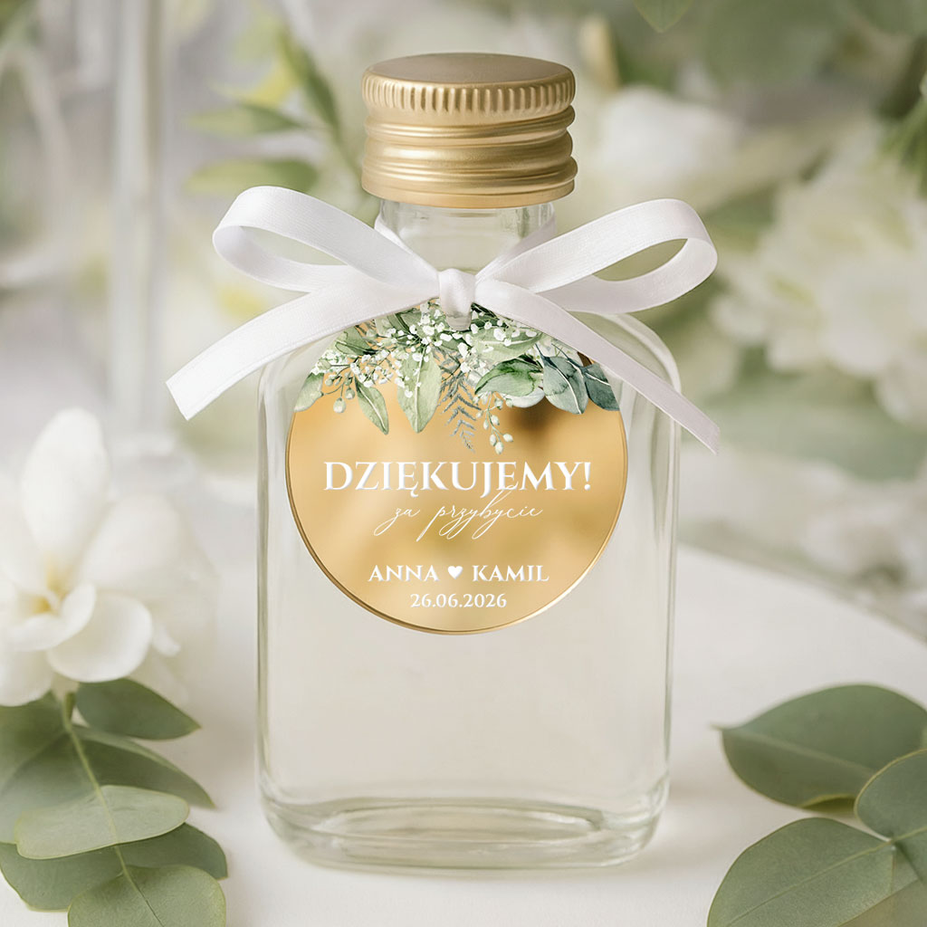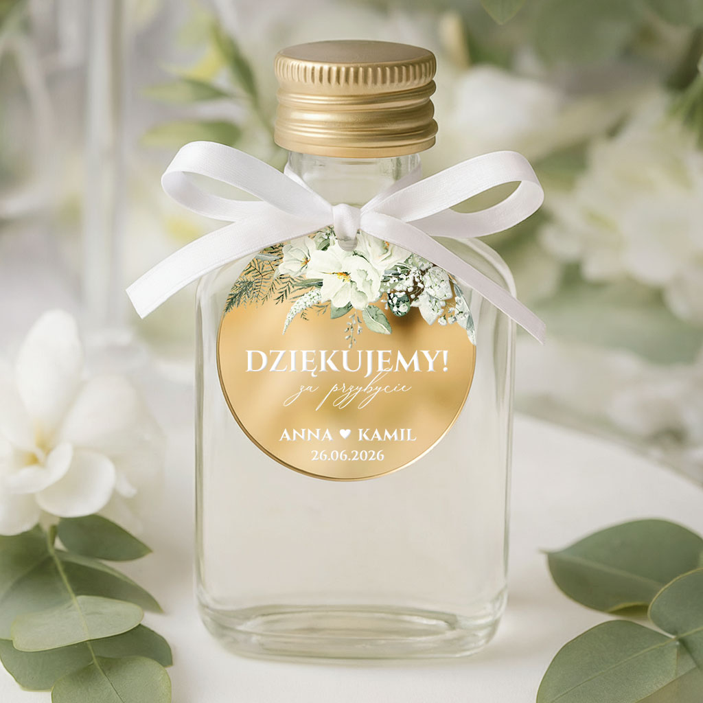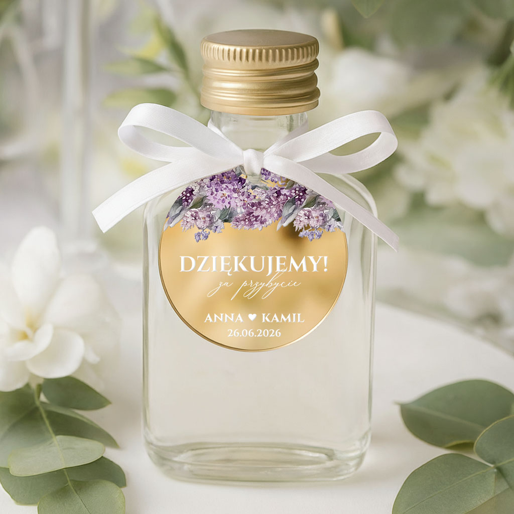 Buteleczka na alkohol weselny – podziękowanie dla gości – zawieszki lustrzane złoto