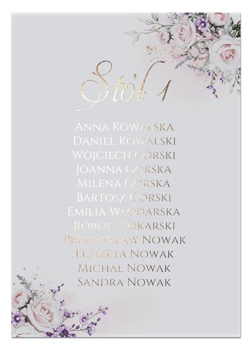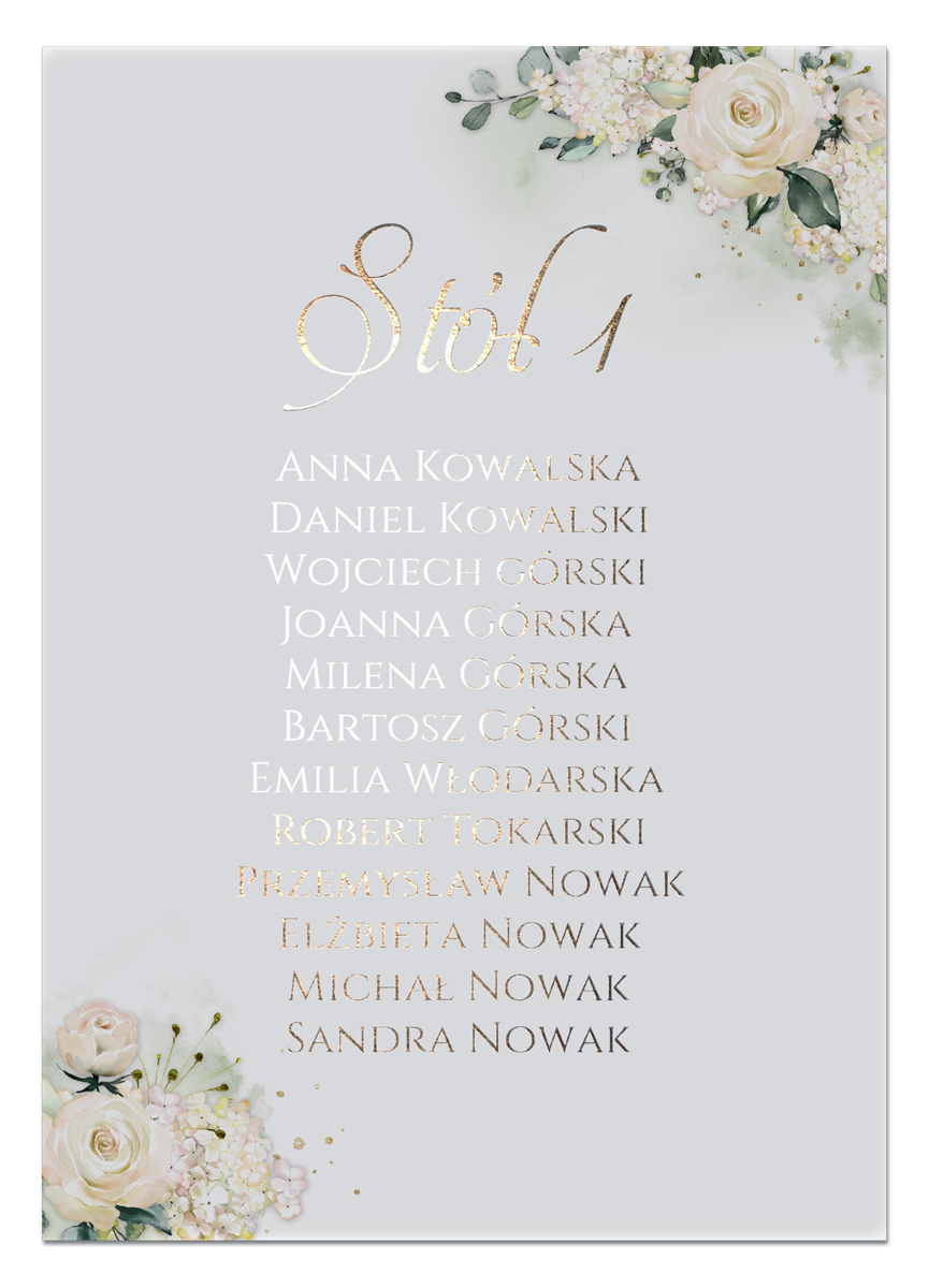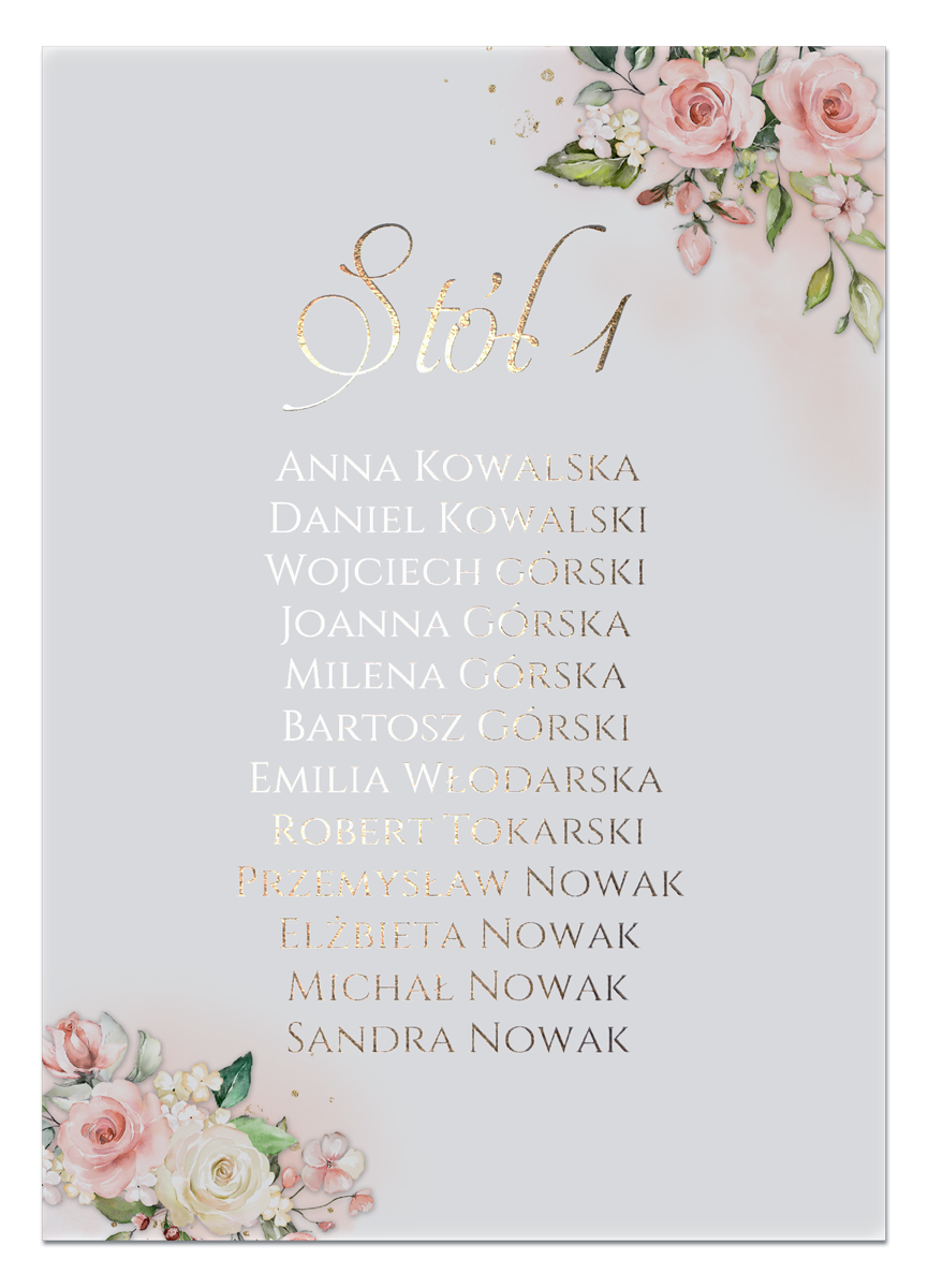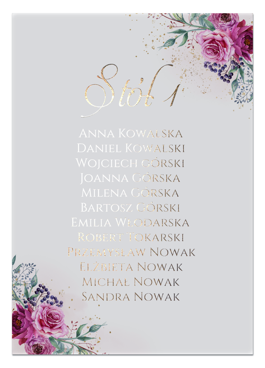 Wymiary– 29,7 cm x 21 cm | 8 kart w zestawie (karta powitalna + 7 kart stołów) | Produkt jest pozłacany po wydruku (elementy do złocenia są na projekcie czarne)