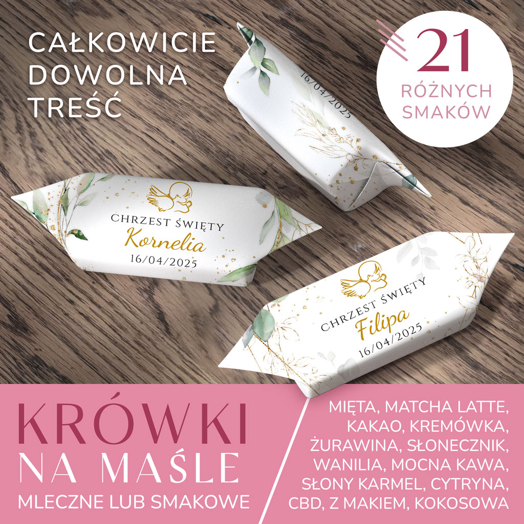 Personalizowane krówki na chrzest to nie tylko słodka przekąska, ale także miły gest wdzięczności dla gości za ich obecność oraz wspólne świętowanie. Dostępne w wielu różnych smakach (widocznych poniżej), które z pewnością zachwycą gości. Oferowane krówki produkowane są na maśle. Treść na krówce jest całkowicie dowolna.