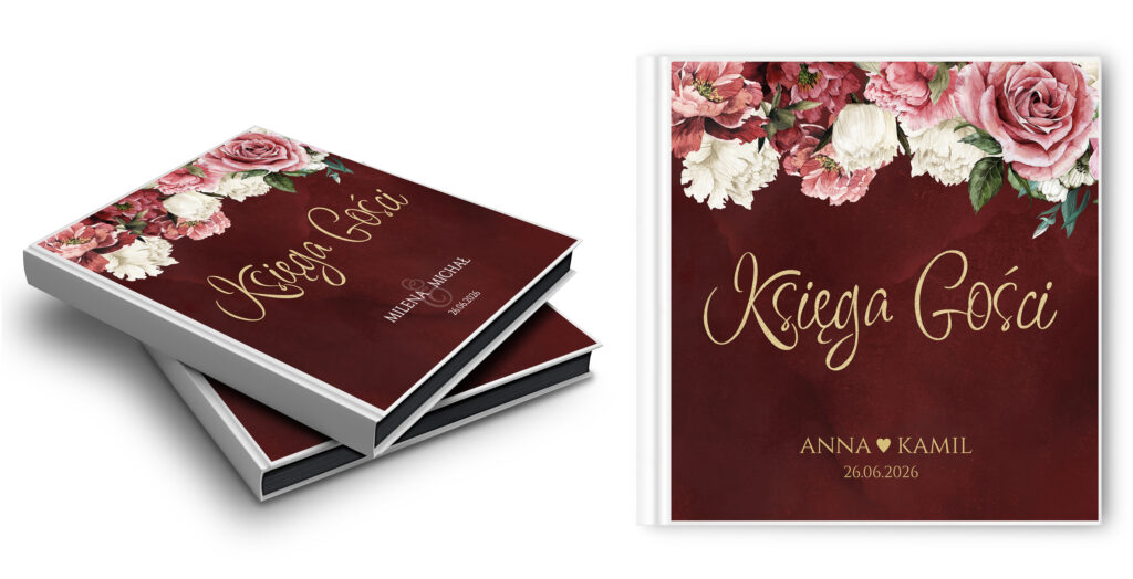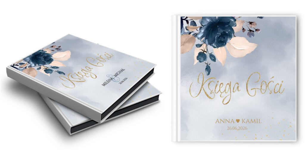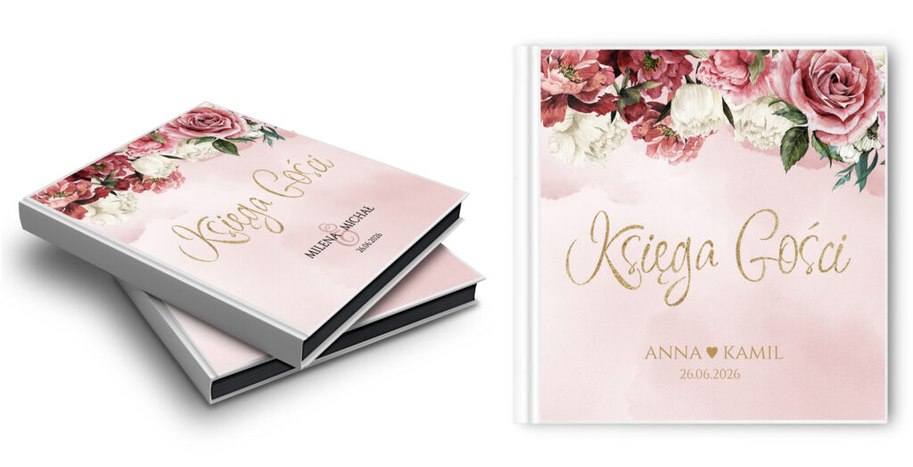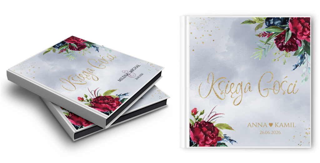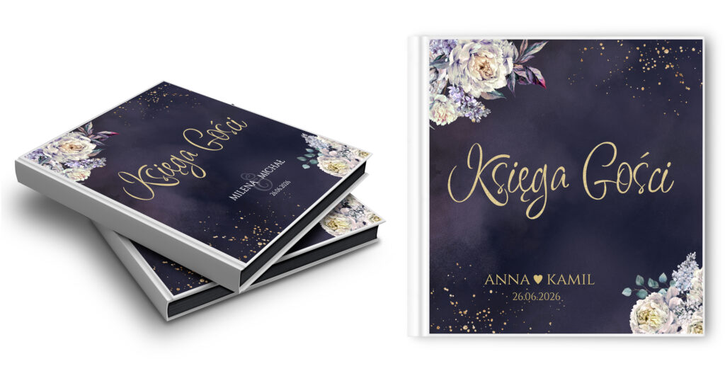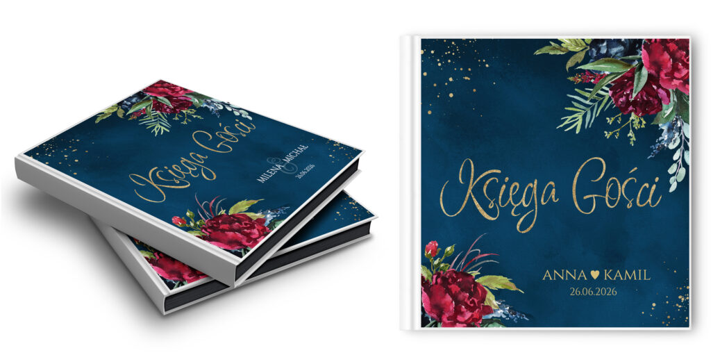 Księga gości weselnych w sztywnej oprawie z personalizowaną okładką to idealny sposób na zachowanie wspomnień z ważnego dnia.