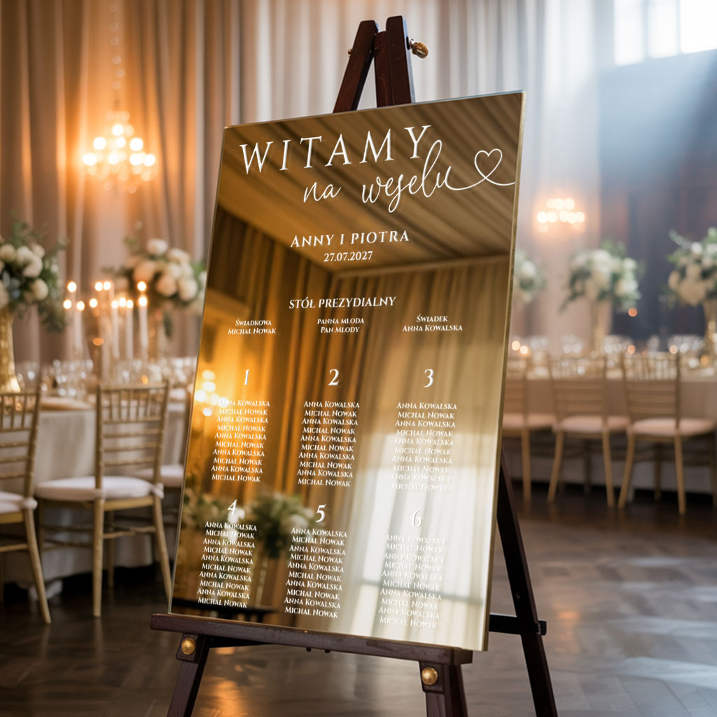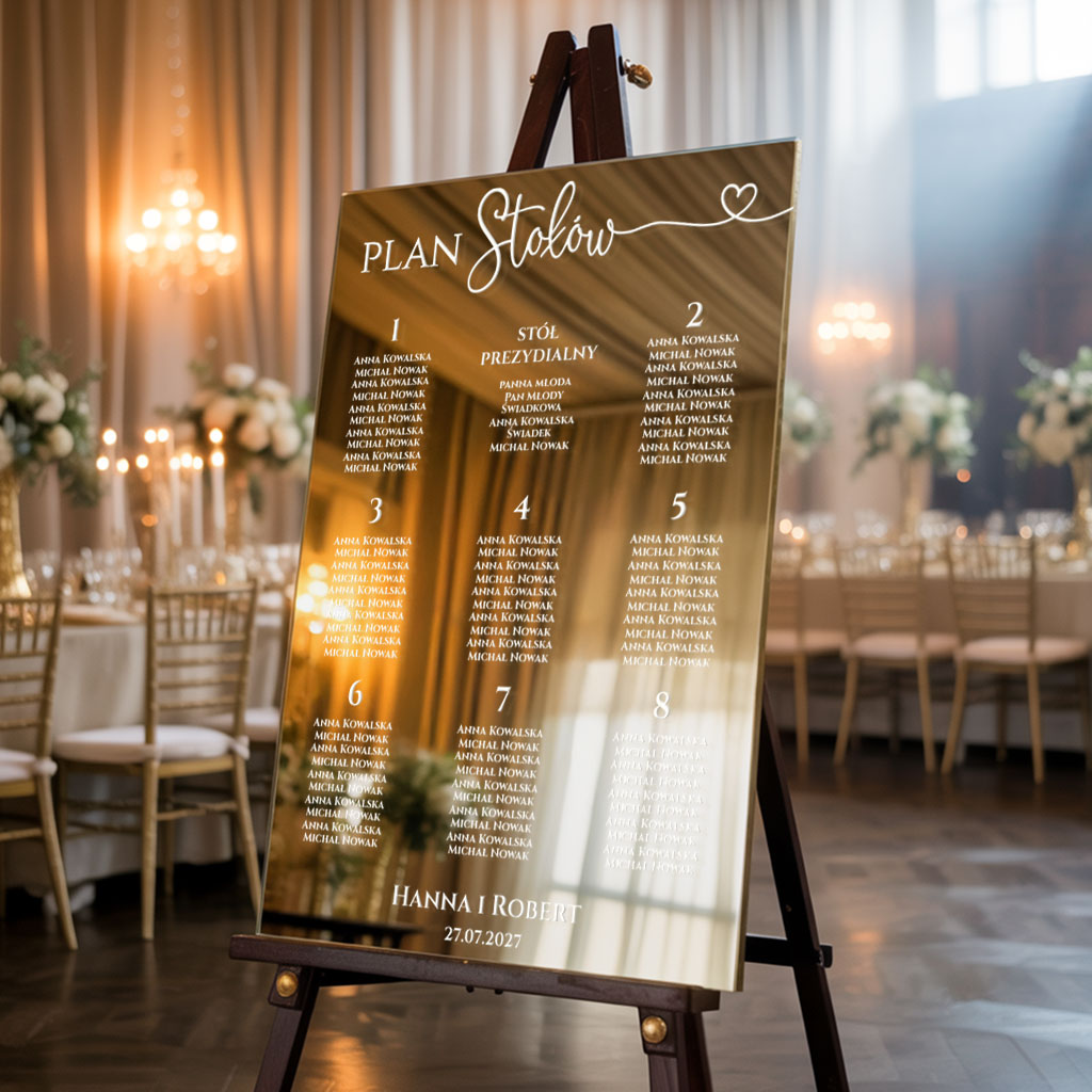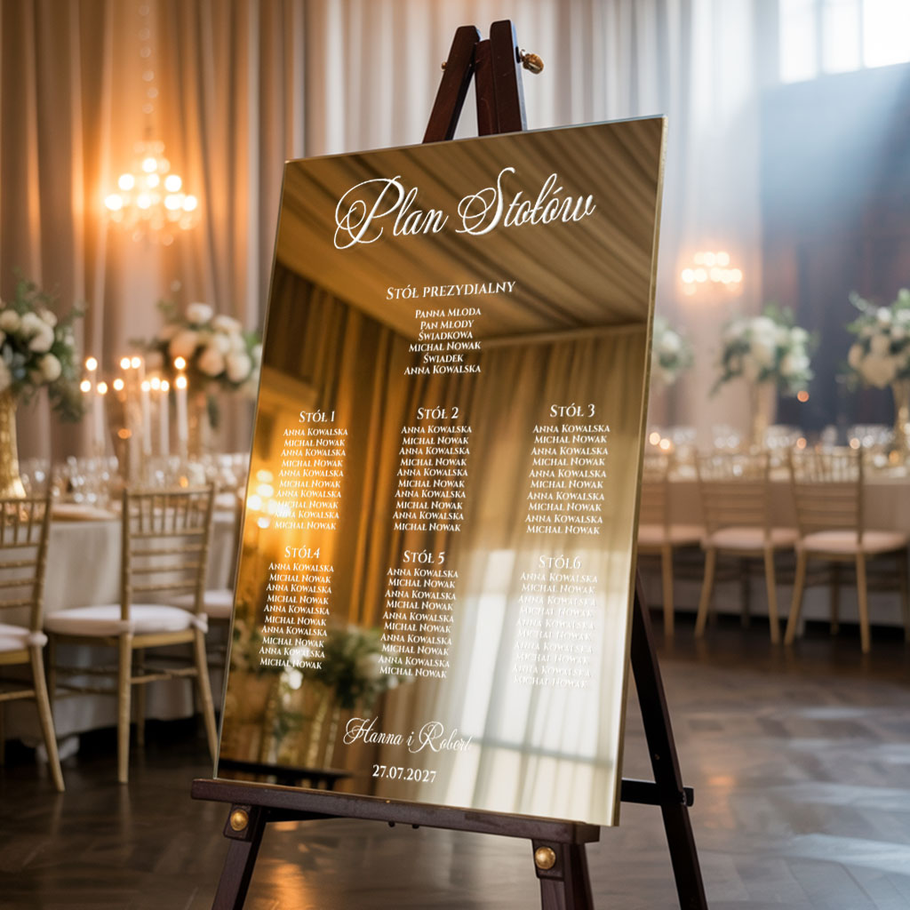Ekskluzywna tablica z usadzeniem gości wykonana z lustrzanej złotej pleksi to elegancki dodatek do wystroju Twojego wesela. Jest ona ważnym elementem organizacyjnym, który wpływa na atmosferę wesela, pomaga w jego płynnym przebiegu i dodaje całemu wydarzeniu osobistego uroku. Treść na tablicy jest całkowicie dowolna.