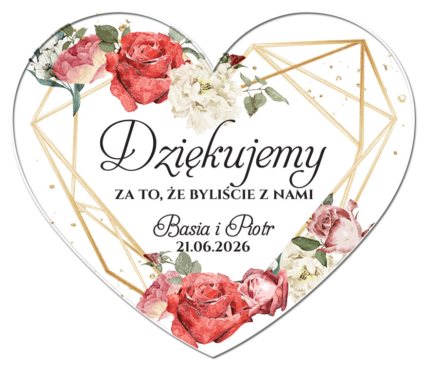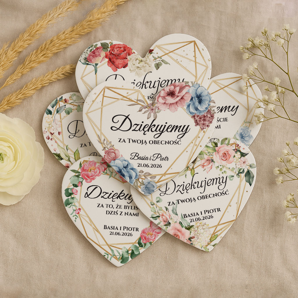 Wyjątkowe magnesy ślubne z podziękowaniem dla gości, które będą niezapomnianą pamiątką z Waszego wyjątkowego dnia. Magnesy z nadrukiem UV z pięknym motywem serca, idealnie wpisującym się w klimat każdej uroczystości. Subtelne i eleganckie – doskonałe dopełnienie ślubnych podziękowań!