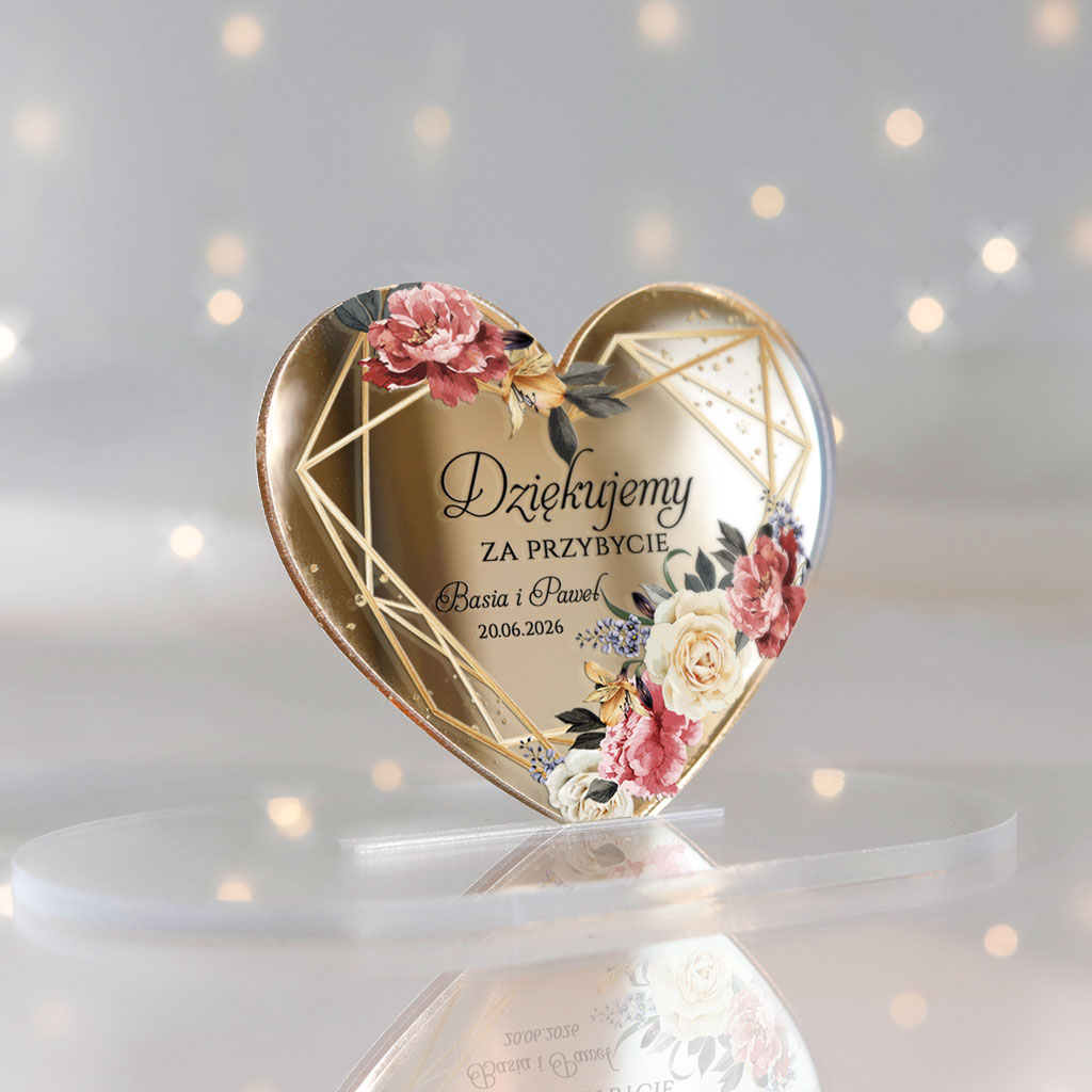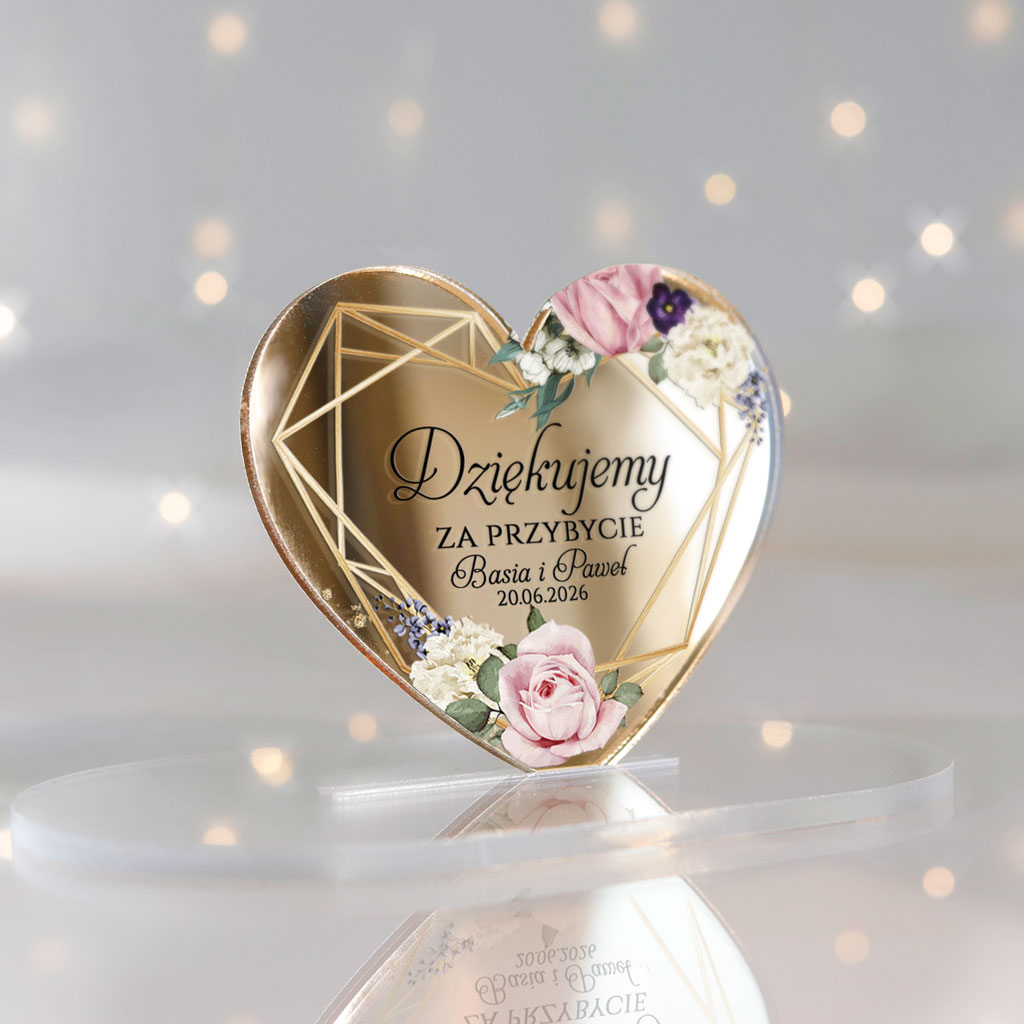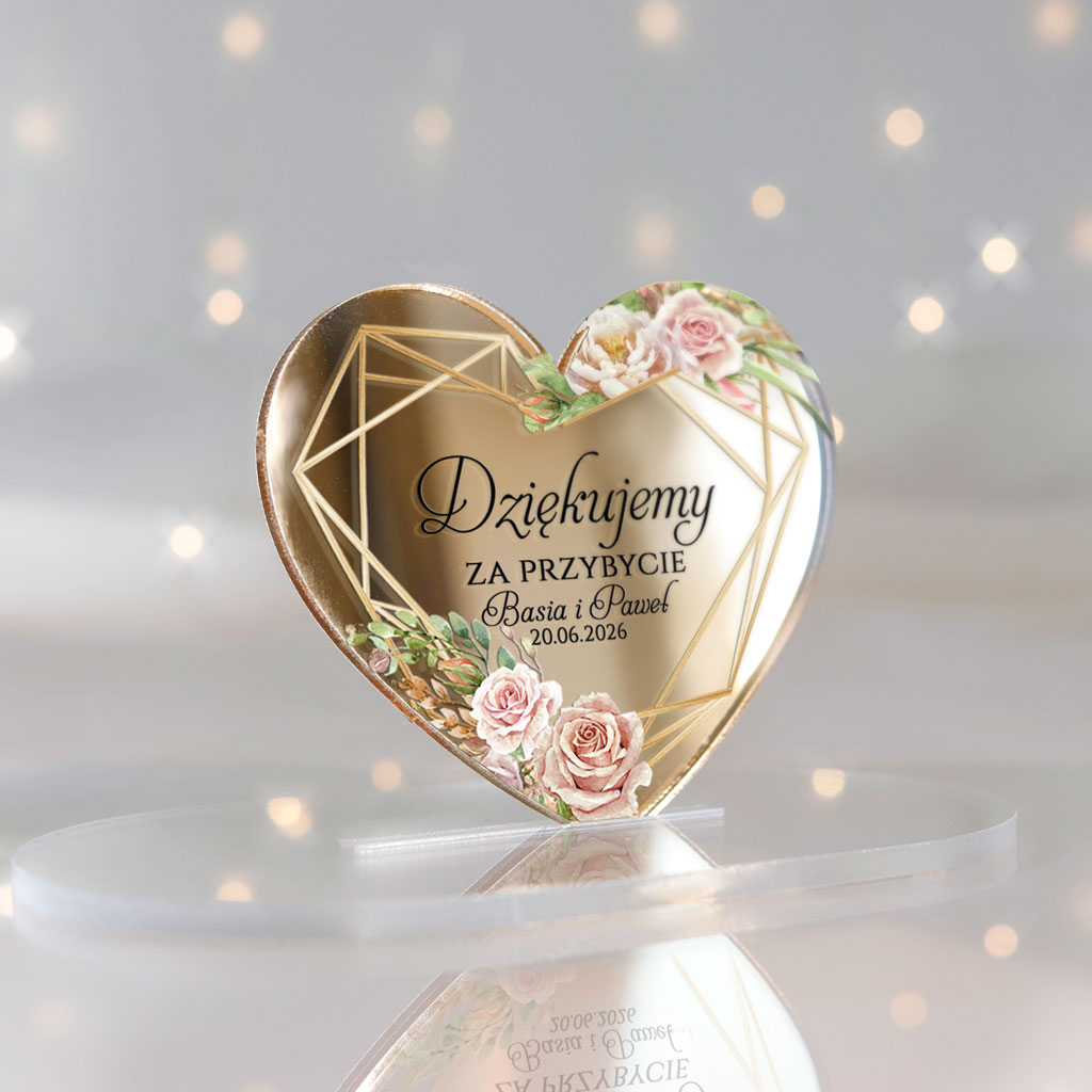 Magnesy realizowane na pleksi złote lustro 3mm | Nadruk UV | Wymiary: 7×6 cm | naklejki magnetyczne do samodzielnego podklejenia serc | Dowolna treść | Zamówienia realizujemy od ilości minimalnej 30szt