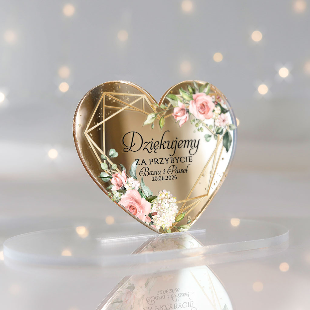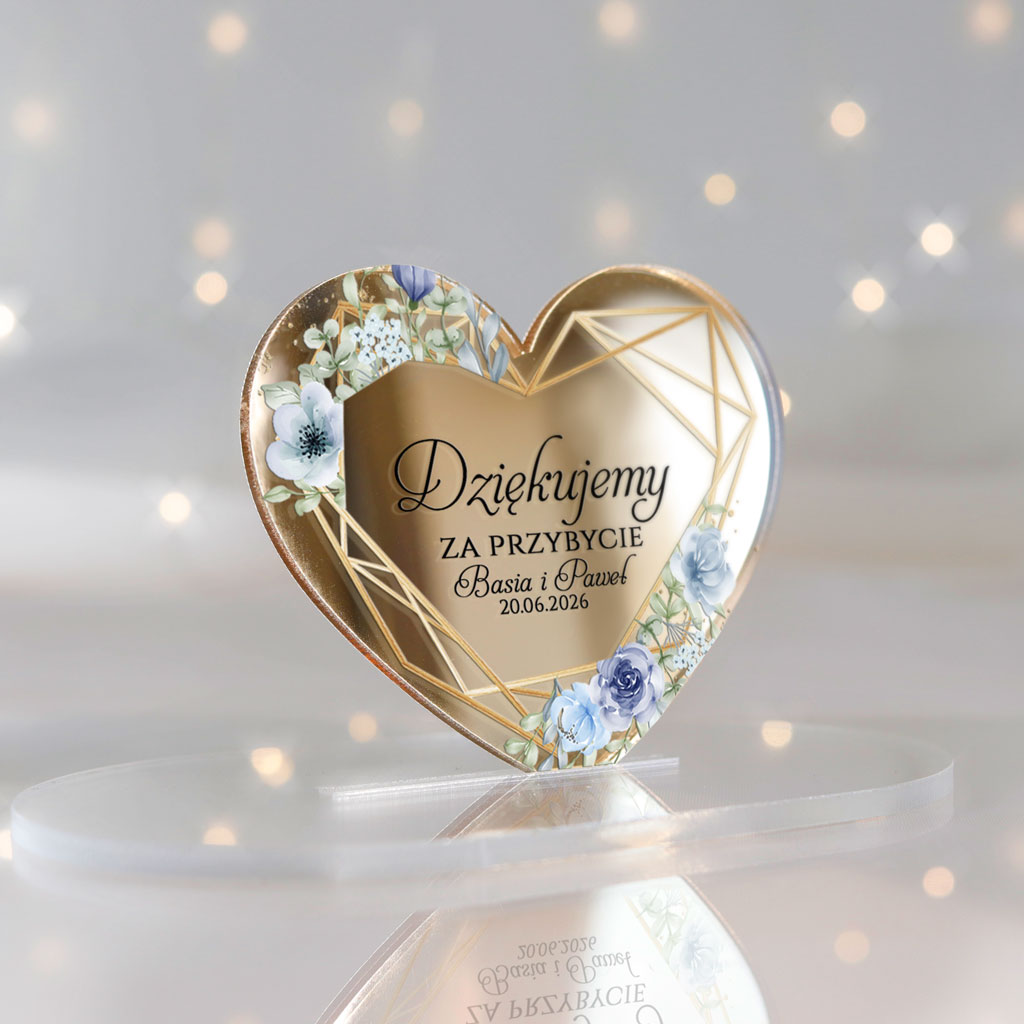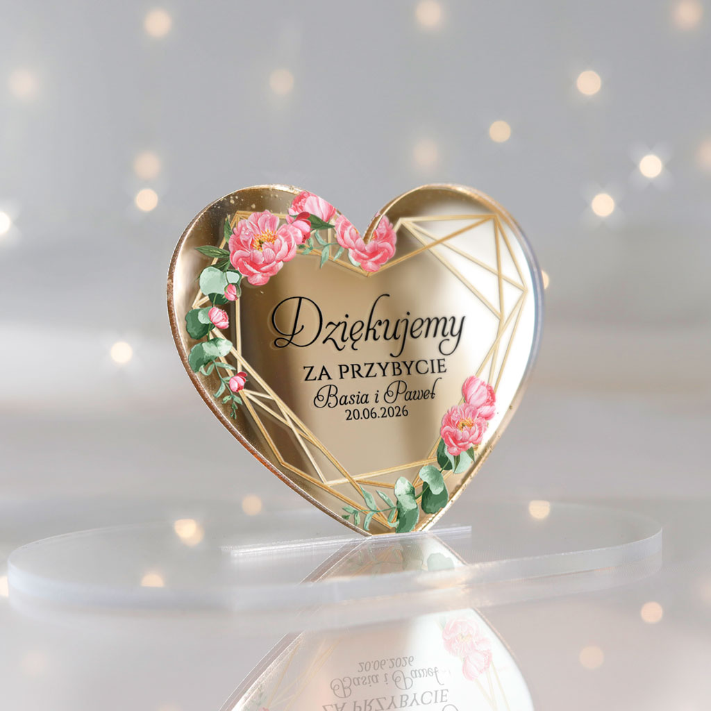 Magnesy realizowane na pleksi złote lustro 3mm | Nadruk UV | Wymiary: 7×6 cm | naklejki magnetyczne do samodzielnego podklejenia serc | Dowolna treść | Zamówienia realizujemy od ilości minimalnej 30szt