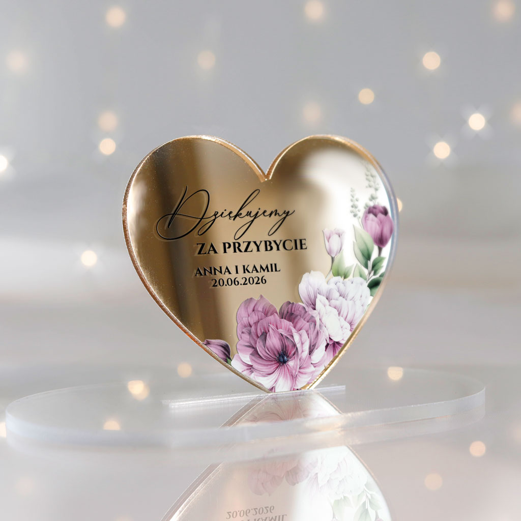 Magnesy realizowane na pleksi złote lustro 3mm | Nadruk UV | Wymiary: 7×6 cm | naklejki magnetyczne do samodzielnego podklejenia serc | Dowolna treść | Zamówienia realizujemy od ilości minimalnej 30szt