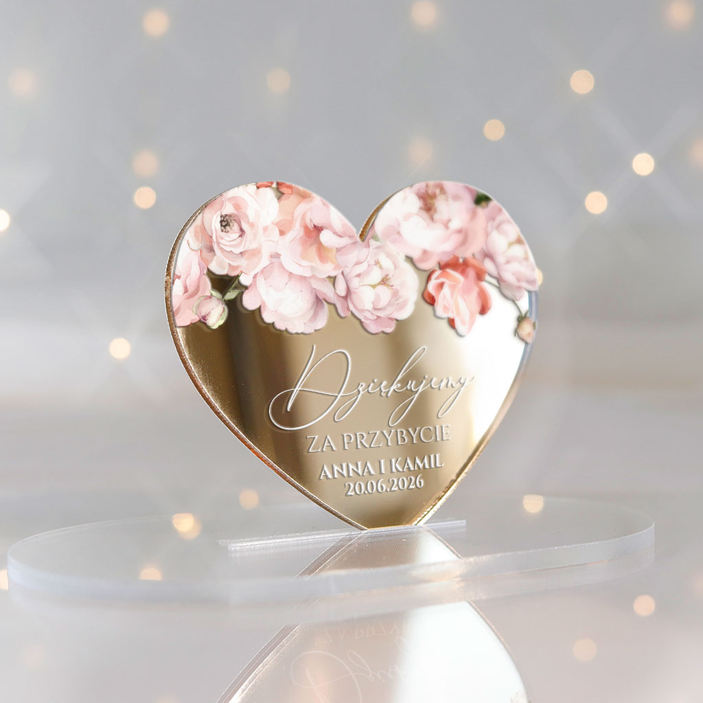 Magnesy realizowane na pleksi złote lustro 3mm | Nadruk UV | Wymiary: 7×6 cm | naklejki magnetyczne do samodzielnego podklejenia serc | Dowolna treść | Zamówienia realizujemy od ilości minimalnej 30szt