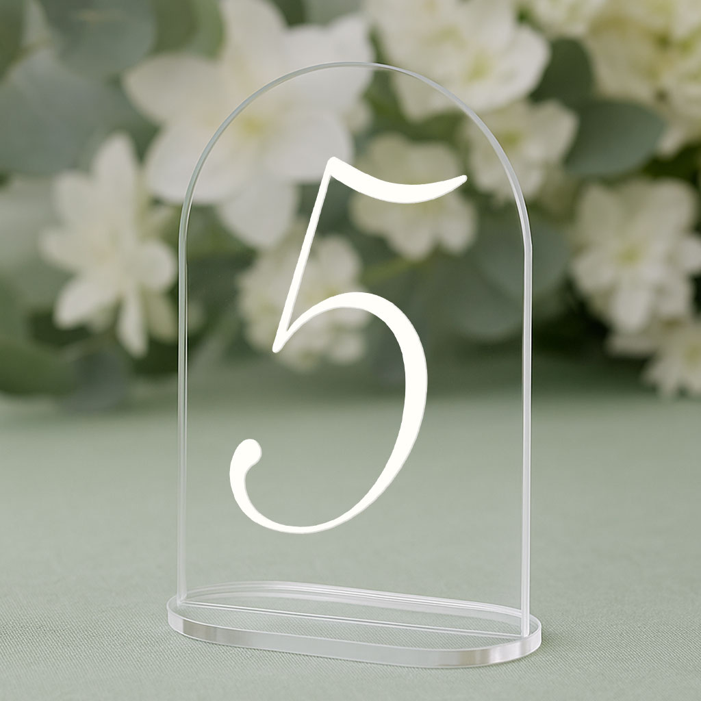 Numery na stół wykonane są z bezbarwnej pleksi z nadrukowaną cyfrą w kolorze białym.