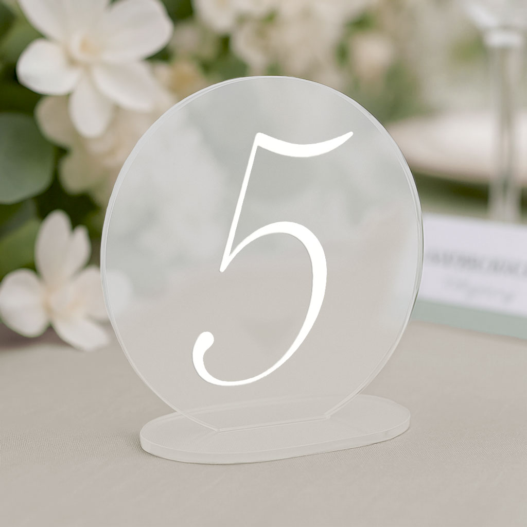Numery na stół wykonane są z mlecznej pleksi z nadrukowaną cyfrą w kolorze białym.