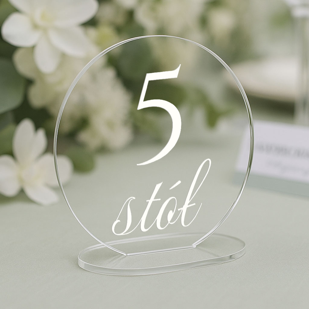 Numery na stół wykonane są z bezbarwnej pleksi z nadrukowaną cyfrą w kolorze białym.