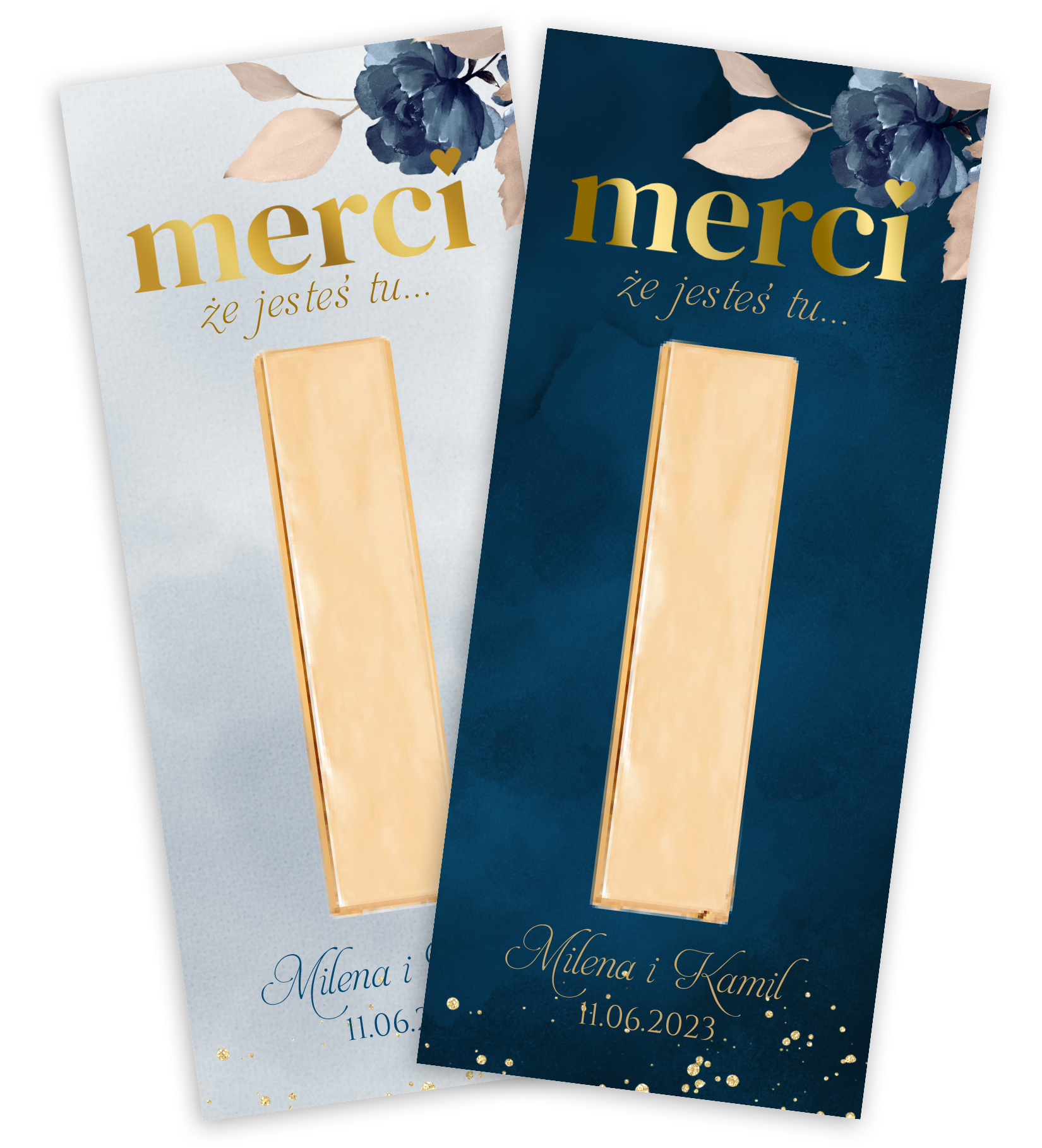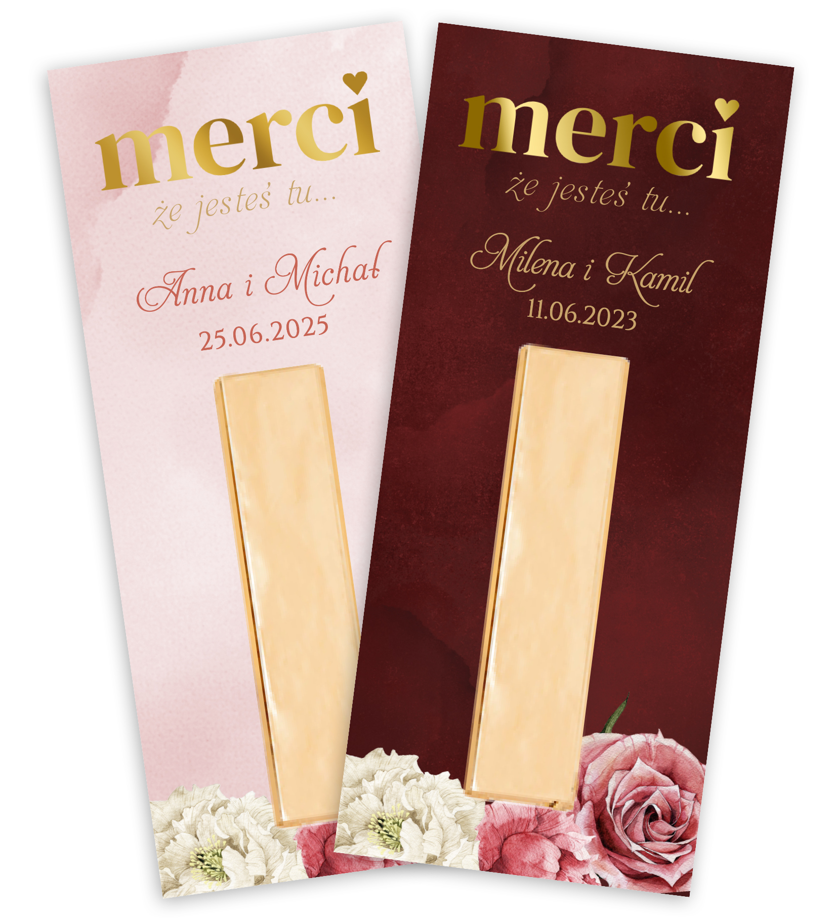 Wymiary podziękowania – 6 cm x 14 cm | komplet 2 podziękowań + wstążki | dowolna treść | zestaw nie zawiera czekoladki!