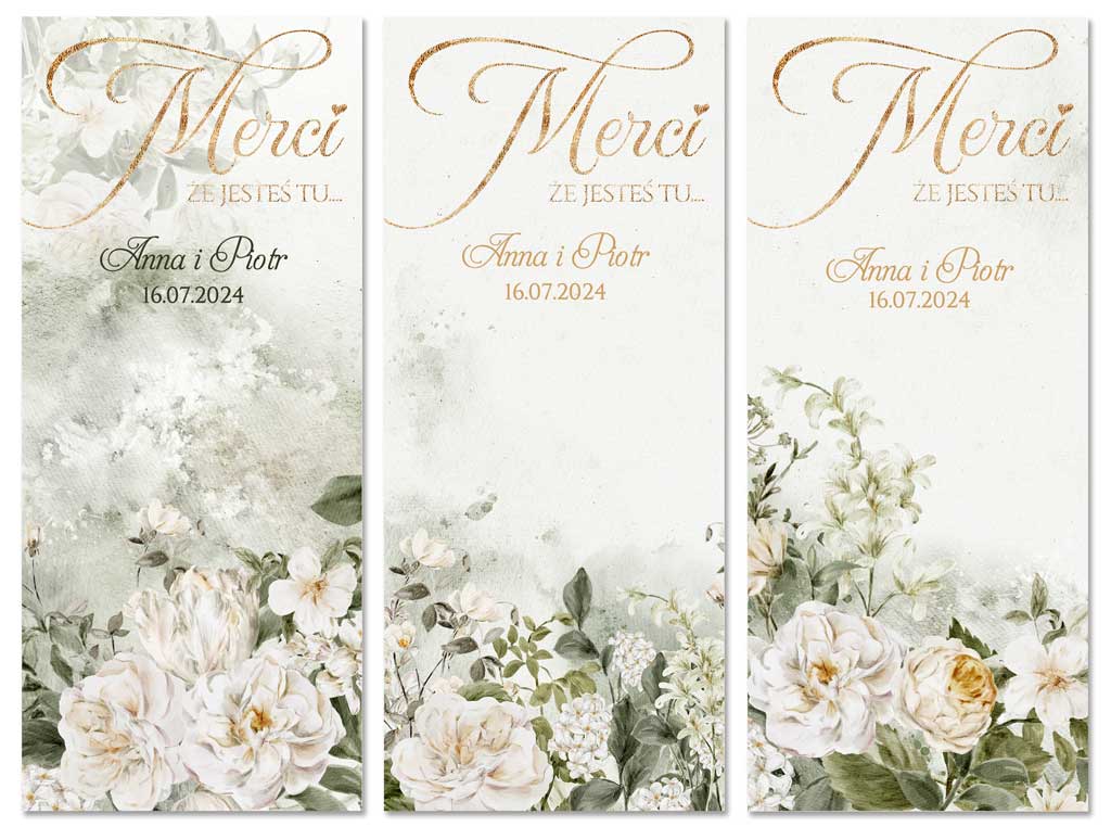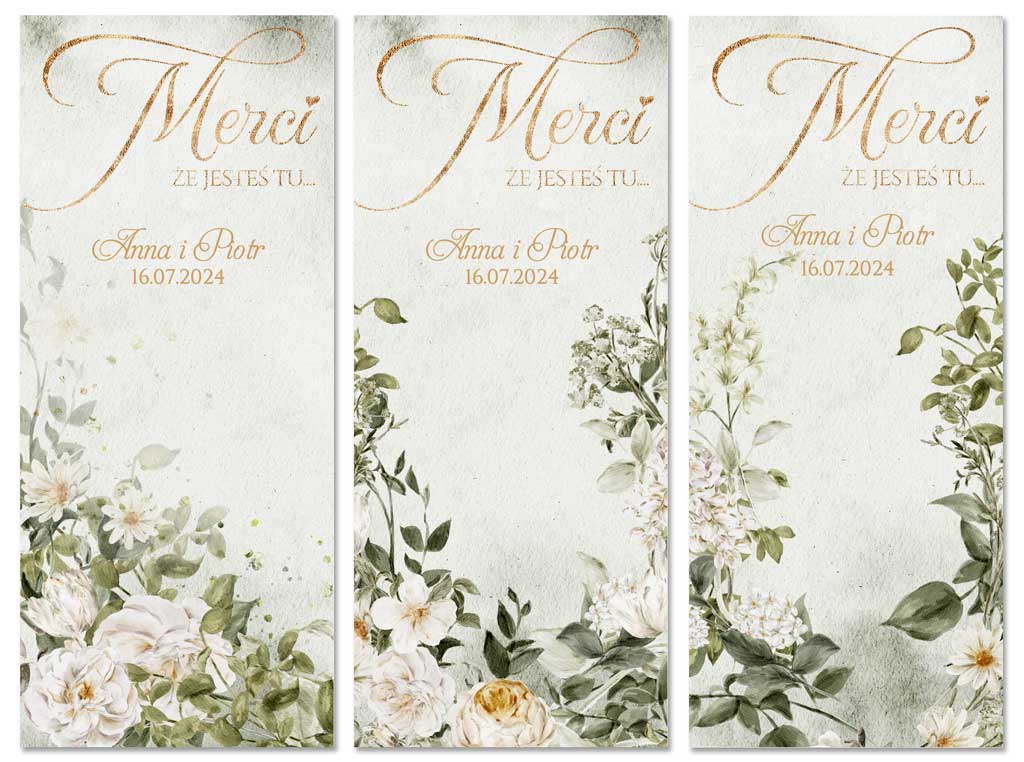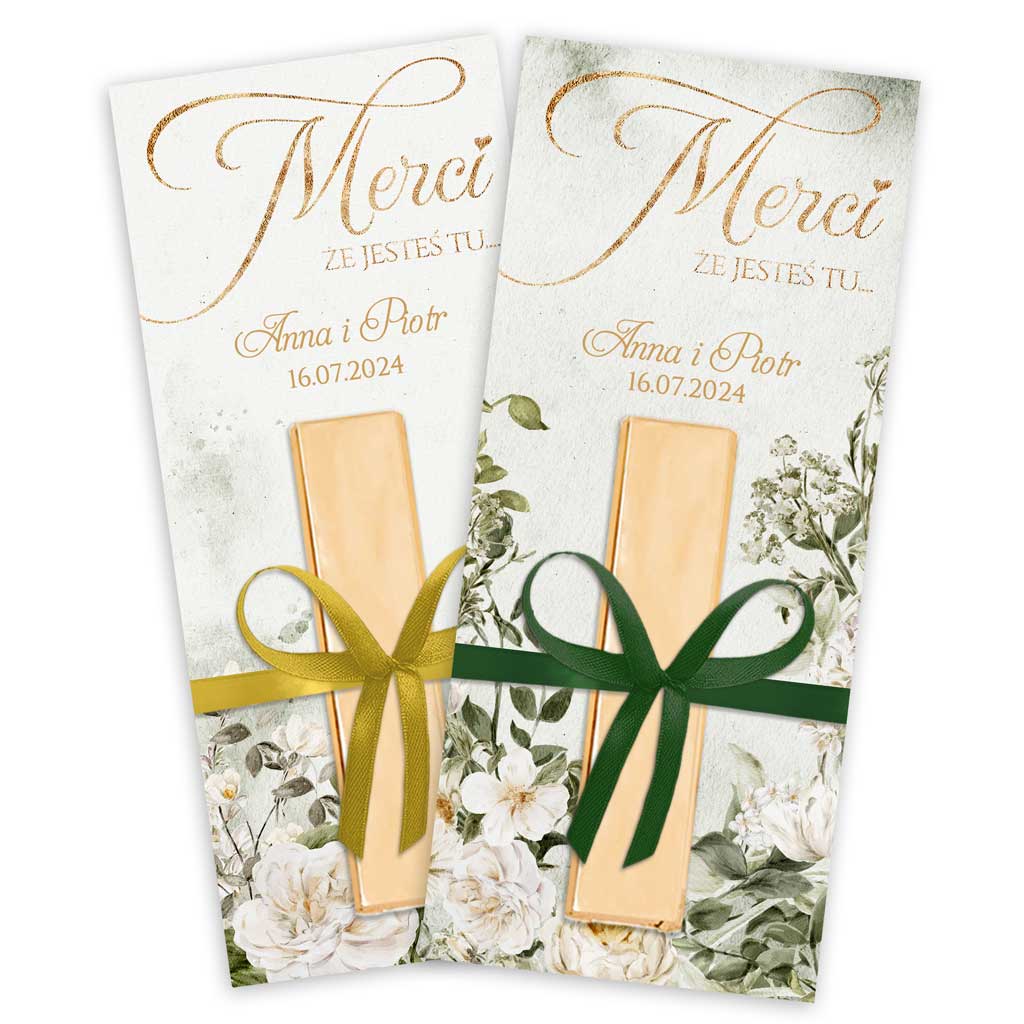 Wymiary podziękowania – 6 cm x 14 cm | komplet 2 podziękowań + wstążki | dowolna treść | zestaw nie zawiera czekoladki!