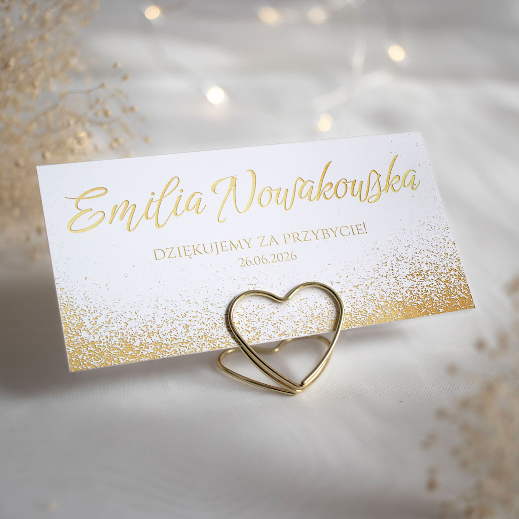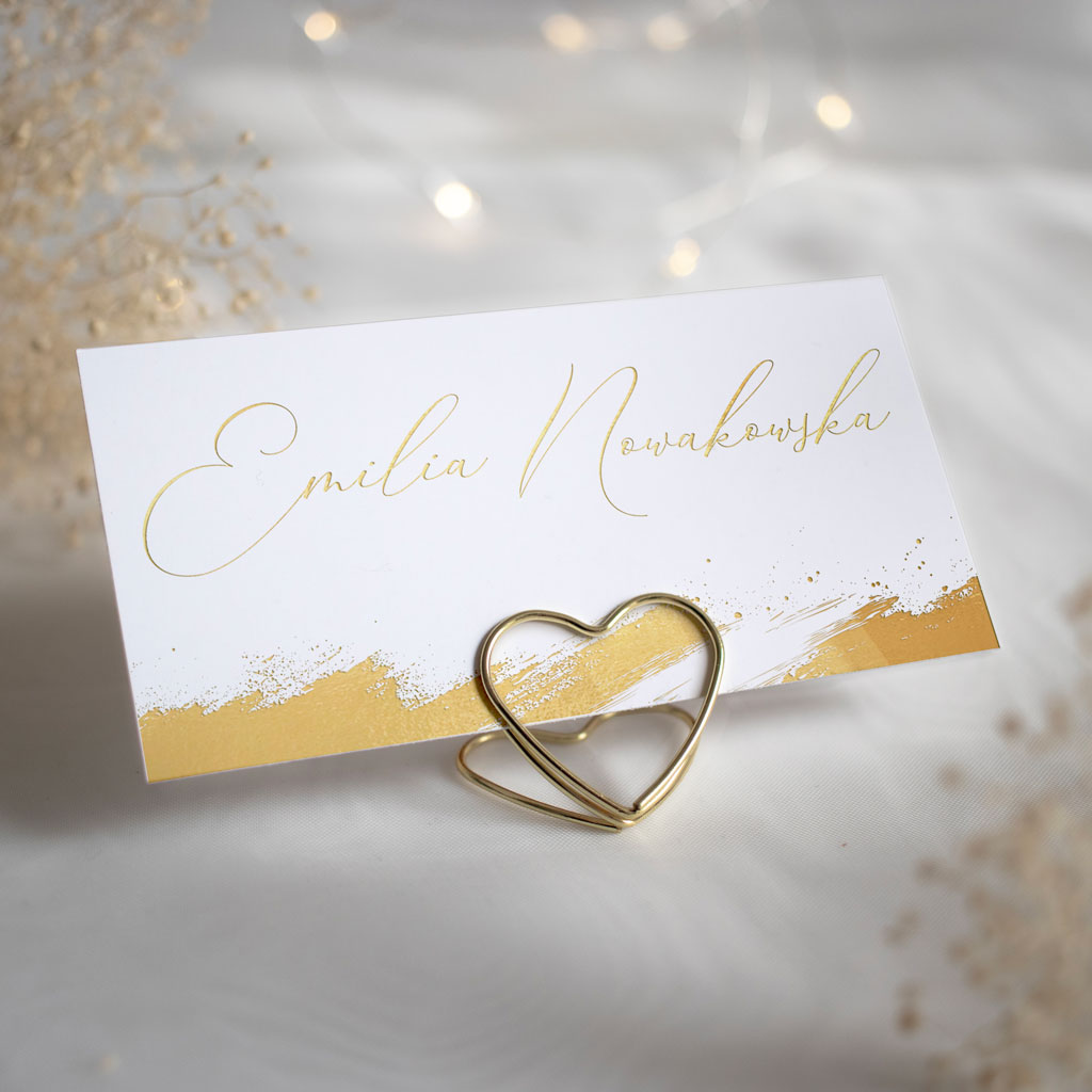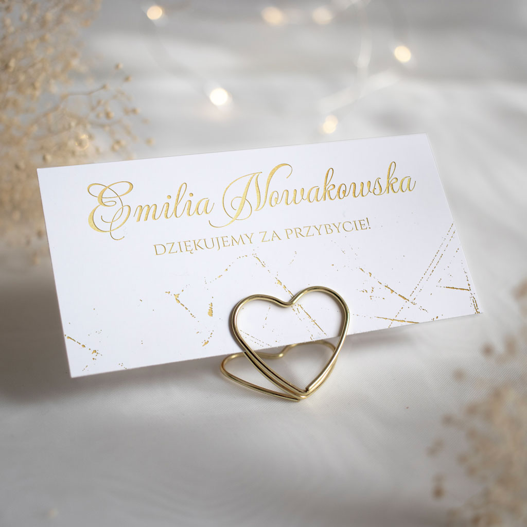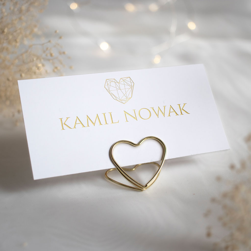 Złocone winietki ślubne to niezbędny dodatek na każdym stole weselnym. Dzięki nim goście z łatwością odnajdą swoje miejsce przy stole. Winietki są nie tylko ważnym elementem organizacyjnym, ale również doskonałym uzupełnieniem dekoracji na stole. Pojedyncza karteczka została umieszczona w subtelnym złotym stojaku w kształcie serca.