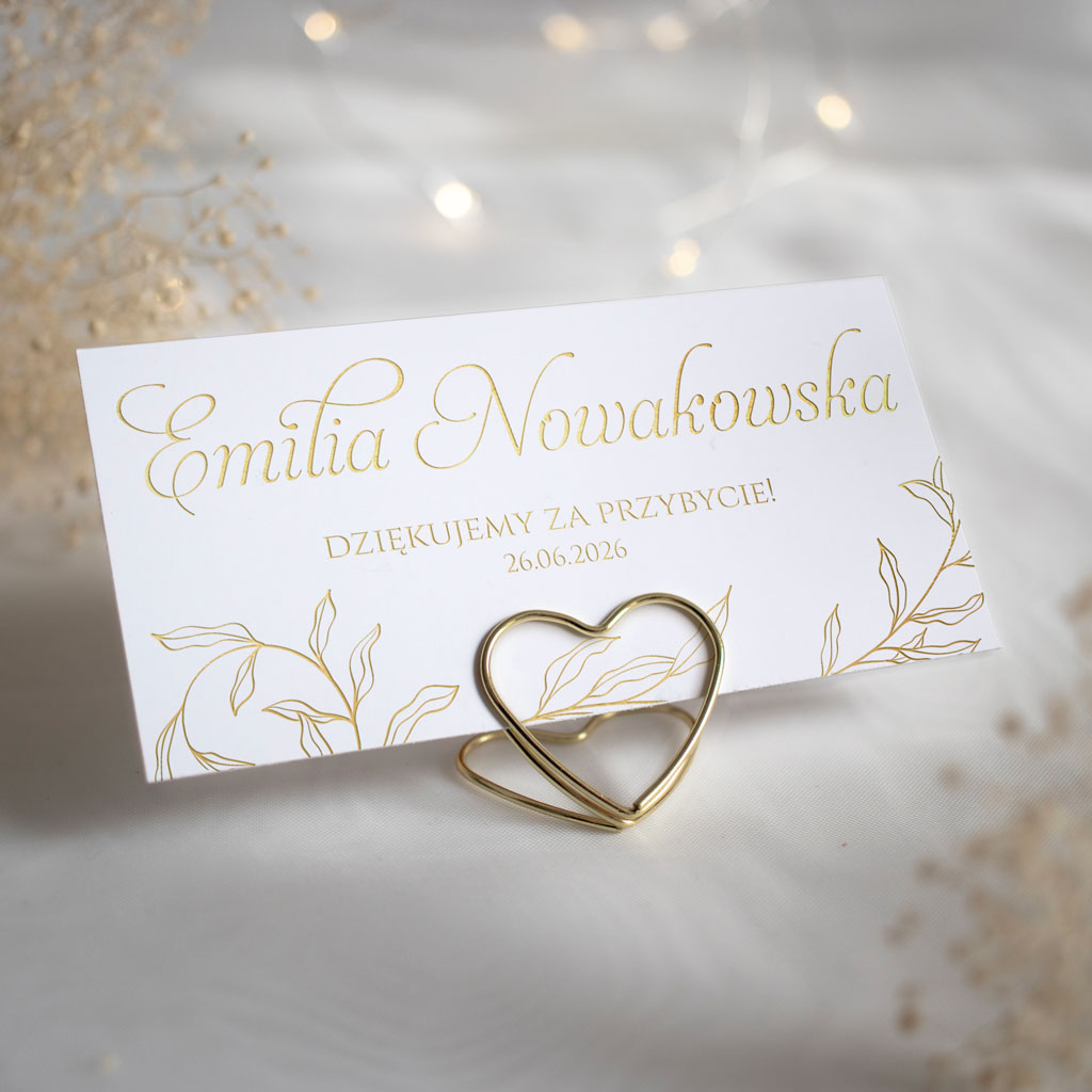 Wymiary winietki – ok. 10 cm x 5 cm | W zestawie stojak złote serduszko – wysokość ok. 2,5 cm |  Winietki pozłacane po wydruku (elementy do złocenia są na projekcie czarne)