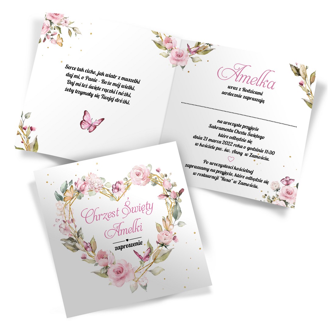 Zaproszenia na Chrzest Serce ze złotym sznurkiem i kopertą eko