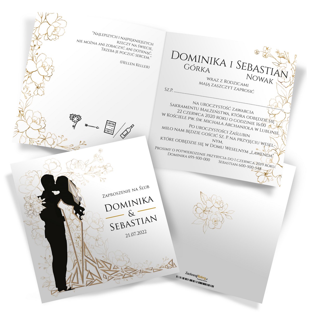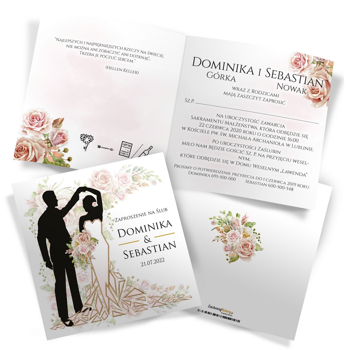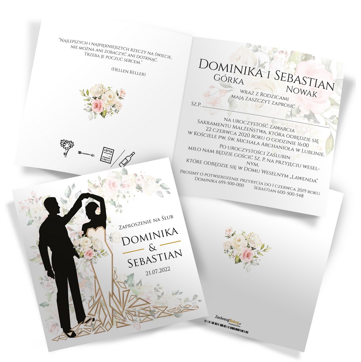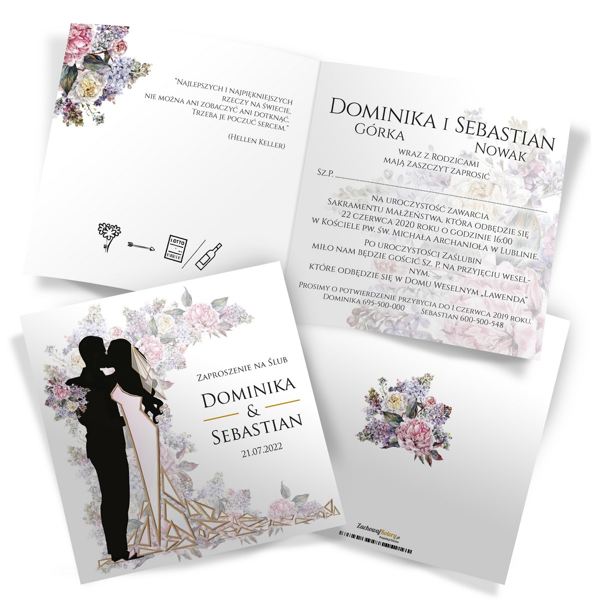 Zaproszenia ozdobione pięknym motywem kwiatów w różnych odsłonach kolorystycznych, które dodają im uroku i romantycznego klimatu. Na froncie znajduje się grafika Pary Młodej, z ozdobną suknią Panny Młodej. Treść na zaproszeniach jest całkowicie dowolna, możesz przygotować projekt na dowolną okazję.