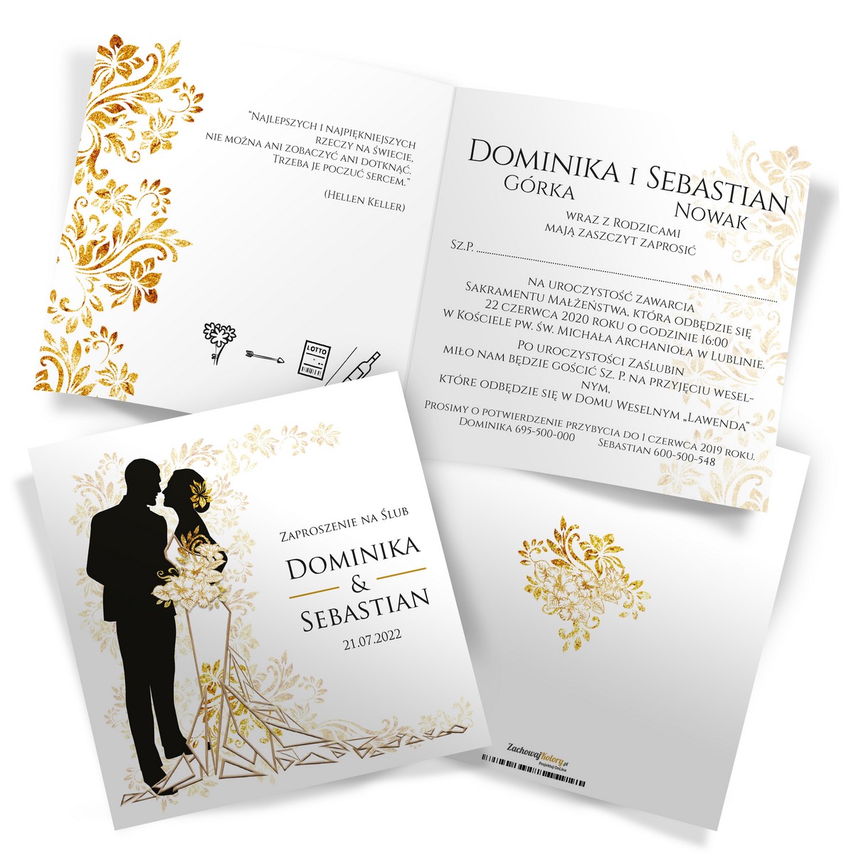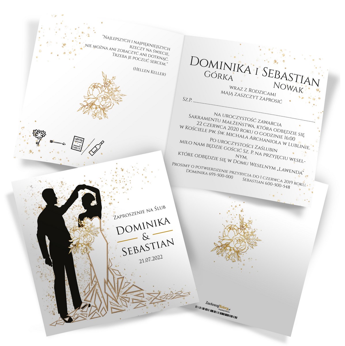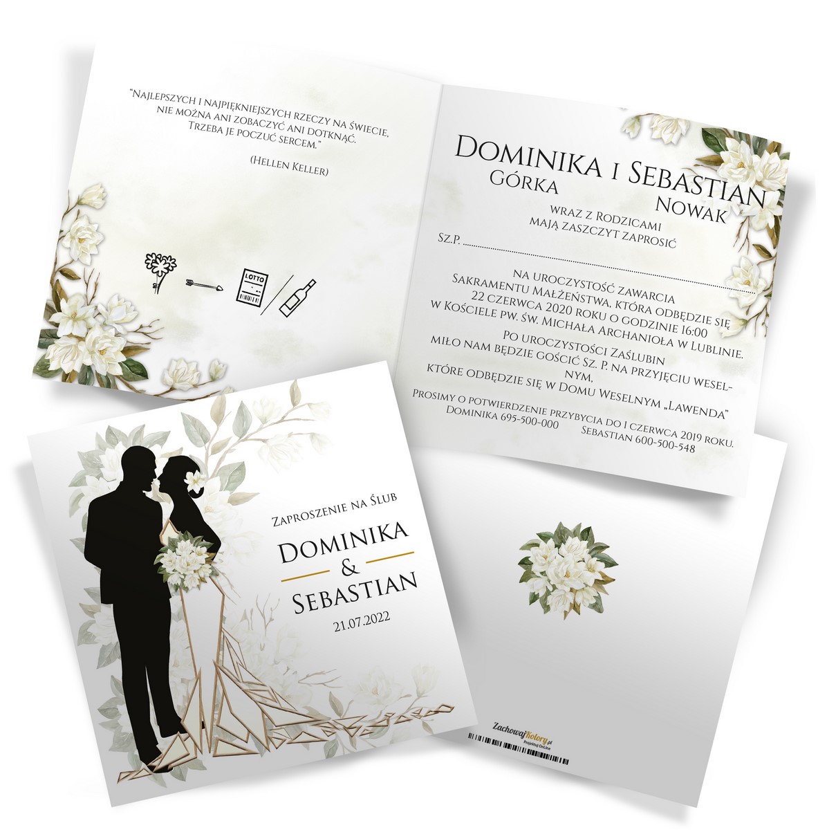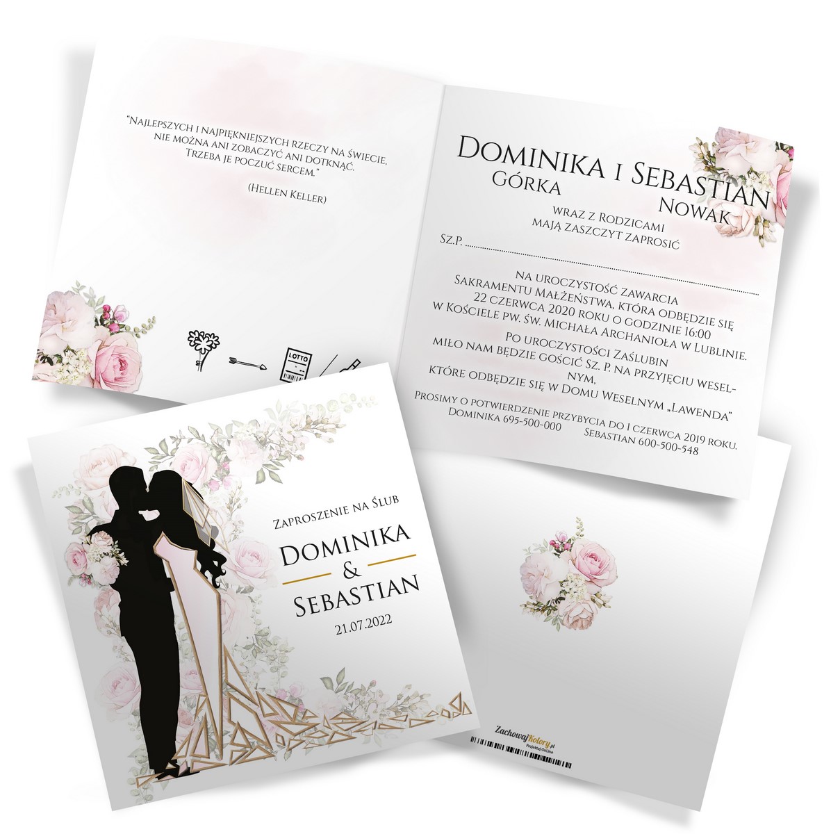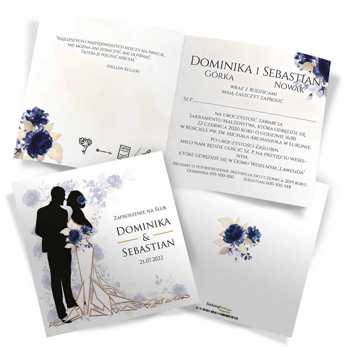 Zaproszenia ozdobione pięknym motywem kwiatów w różnych odsłonach kolorystycznych, które dodają im uroku i romantycznego klimatu. Na froncie znajduje się grafika Pary Młodej, z ozdobną suknią Panny Młodej. Treść na zaproszeniach jest całkowicie dowolna, możesz przygotować projekt na dowolną okazję.