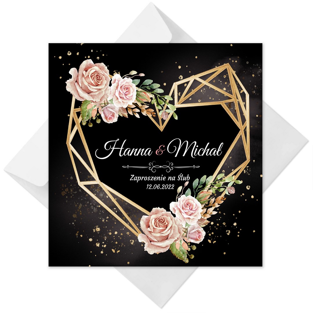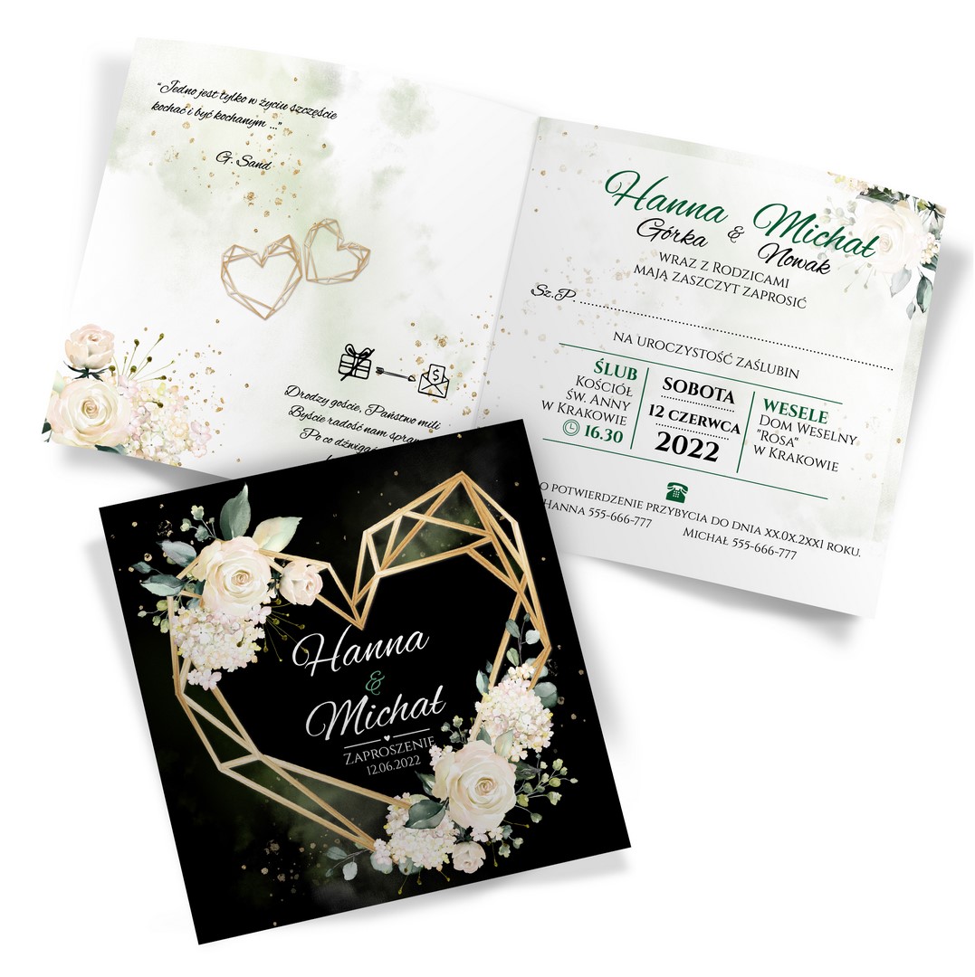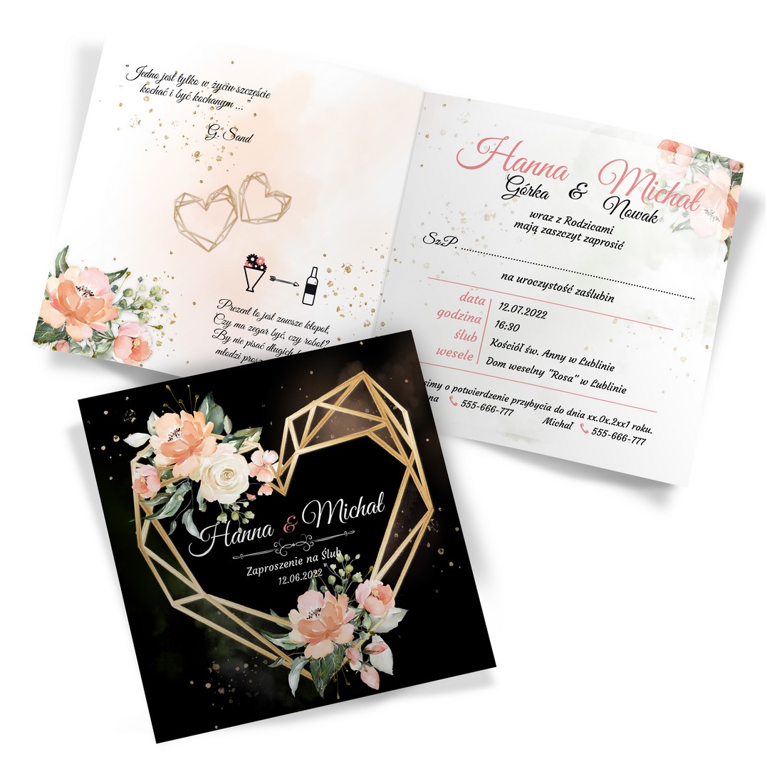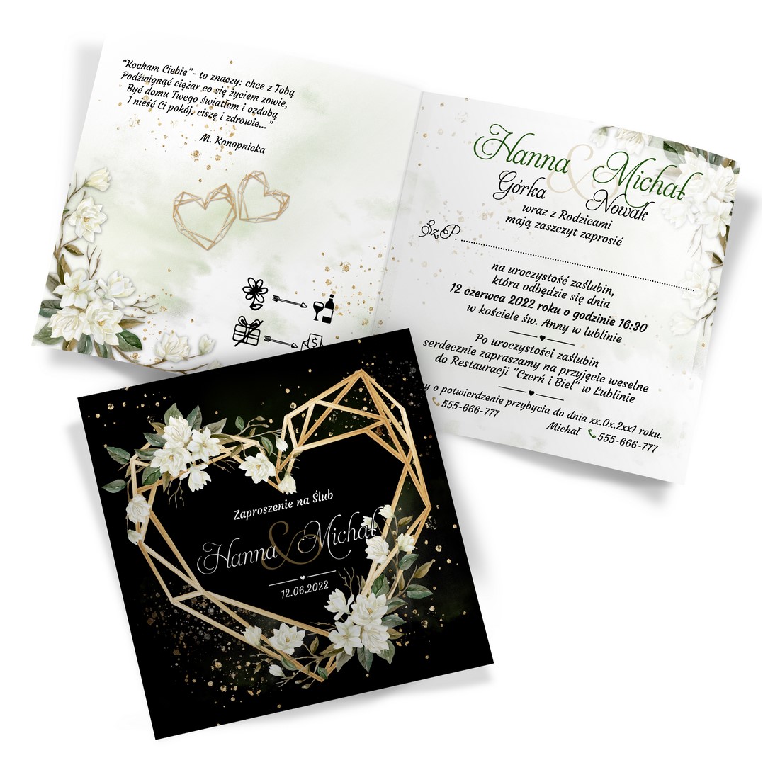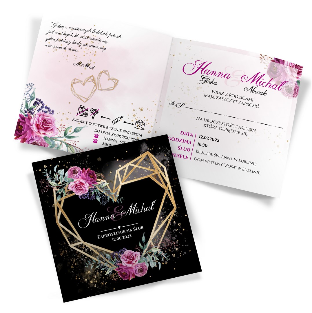 Dzięki szerokiej gamie eleganckich motywów kwiatowych do wyboru, z pewnością znajdziesz idealny projekt pasujący do Twojego wyjątkowego dnia. Ciemny przód dodaje zaproszeniu wyrafinowania, a jasne wnętrze zapewnia piękny kontrast. Na froncie kompozycje z geometrycznym sercem. Treść na zaproszeniach jest całkowicie dowolna, możesz przygotować projekt na dowolną okazję.