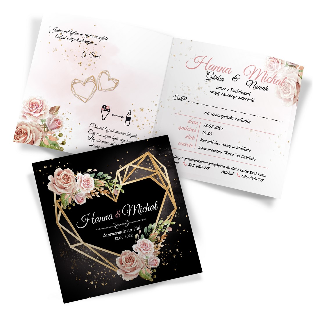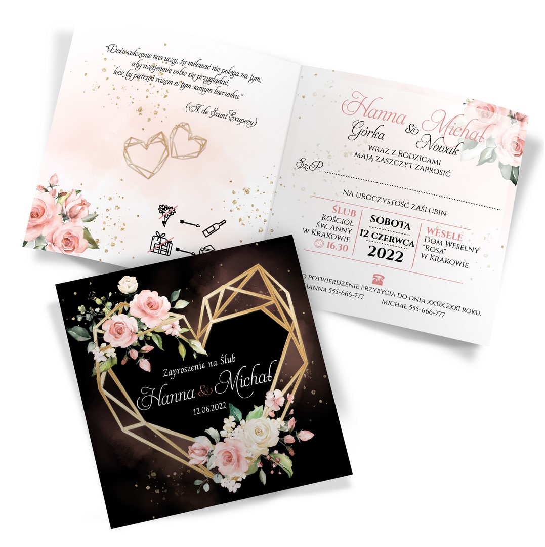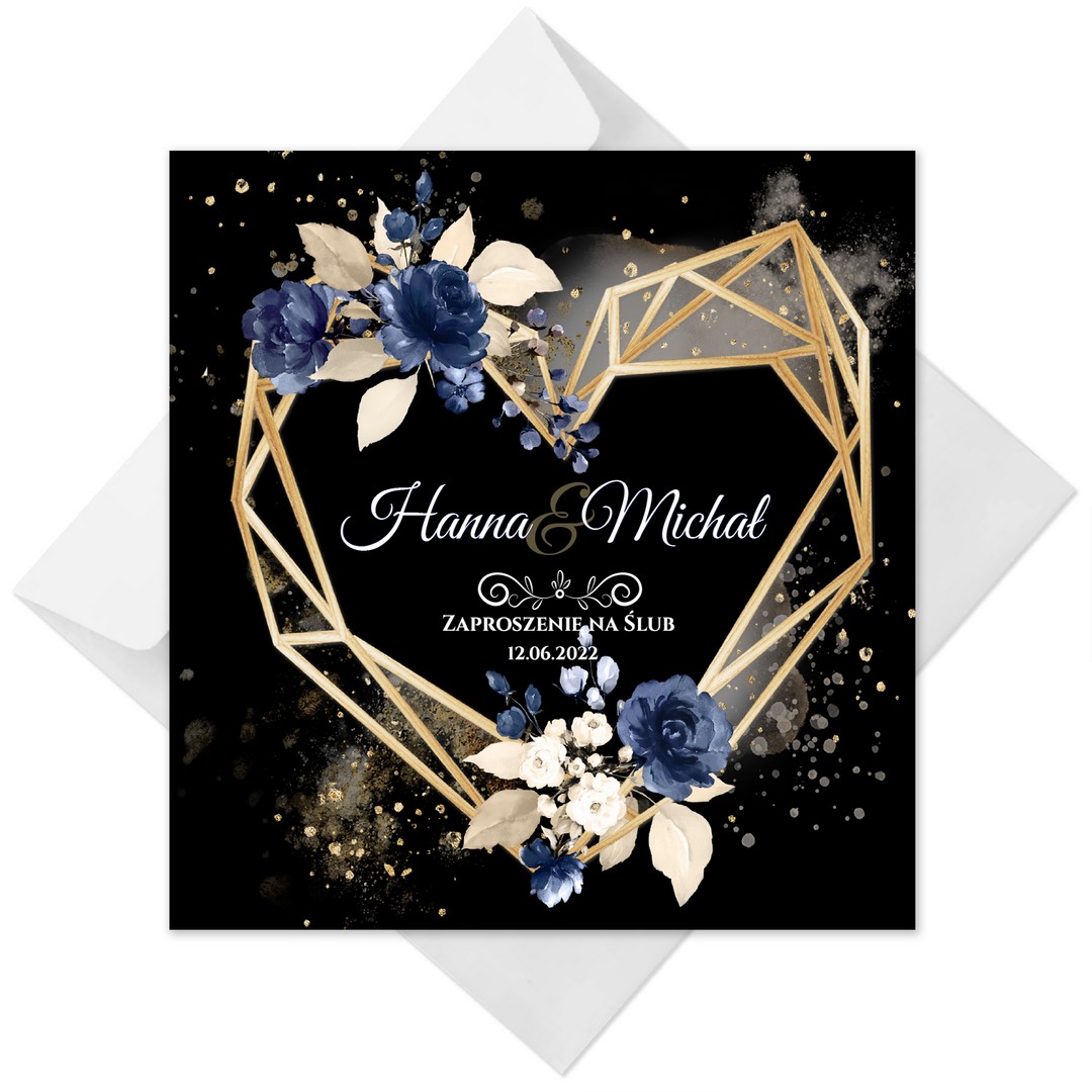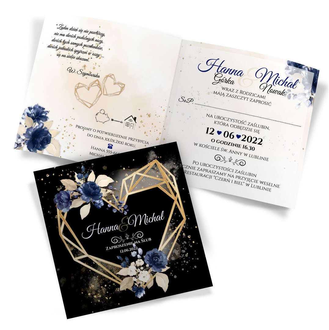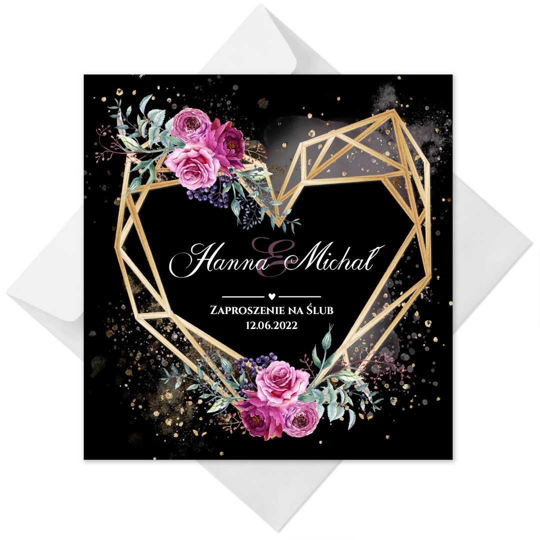Dzięki szerokiej gamie eleganckich motywów kwiatowych do wyboru, z pewnością znajdziesz idealny projekt pasujący do Twojego wyjątkowego dnia. Ciemny przód dodaje zaproszeniu wyrafinowania, a jasne wnętrze zapewnia piękny kontrast. Na froncie kompozycje z geometrycznym sercem. Treść na zaproszeniach jest całkowicie dowolna, możesz przygotować projekt na dowolną okazję.
