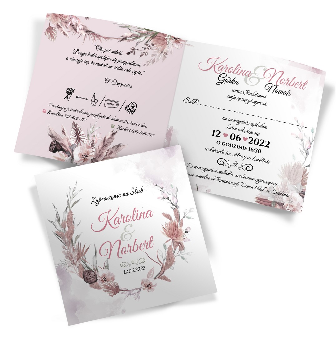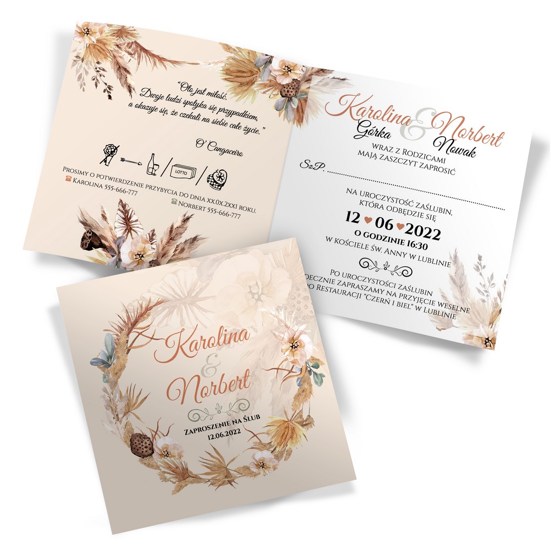 Zaproszenia ślubne w stylu boho dostępne w dwóch wariantach kolorystycznych – w odcieniach różu oraz beżu z roślinnymi motywami. Wysokiej jakości papier i stonowane kolory tworzą doskonałe połączenie, które zachwyci Twoich gości. Treść na zaproszeniach jest całkowicie dowolna, możesz przygotować projekt na dowolną okazję.