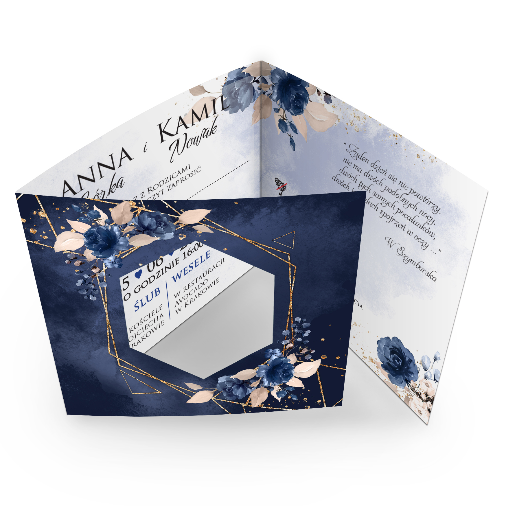 Wyjątkowe zaproszenia z dekoracyjnym wycięciem na froncie. Zaproszenia zaimponują gościom elegancką kolorystyką oraz wyjątkowymi motywami kwiatowymi. Niezależnie od tego, czy planujesz formalne przyjęcie, czy bardziej swobodną uroczystość, to zaproszenie jest idealnym sposobem, aby zaprosić swoich bliskich do dzielenia się radością. Treść na zaproszeniach jest całkowicie dowolna, możesz przygotować projekt na dowolną okazję.
