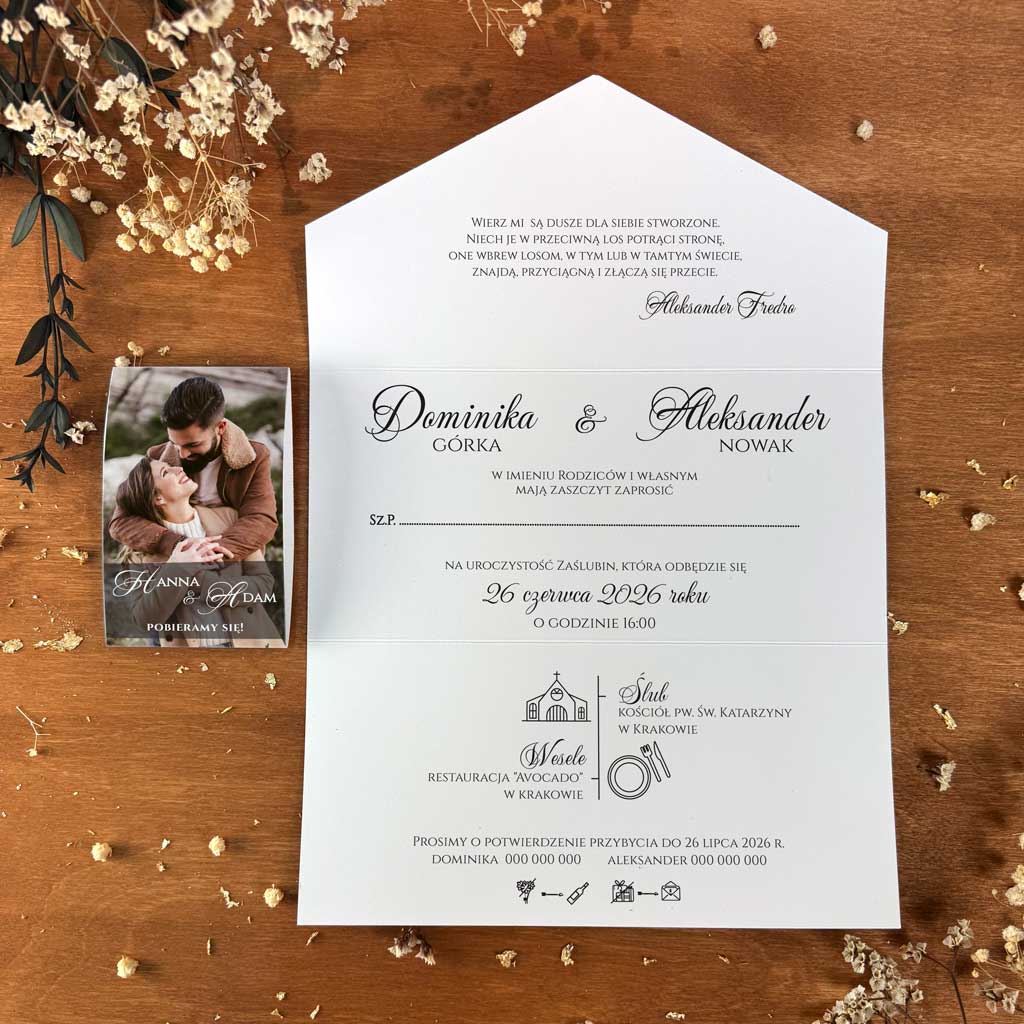 Wyjątkowa kolekcja zaproszeń w formacie DL z opaską ze zdjęciem.  Treść na zaproszeniach jest całkowicie dowolna, możesz przygotować projekt na dowolną okazję.