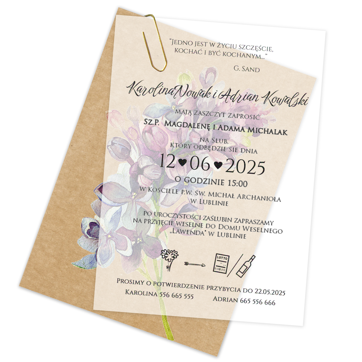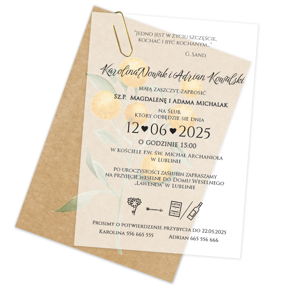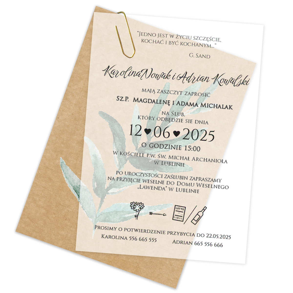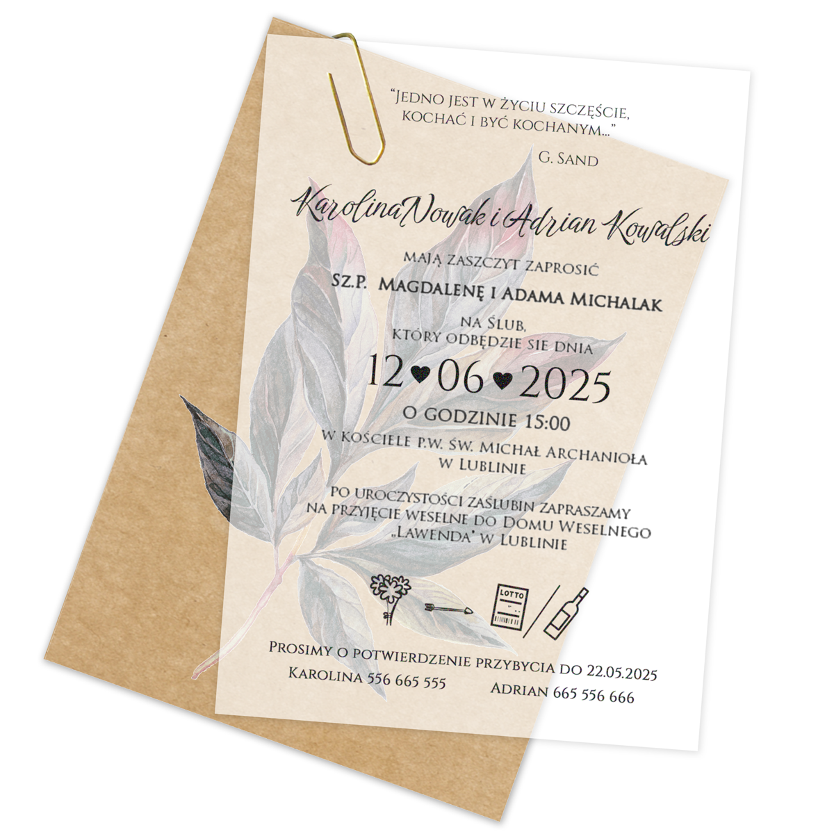 Zaproszenie ślubne w formie kartek A6 to idealny wybór dla par, które chcą zaprosić swoich gości w oryginalny sposób. Spinane złotym spinaczem, prezentują się bardzo elegancko i stylowo. Jedna z kartek to ozdobna kalka, która dodaje całości niepowtarzalnego charakteru.