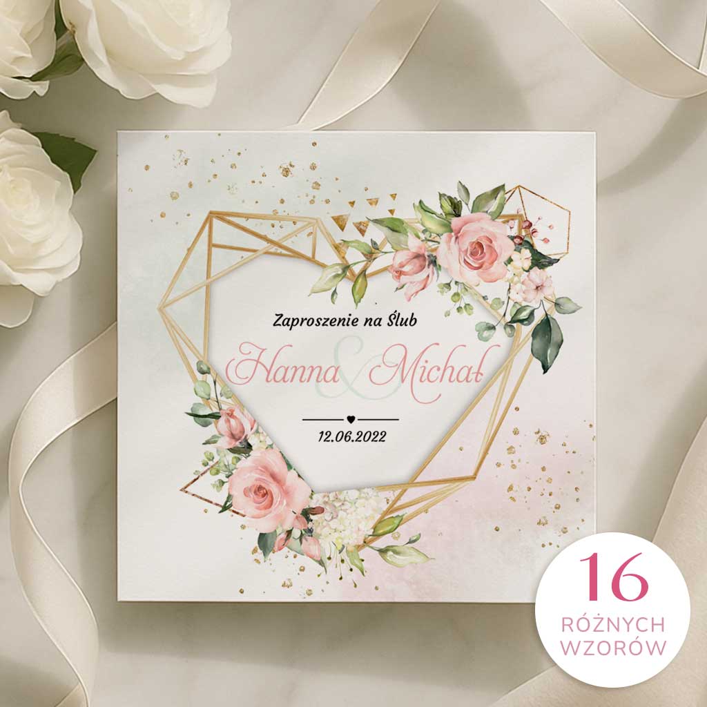 Delikatna kolekcja zaproszeń zawierająca piękne kwiatowe kompozycje w połączeniu z geometrycznym sercem na froncie. Dzięki szerokiej gamie kolorów do wyboru, z pewnością znajdziesz idealny wzór dopasowany do Twojego motywu ślubnego. Treść na zaproszeniach jest całkowicie dowolna, możesz przygotować projekt na dowolną okazję.