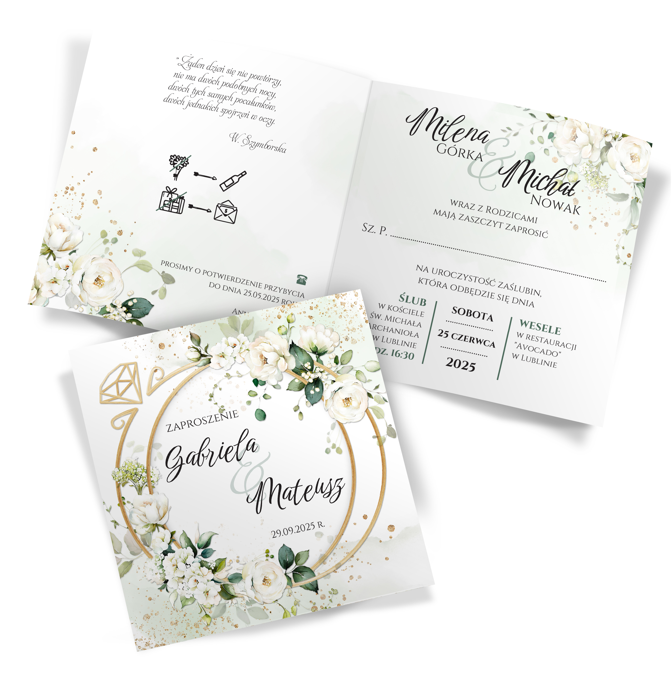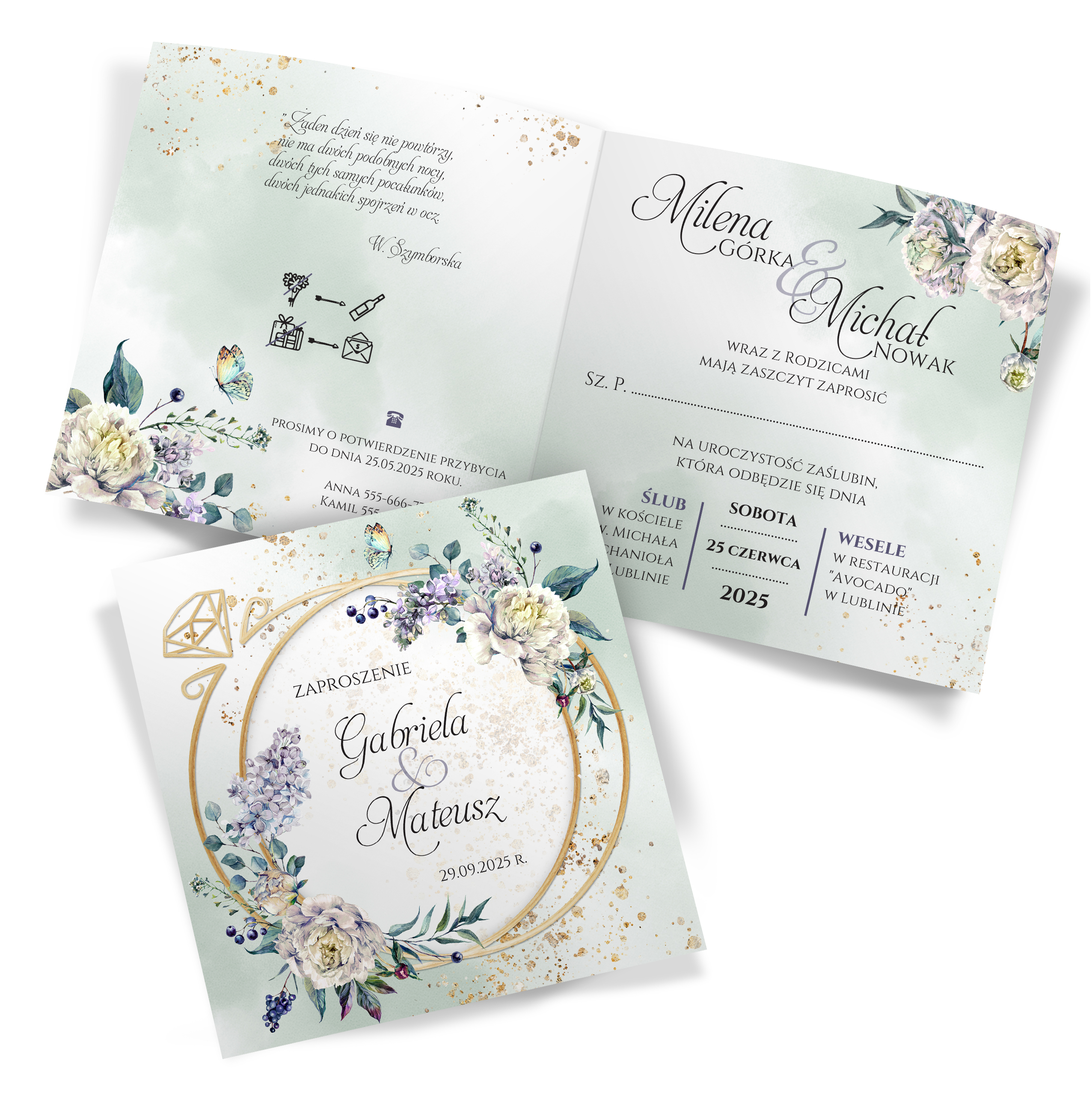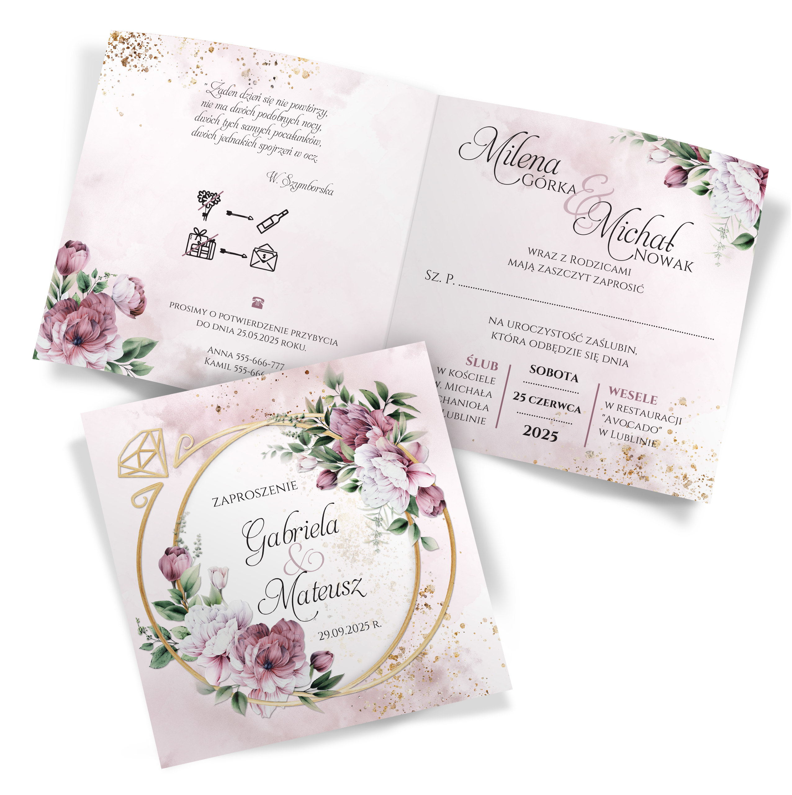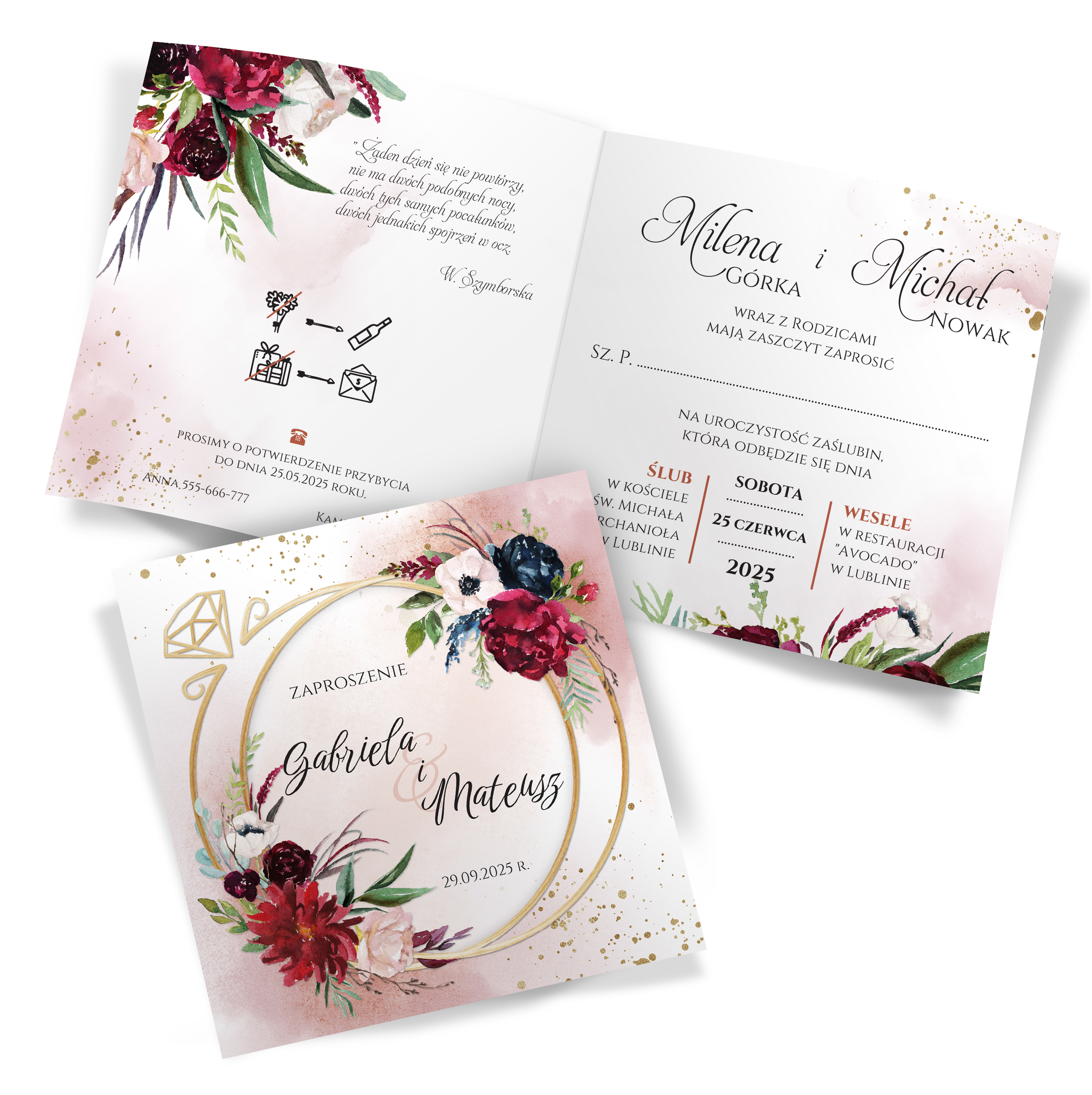Zaproszenia dostępne w wielu kolorach, z motywem obrączki na froncie oraz pięknymi kwiatowymi kompozycjami. To idealny wybór dla par, które chcą zaprosić swoich gości w wyjątkowy sposób. Nasycone kolory dodają zaproszeniom elegancji. Treść na zaproszeniach jest całkowicie dowolna, możesz przygotować projekt na dowolną okazję.