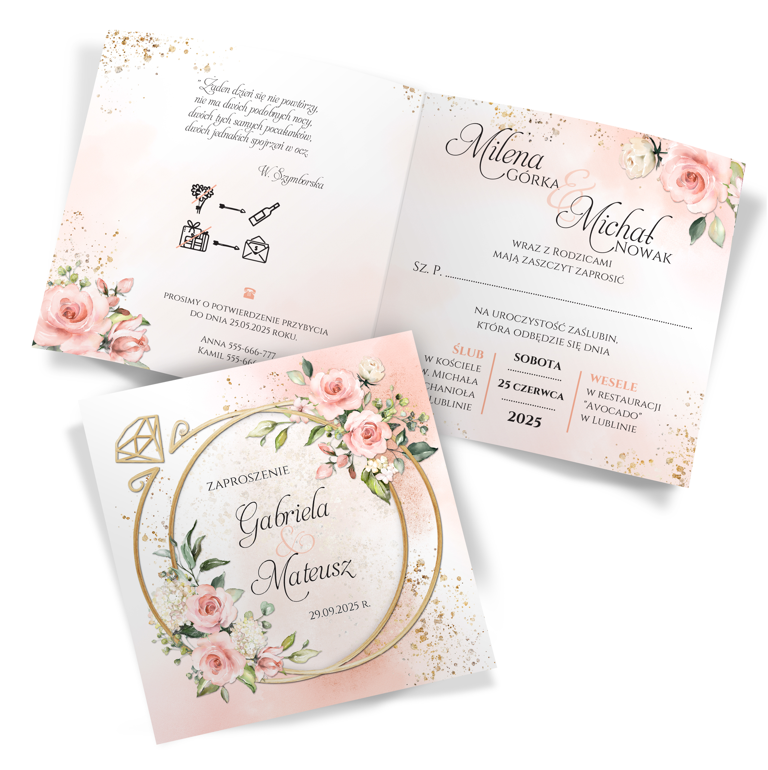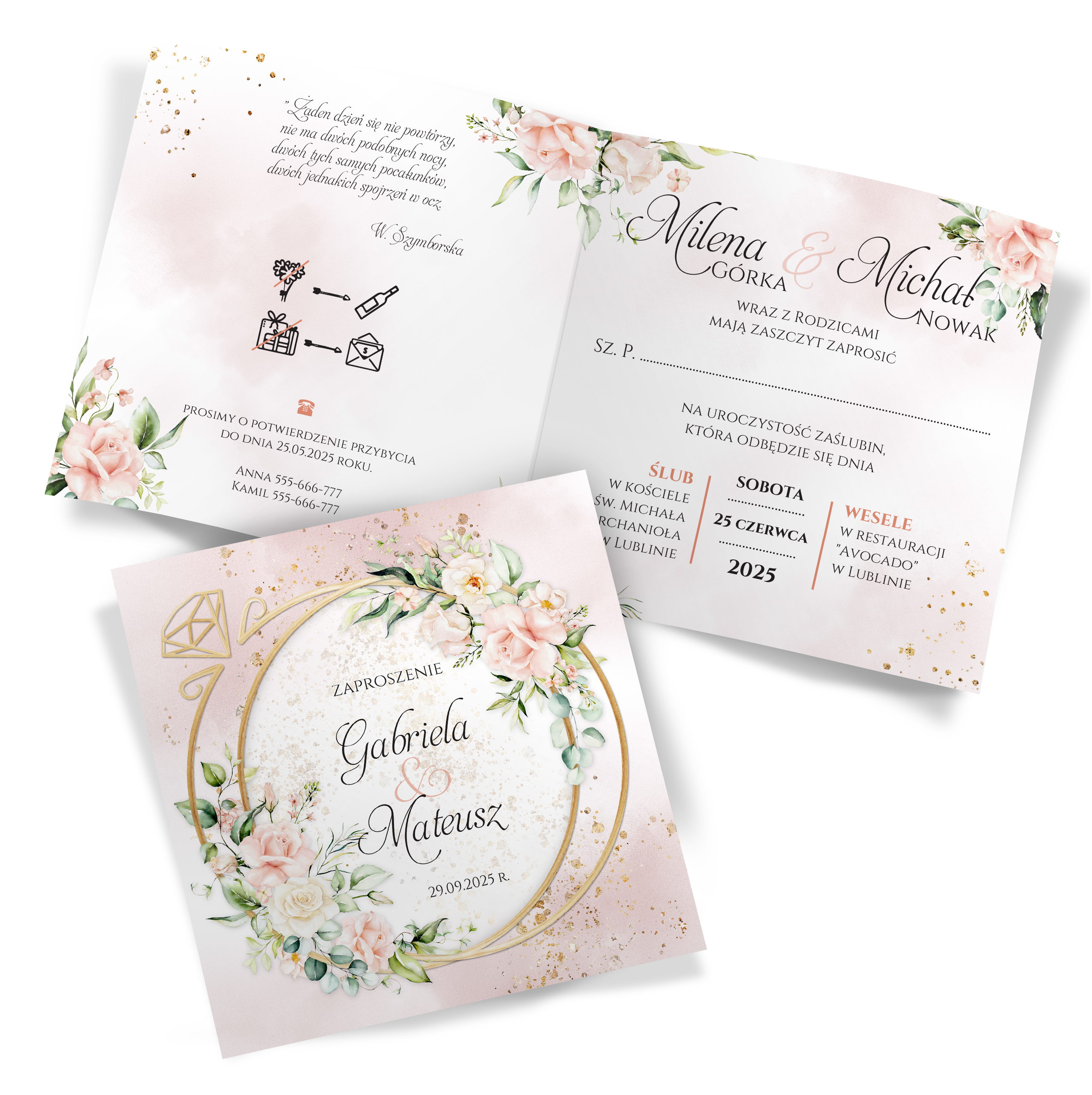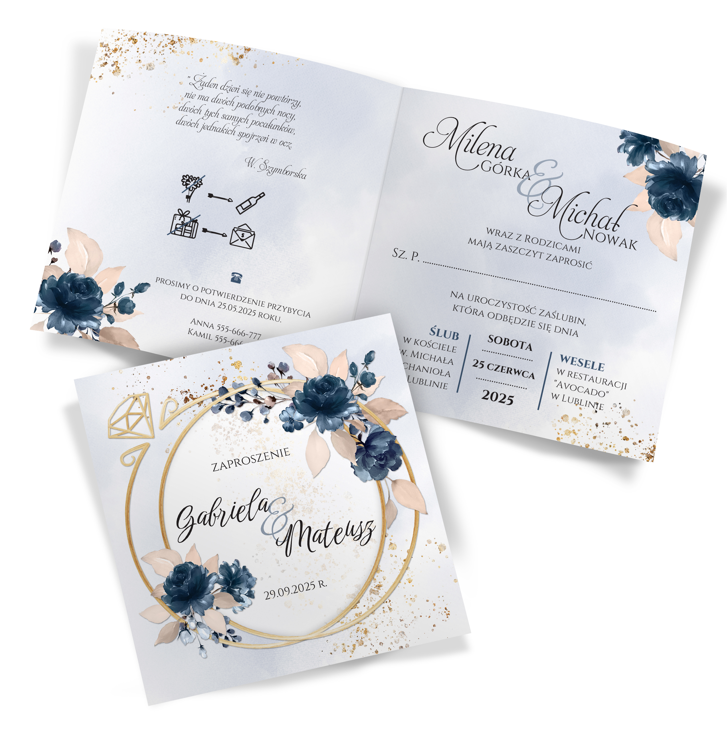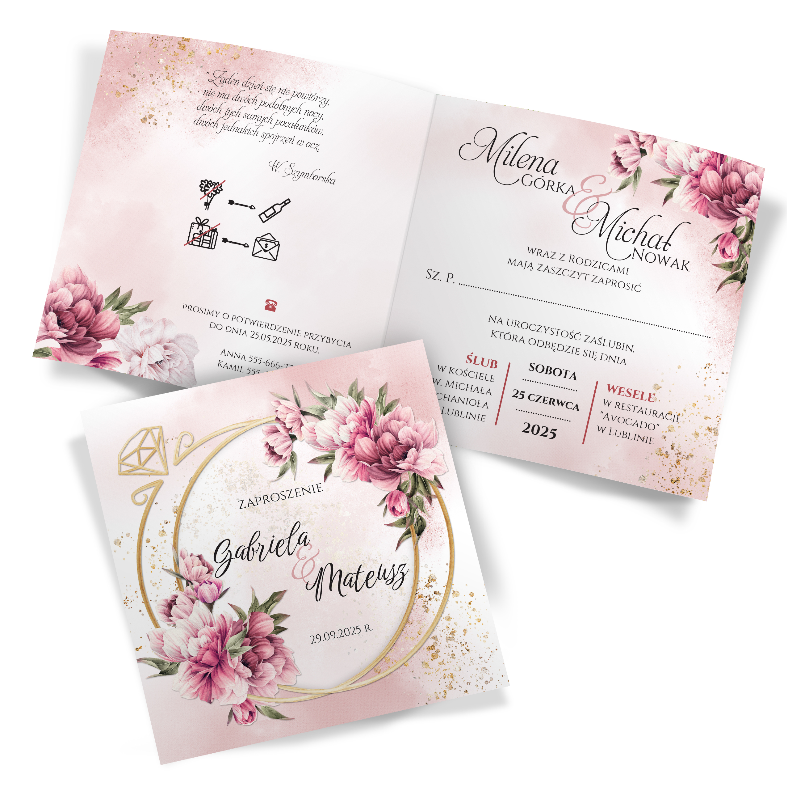 Zaproszenia dostępne w wielu kolorach, z motywem obrączki na froncie oraz pięknymi kwiatowymi kompozycjami. To idealny wybór dla par, które chcą zaprosić swoich gości w wyjątkowy sposób. Nasycone kolory dodają zaproszeniom elegancji. Treść na zaproszeniach jest całkowicie dowolna, możesz przygotować projekt na dowolną okazję.