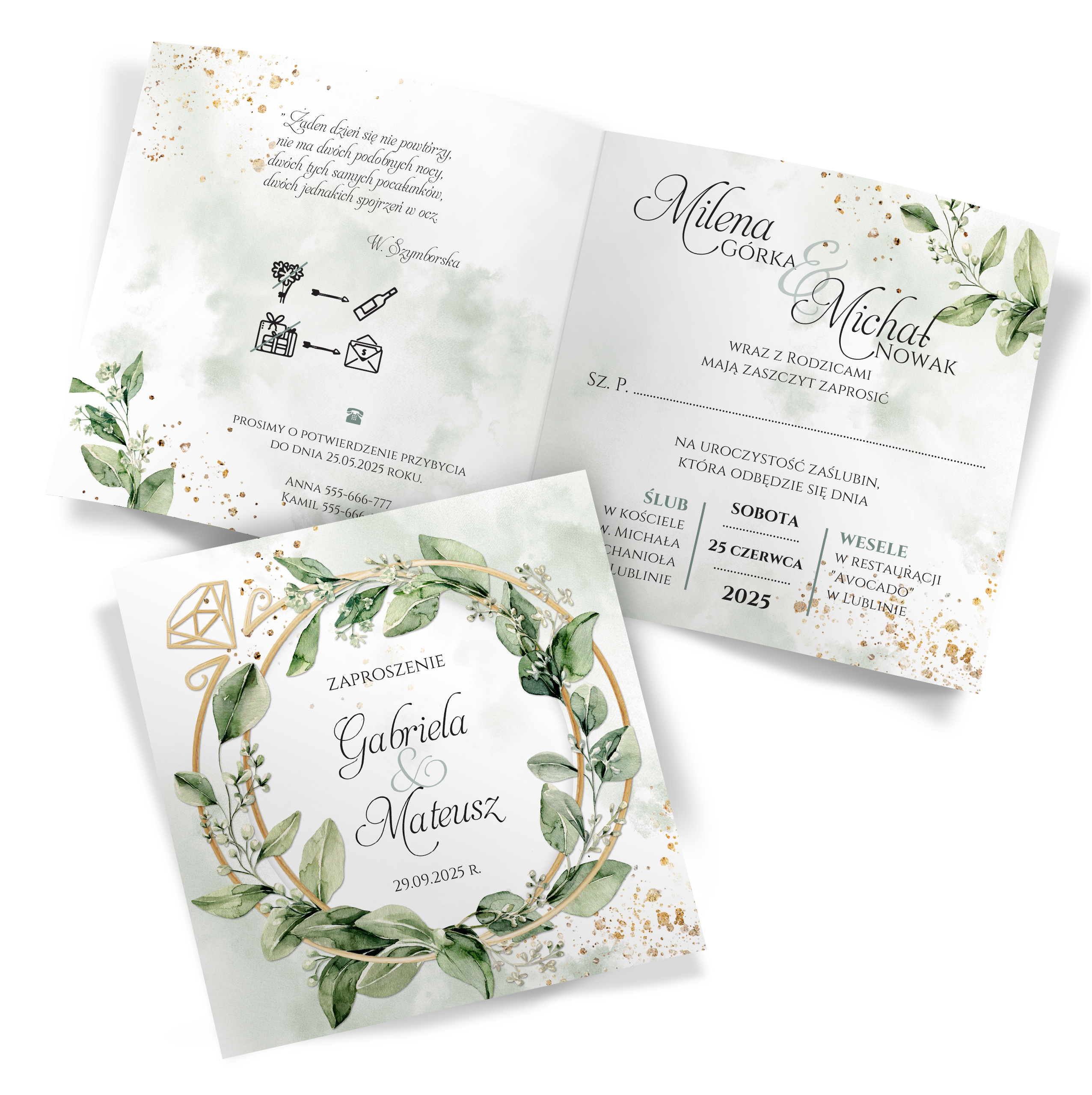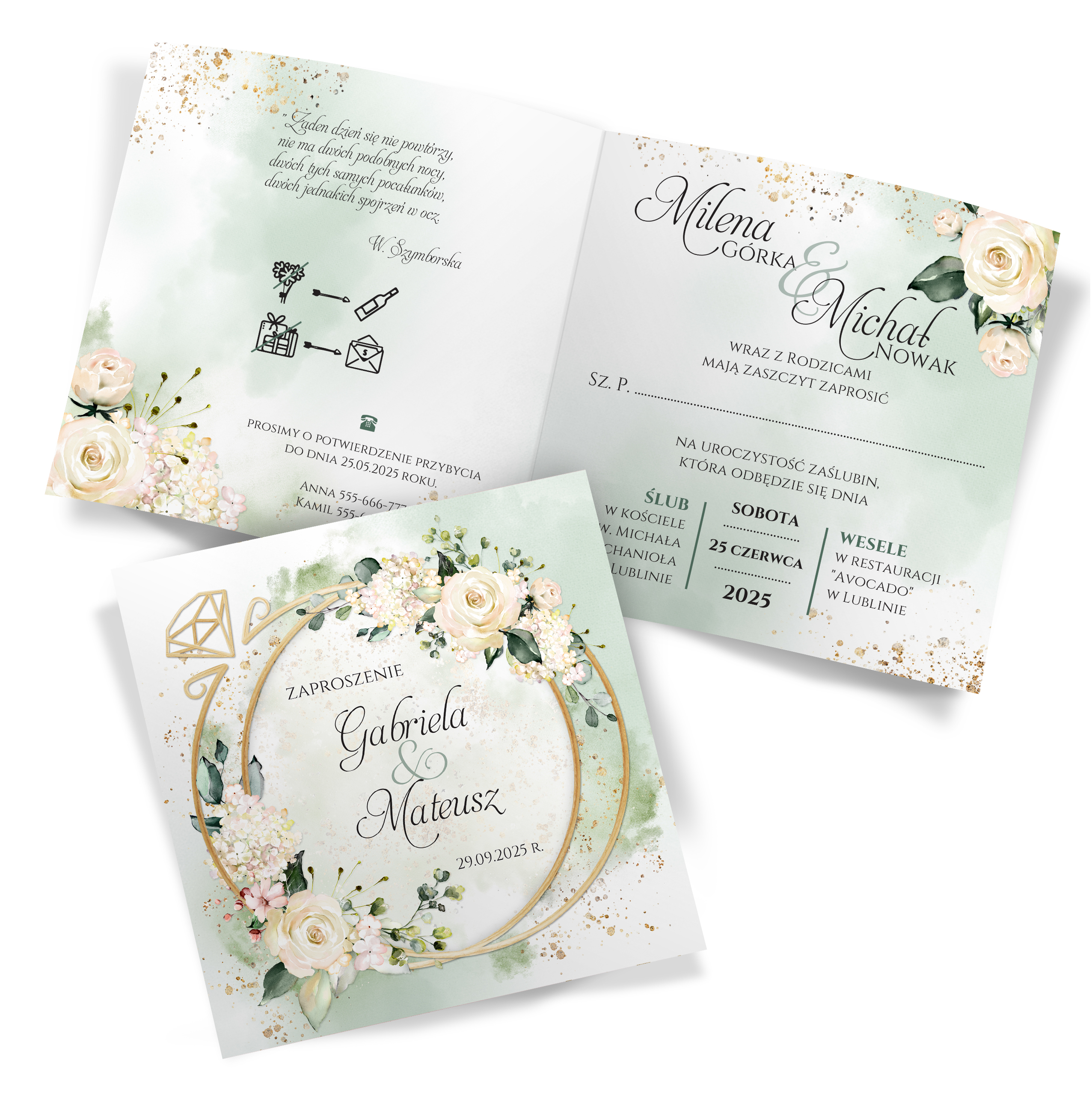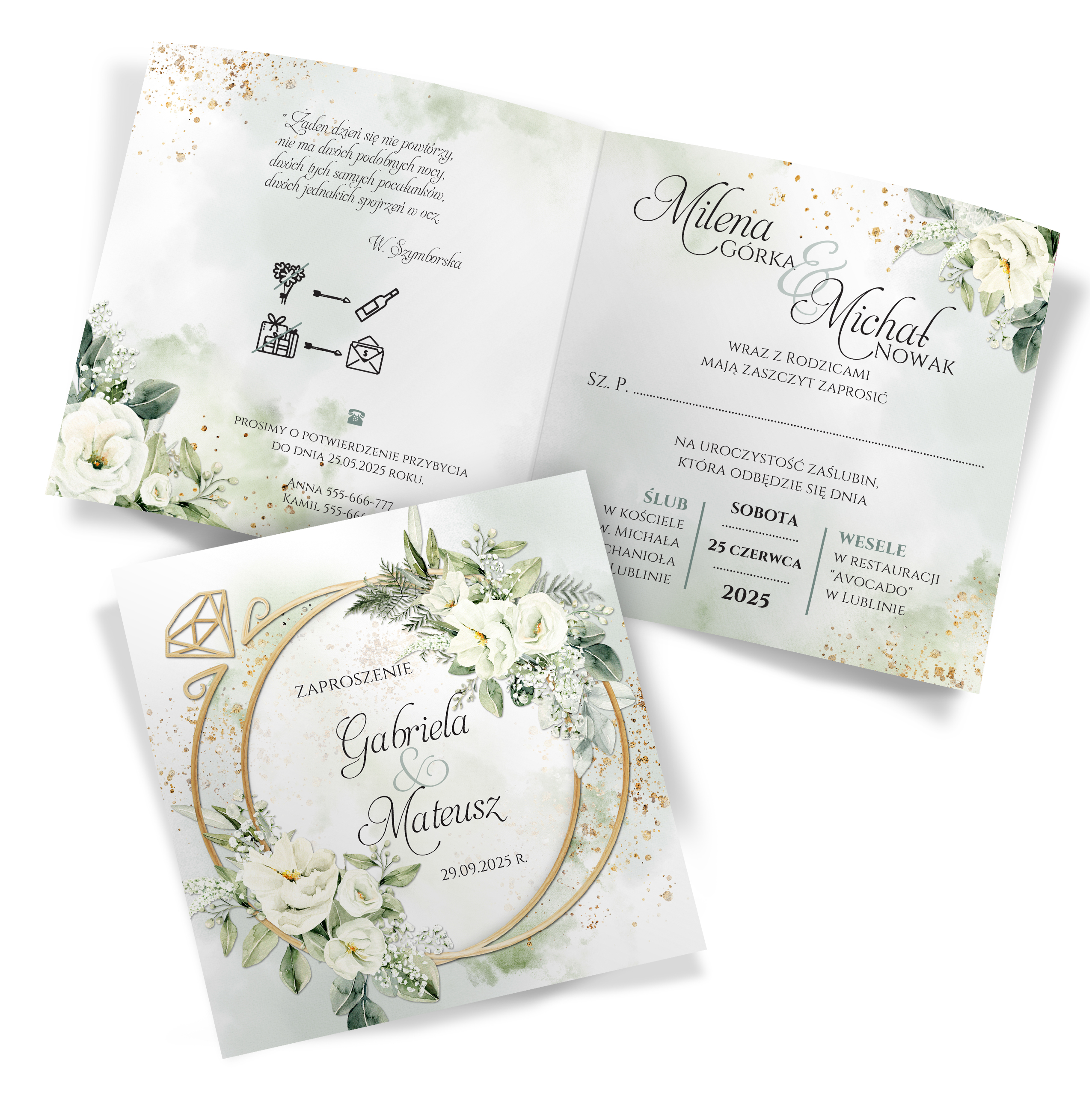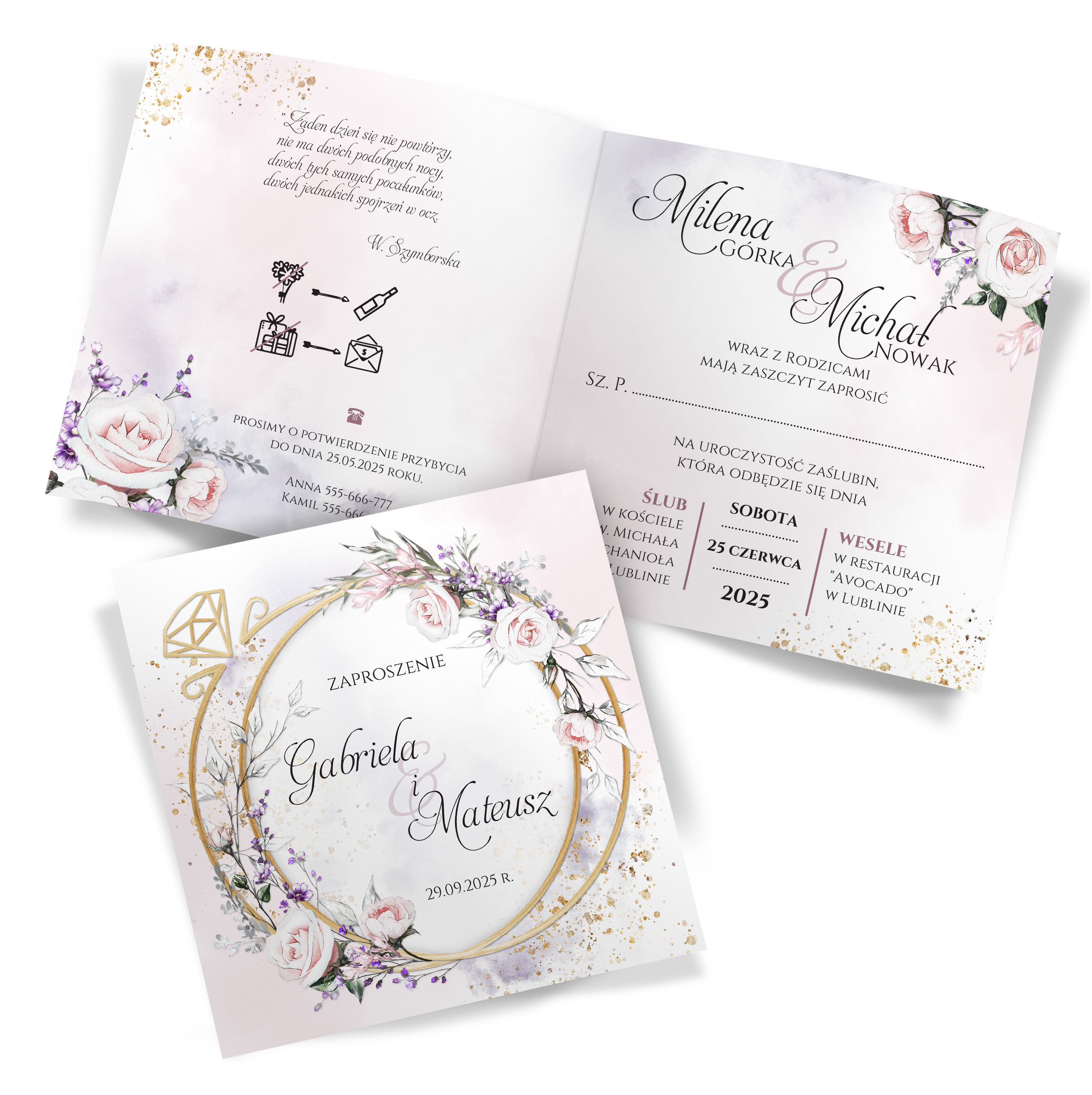 Zaproszenia dostępne w wielu kolorach, z motywem obrączki na froncie oraz pięknymi kwiatowymi kompozycjami. To idealny wybór dla par, które chcą zaprosić swoich gości w wyjątkowy sposób. Nasycone kolory dodają zaproszeniom elegancji. Treść na zaproszeniach jest całkowicie dowolna, możesz przygotować projekt na dowolną okazję.