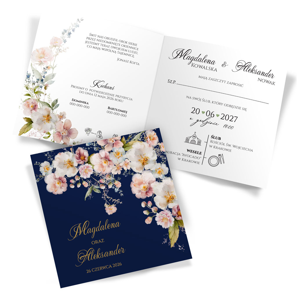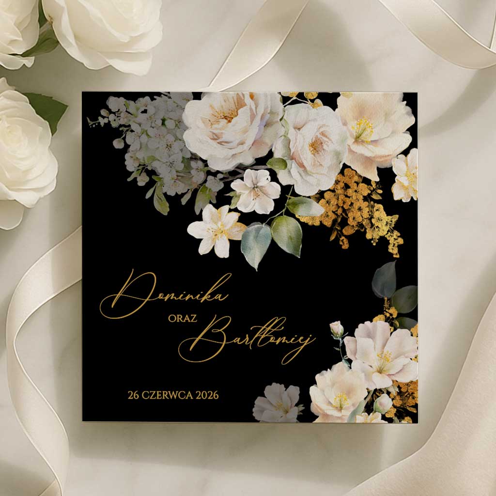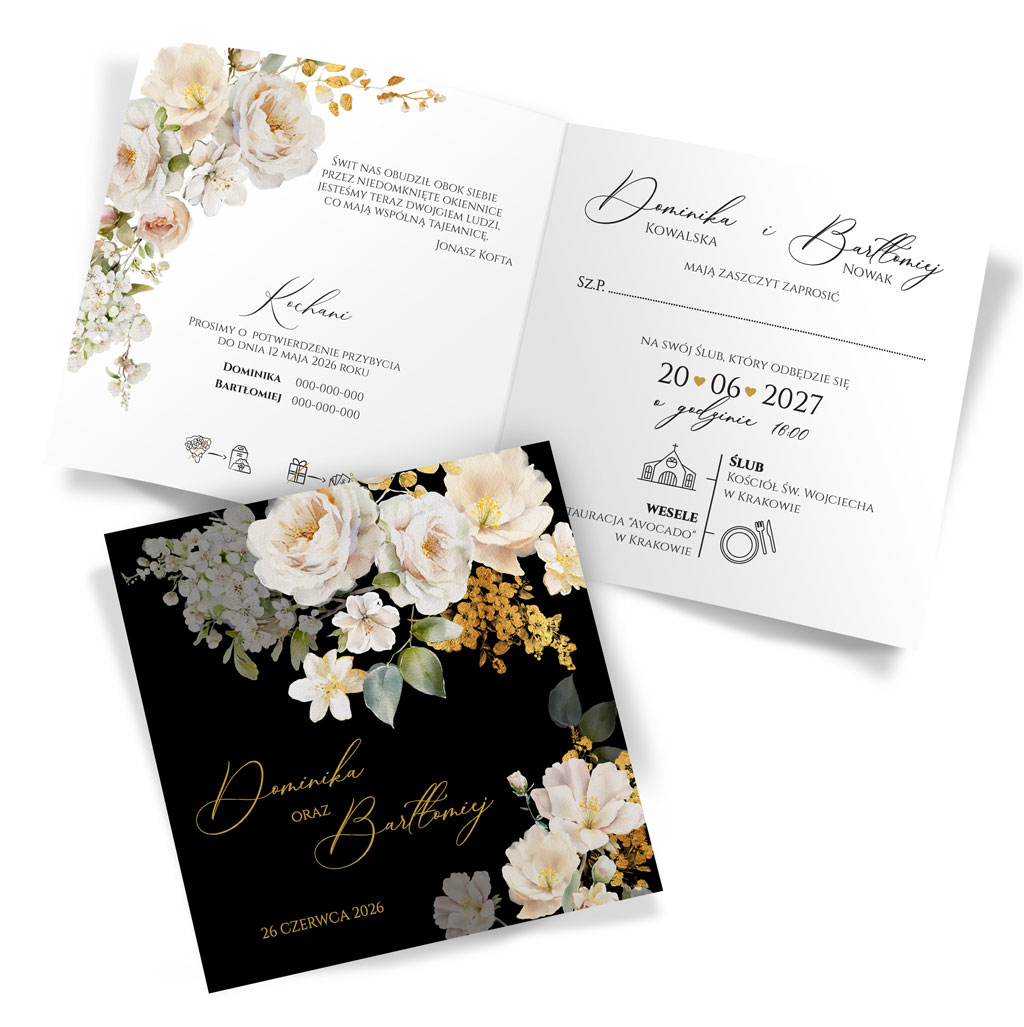 Dzięki szerokiej gamie eleganckich motywów kwiatowych do wyboru, z pewnością znajdziesz idealny projekt pasujący do Twojego wyjątkowego dnia. Ciemny przód dodaje zaproszeniu wyrafinowania, a jasne wnętrze zapewnia piękny kontrast. Na froncie kompozycje z geometrycznym sercem. Treść na zaproszeniach jest całkowicie dowolna, możesz przygotować projekt na dowolną okazję.