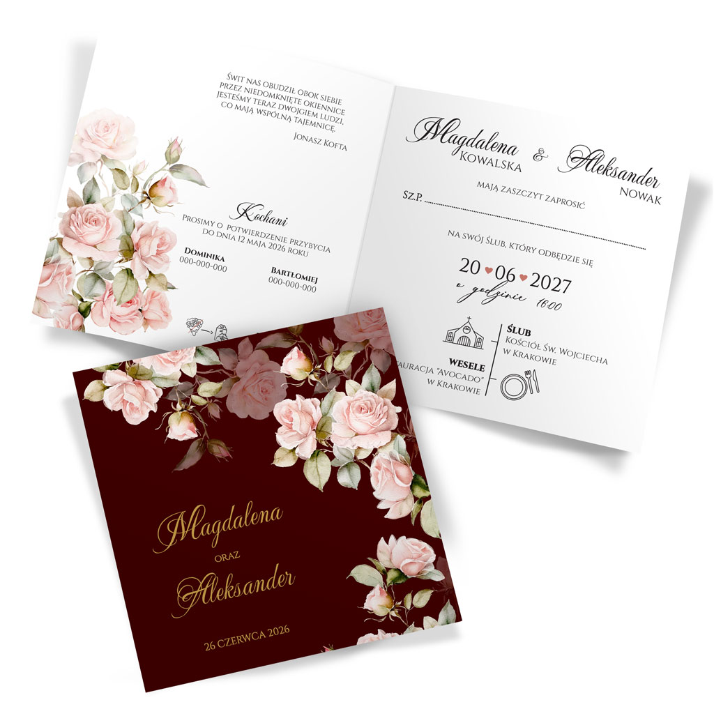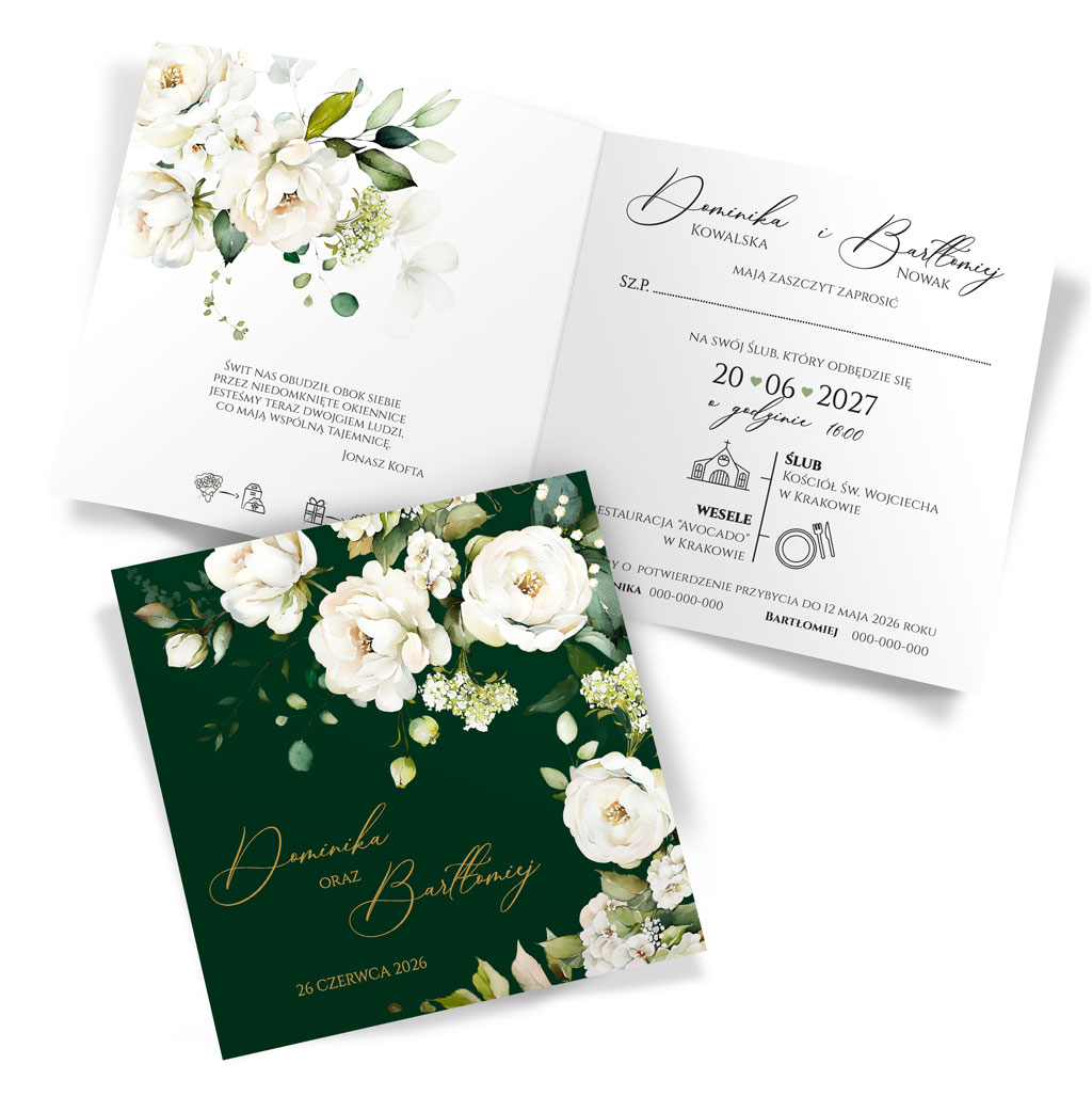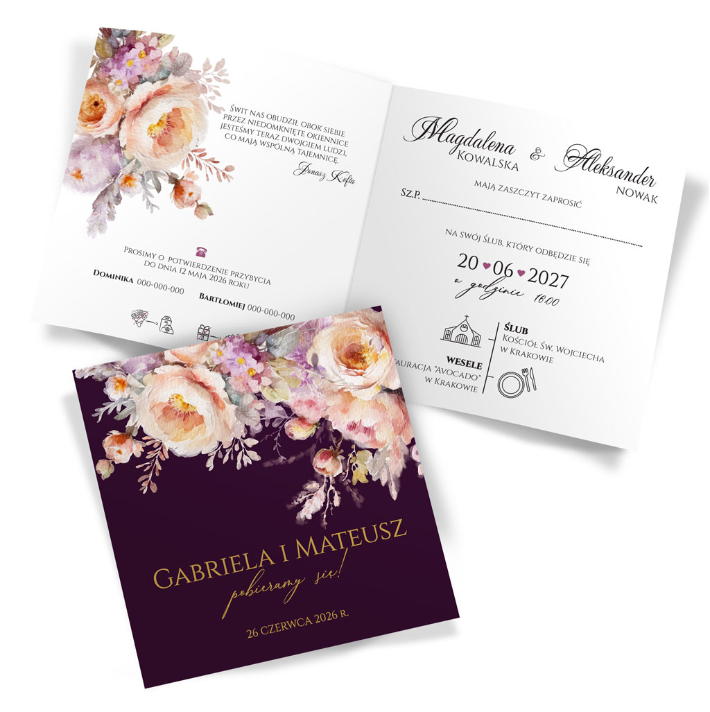 Dzięki szerokiej gamie eleganckich motywów kwiatowych do wyboru, z pewnością znajdziesz idealny projekt pasujący do Twojego wyjątkowego dnia. Ciemny przód dodaje zaproszeniu wyrafinowania, a jasne wnętrze zapewnia piękny kontrast. Na froncie kompozycje z geometrycznym sercem. Treść na zaproszeniach jest całkowicie dowolna, możesz przygotować projekt na dowolną okazję.