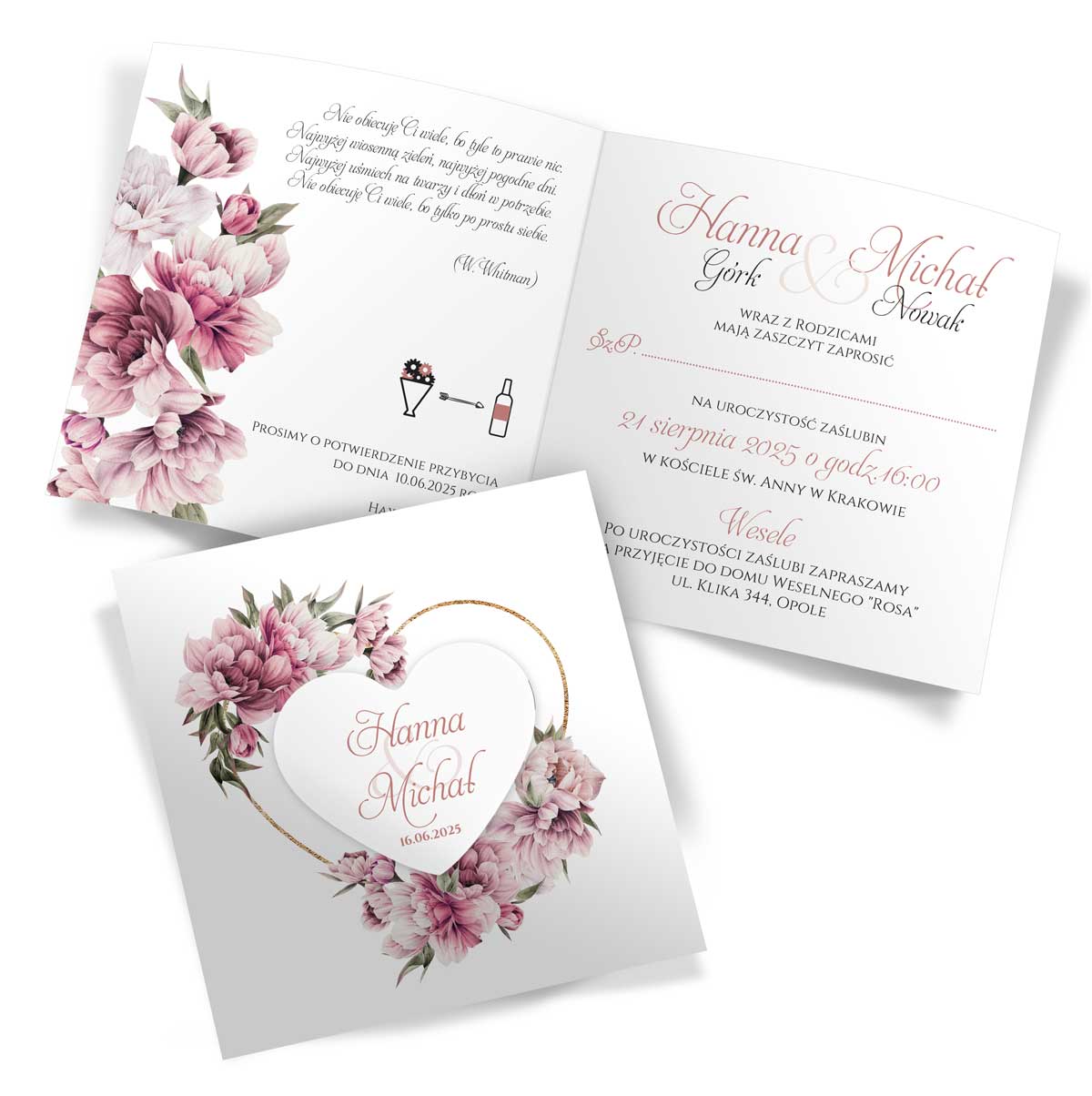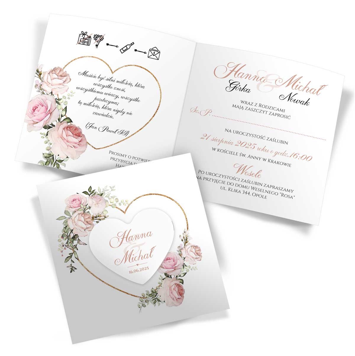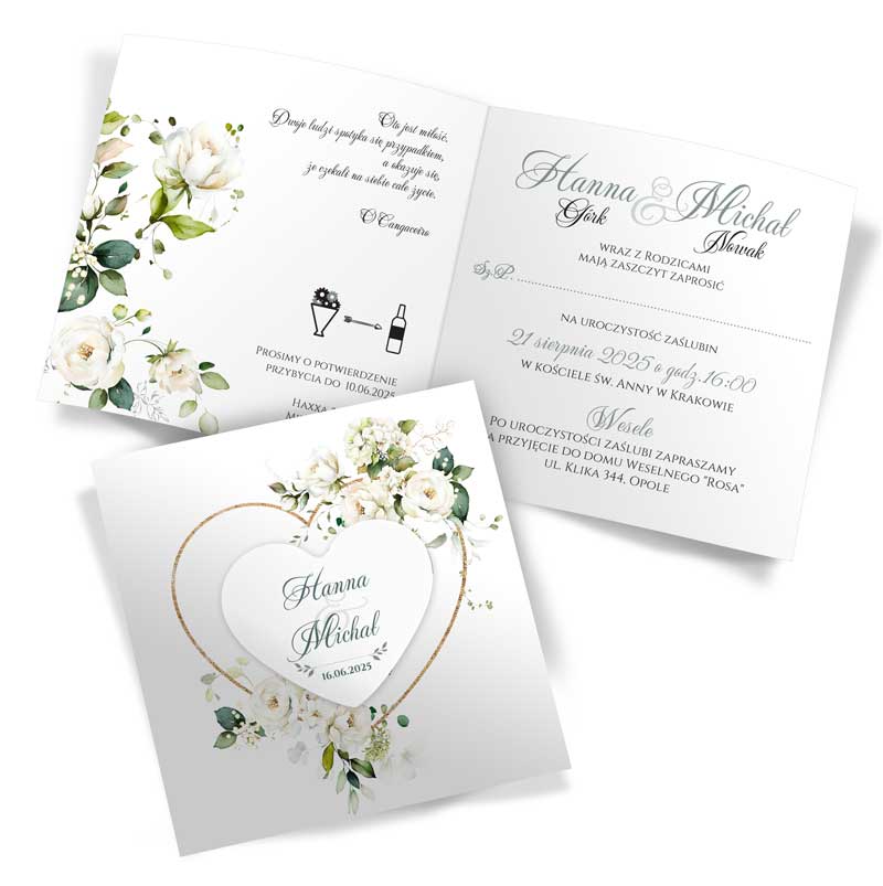 Wymiary – złożone: 15cm x 15cm ; rozłożone: 30cm x 15cm | Serce z przylepcem na front zaproszenia | Zaproszenia do samodzielnego złożenia