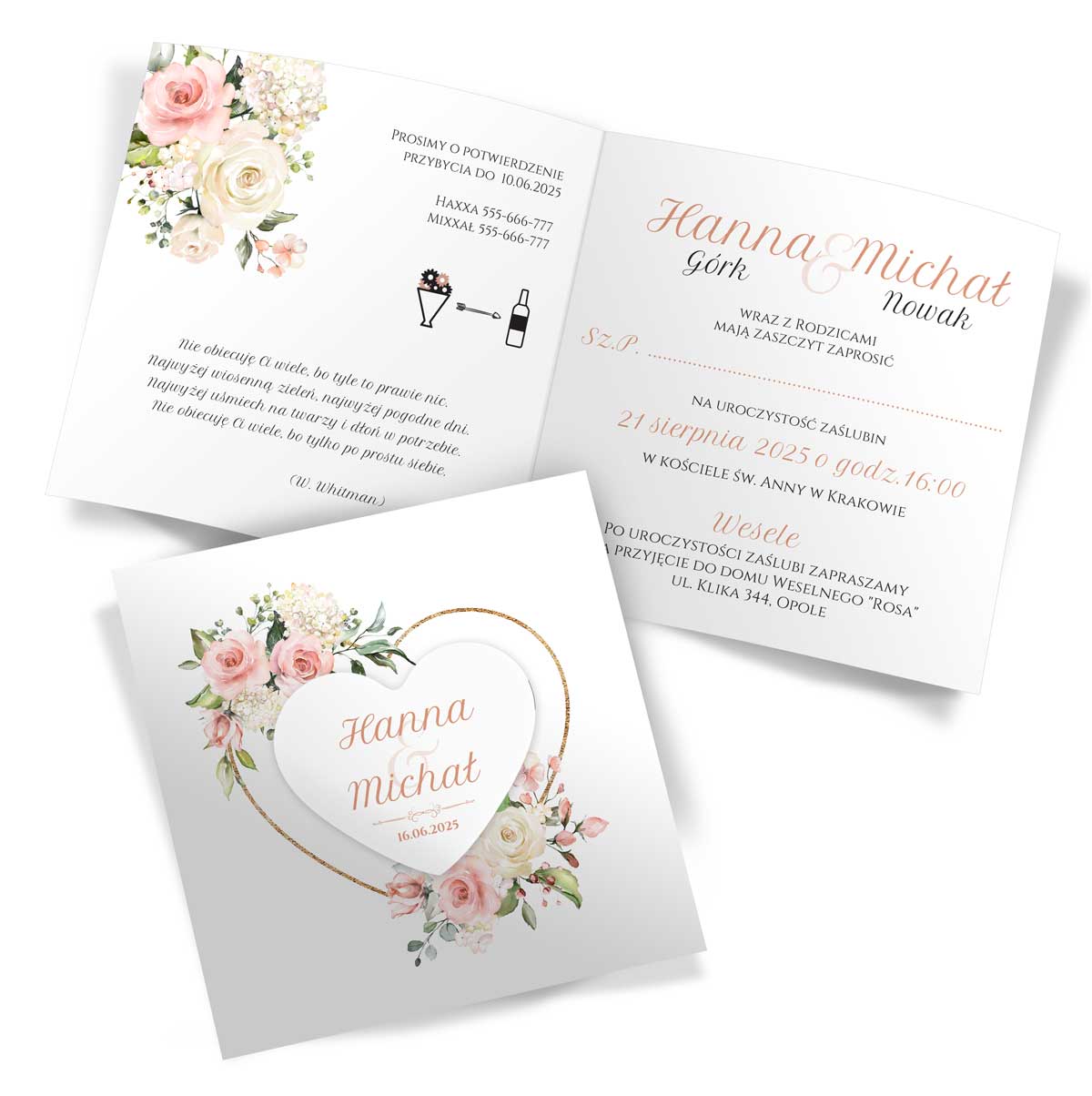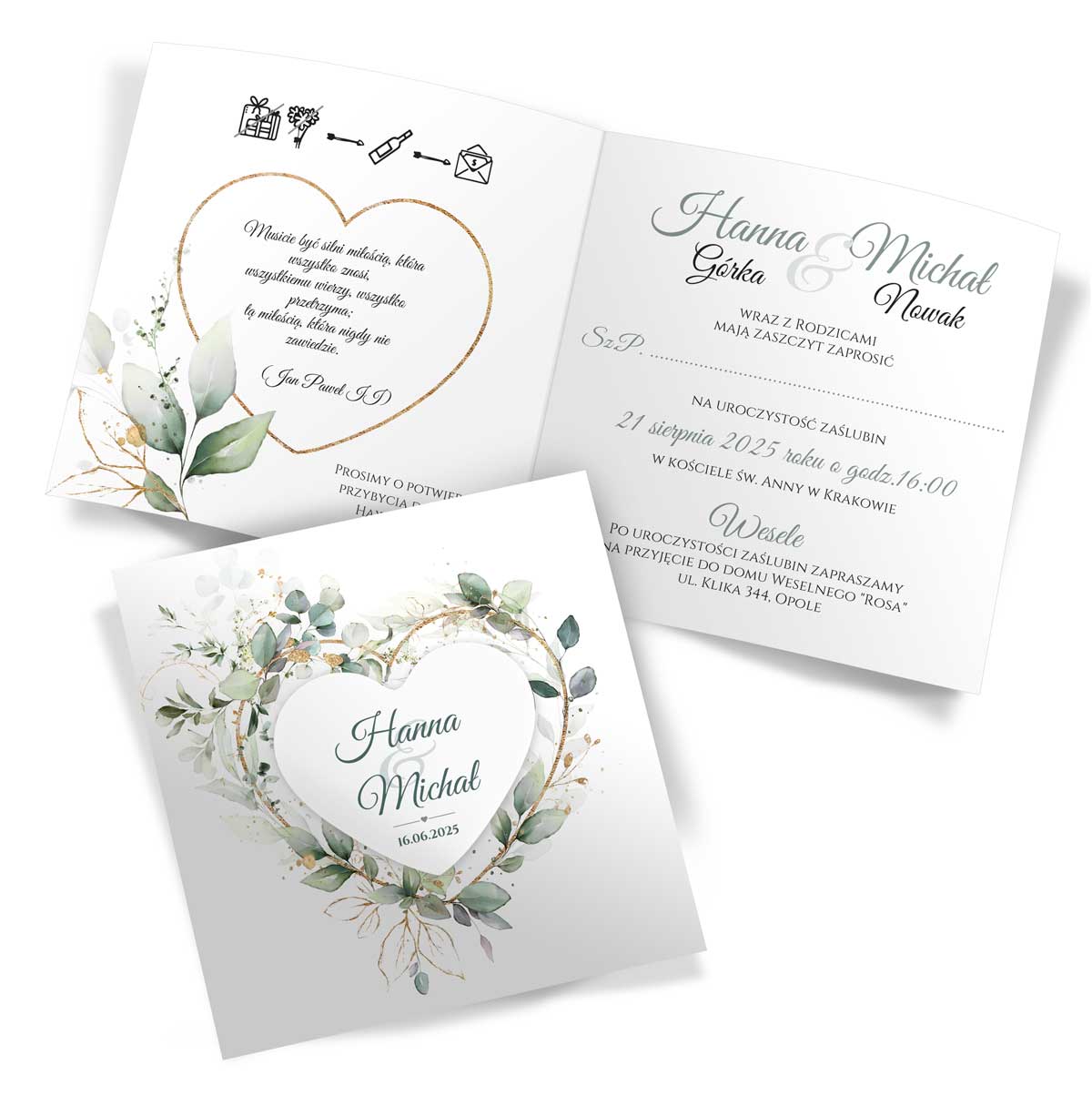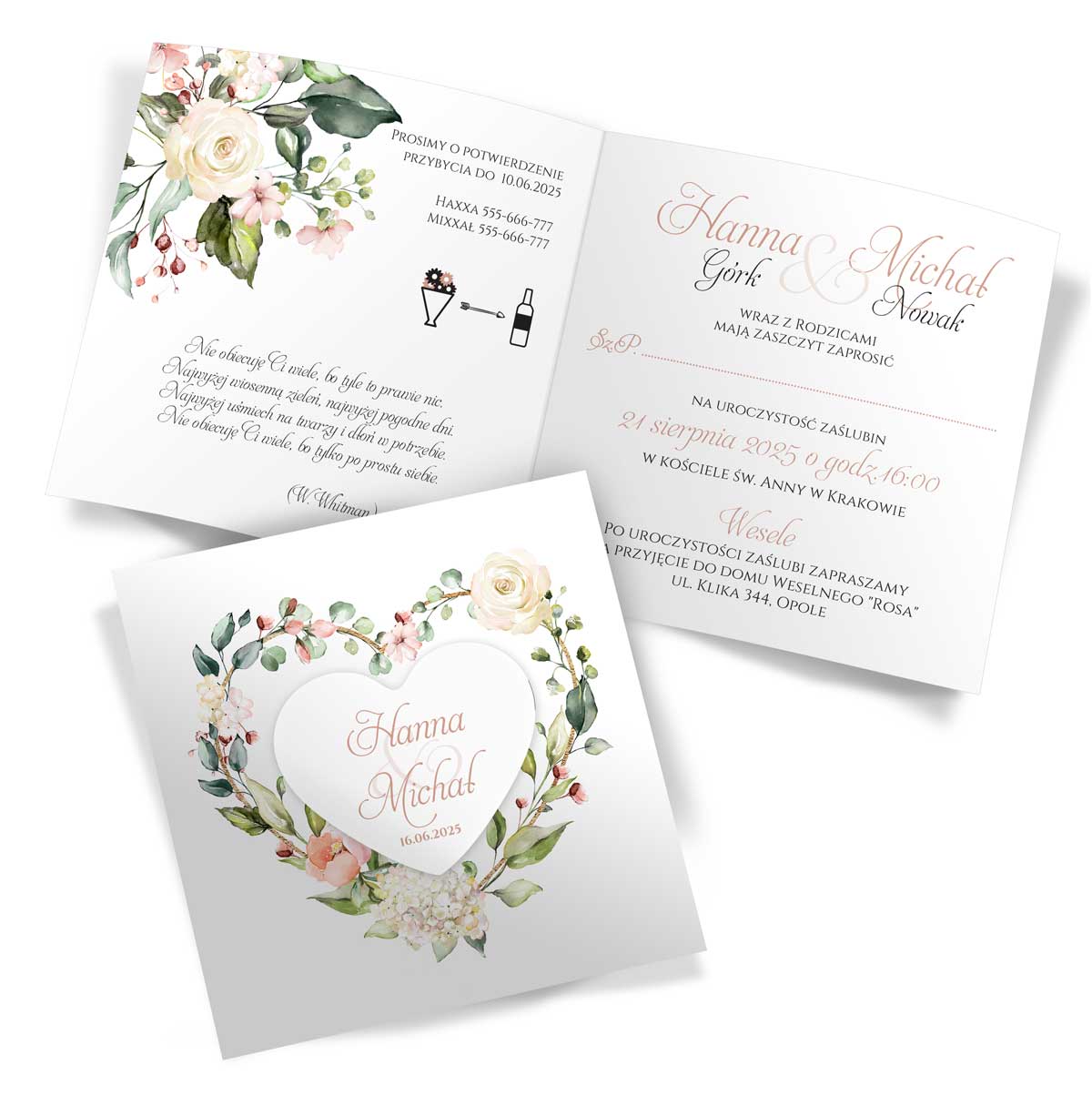 Wymiary – złożone: 15cm x 15cm ; rozłożone: 30cm x 15cm | Serce z przylepcem na front zaproszenia | Zaproszenia do samodzielnego złożenia