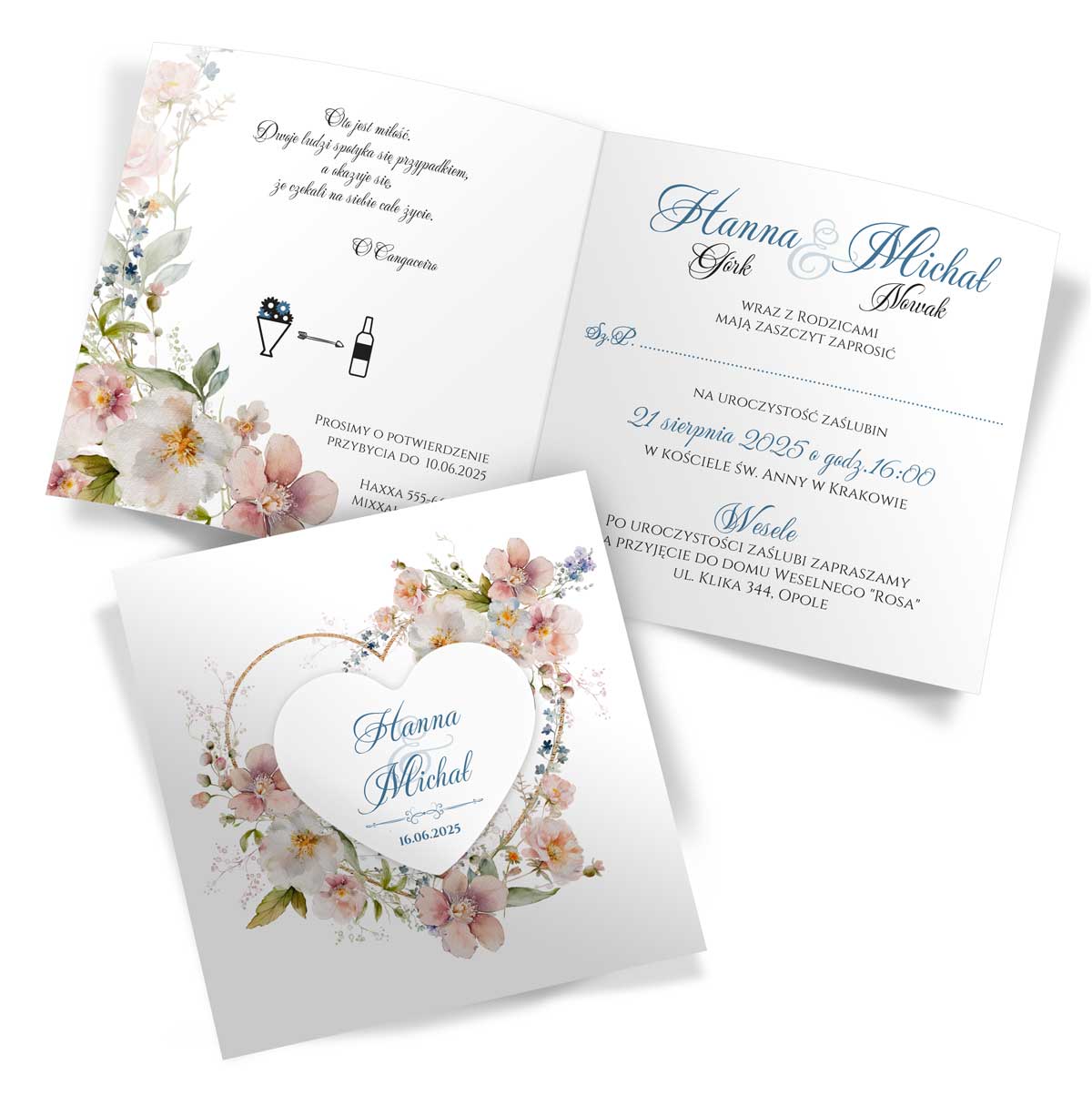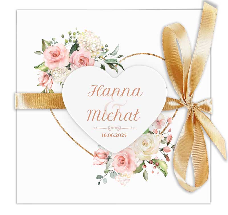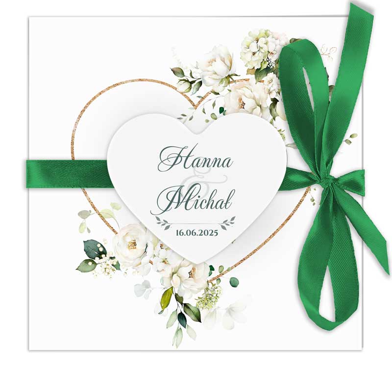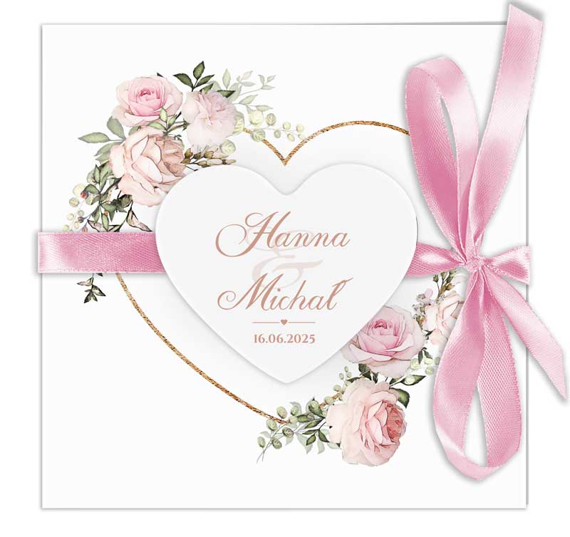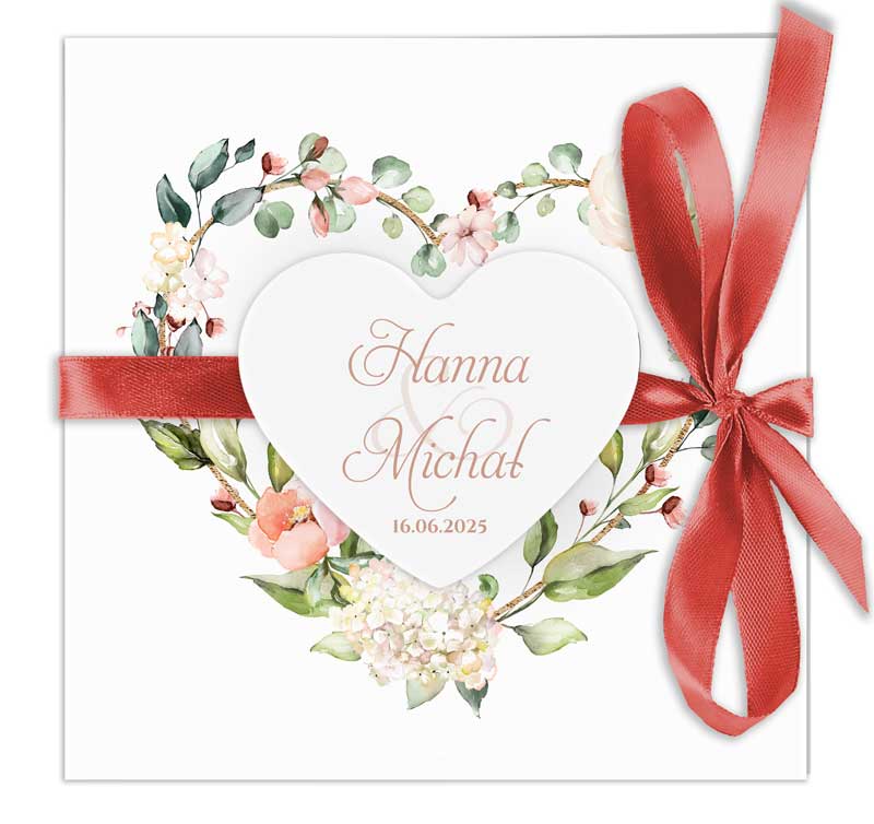 Zaproszenia z motywem serca ozdobione kwiatowymi kompozycjami ze wstążką i sercem. Zaproszenie jest dostępne w różnych gamach kolorystycznych. Treść na zaproszeniach jest całkowicie dowolna, możesz przygotować projekt na dowolną okazję.
