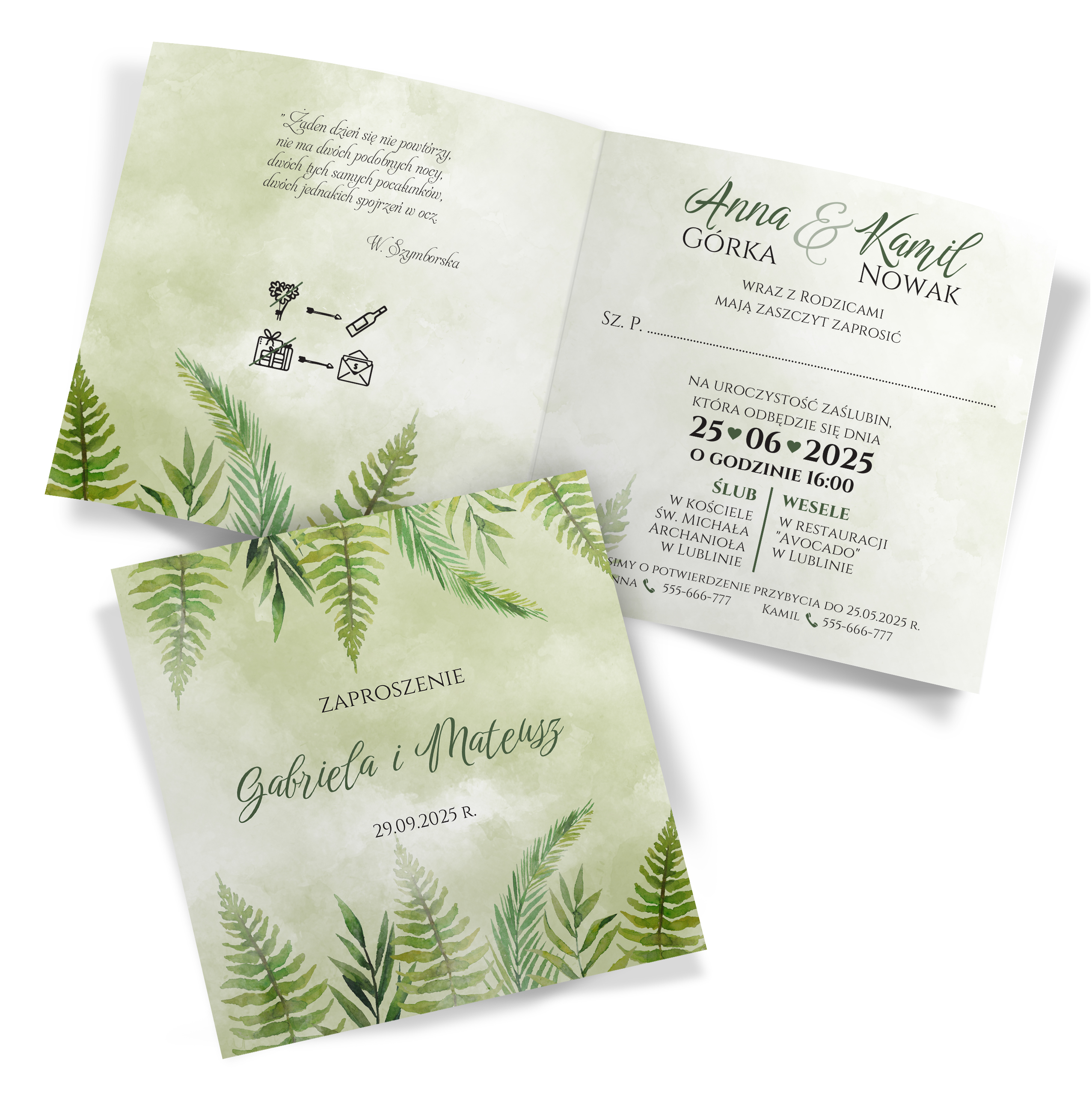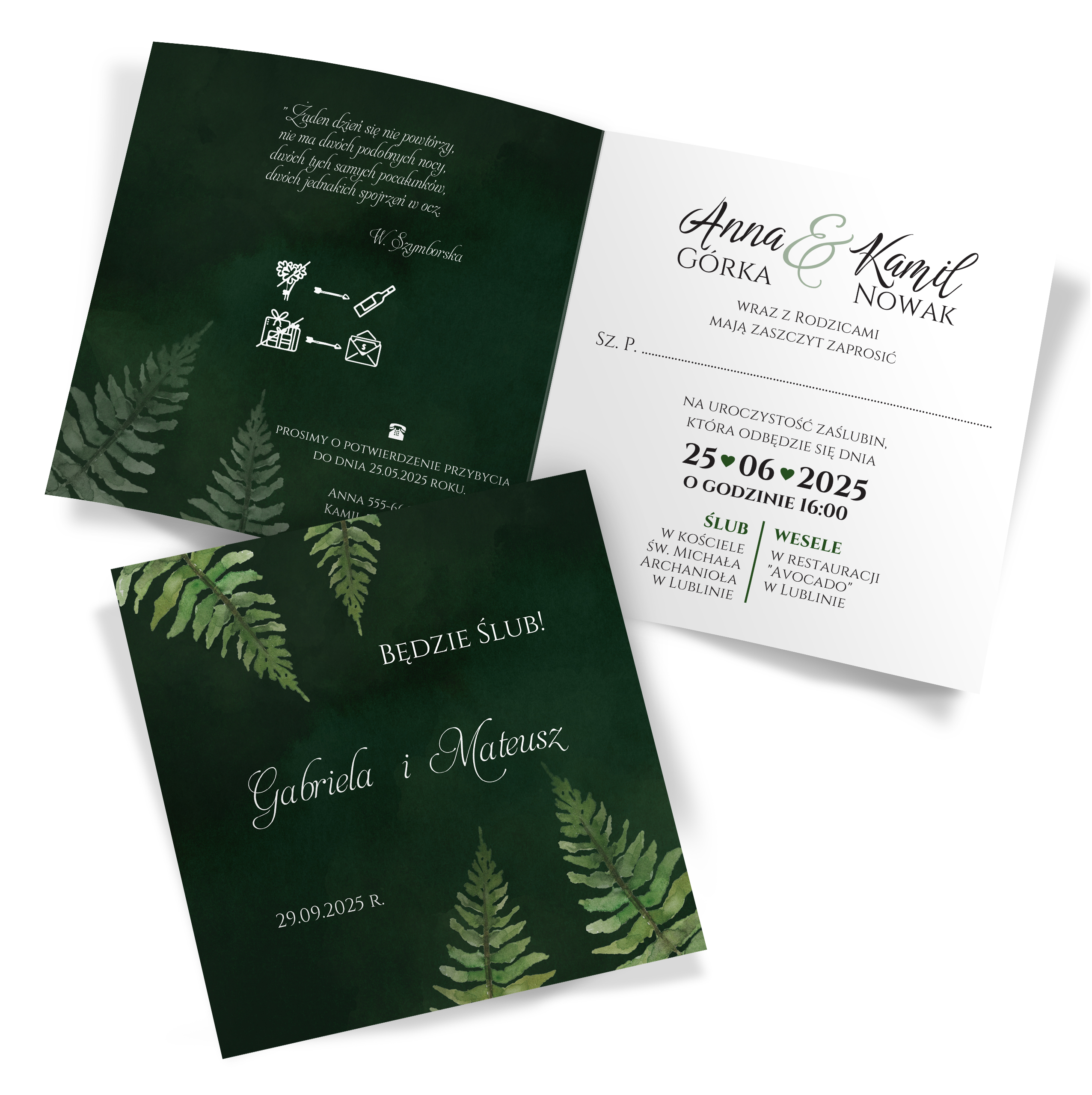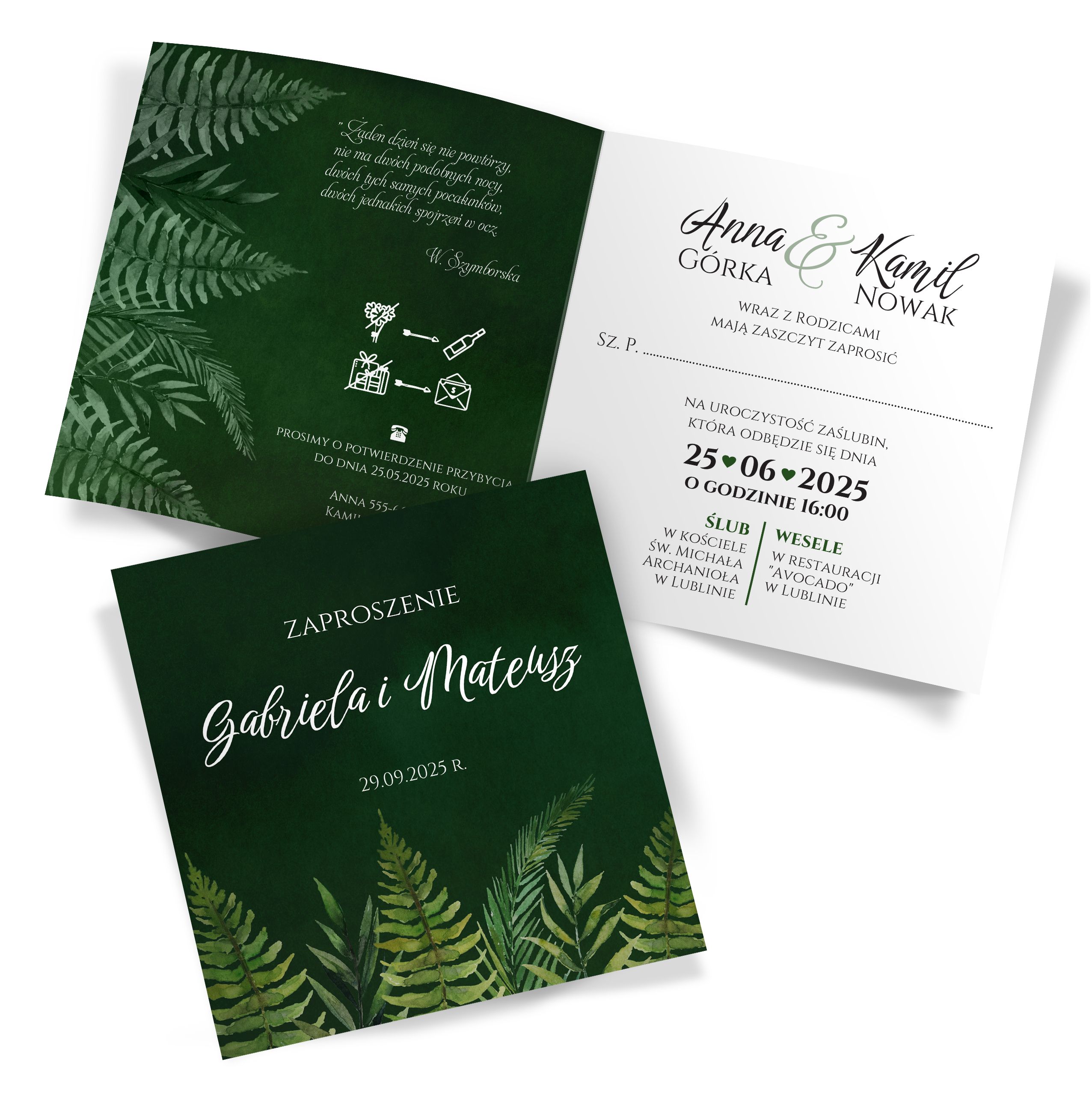 Zaproszenia ślubne z motywem paproci to idealny wybór dla par, które pragną dodać swojemu wielkiemu dniu odrobinę magii natury. Intensywny kolor butelkowej zieleni nadaje im wyjątkowego uroku, a biel we wnętrzu zaproszenia stanowi elegancki kontrast. Treść na zaproszeniach jest całkowicie dowolna, możesz przygotować projekt na dowolną okazję.