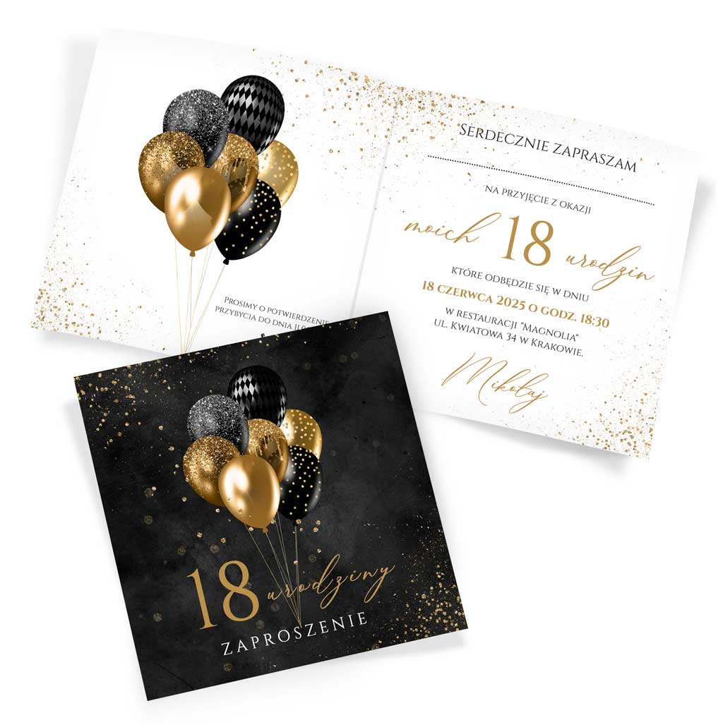 Zaproszenia Urodzinowe – balony Złote Czarne