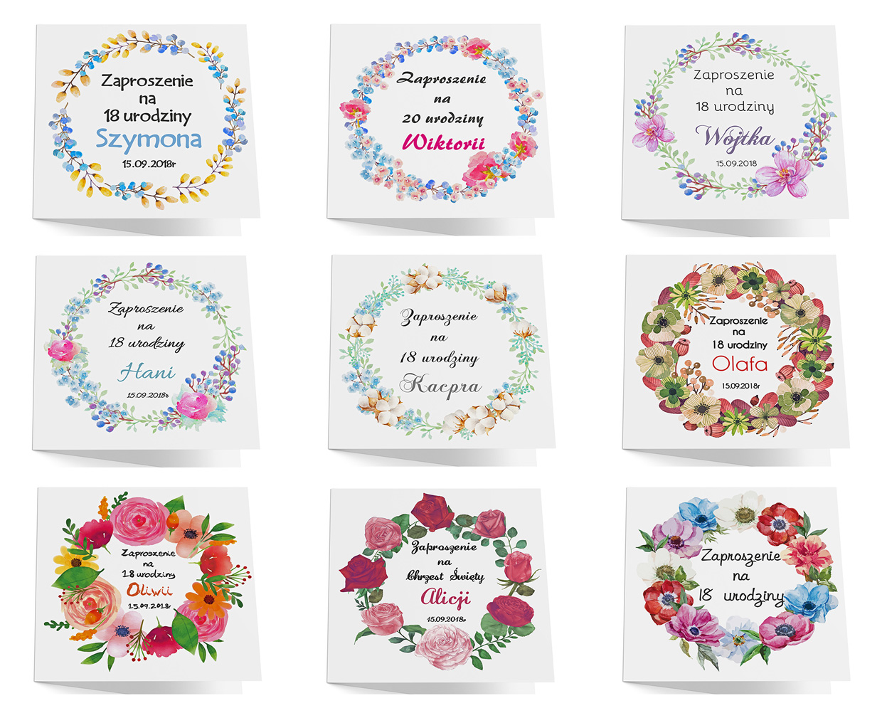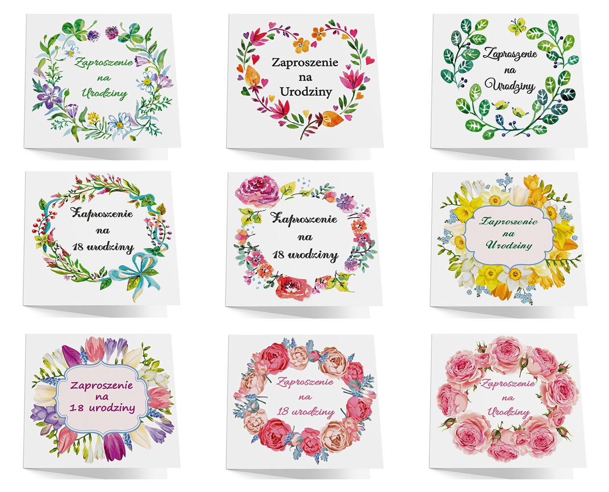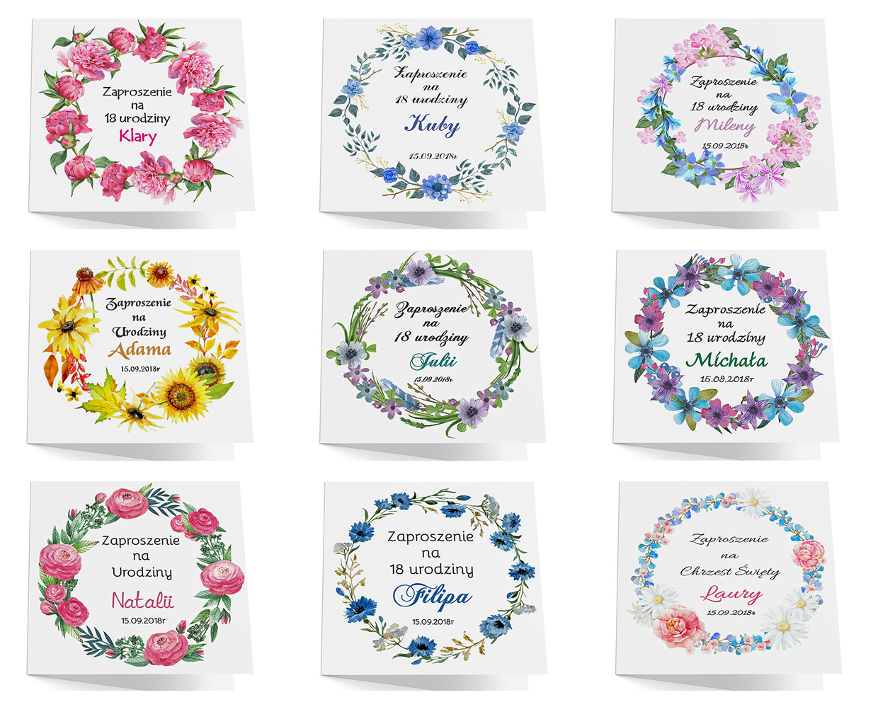 Wyjątkowe zaproszenia na urodziny w kwiatowych motywach w różnej kolorystyce do wyboru. Zaproszenia przygotujesz na dowolną okazję, nie tylko 18 urodziny.