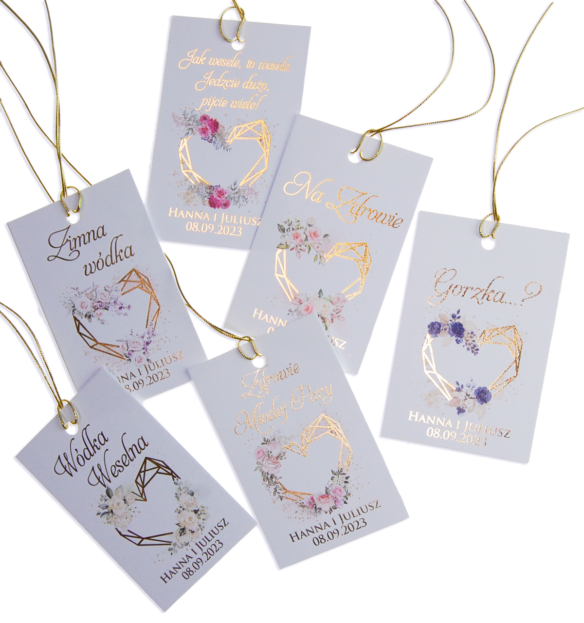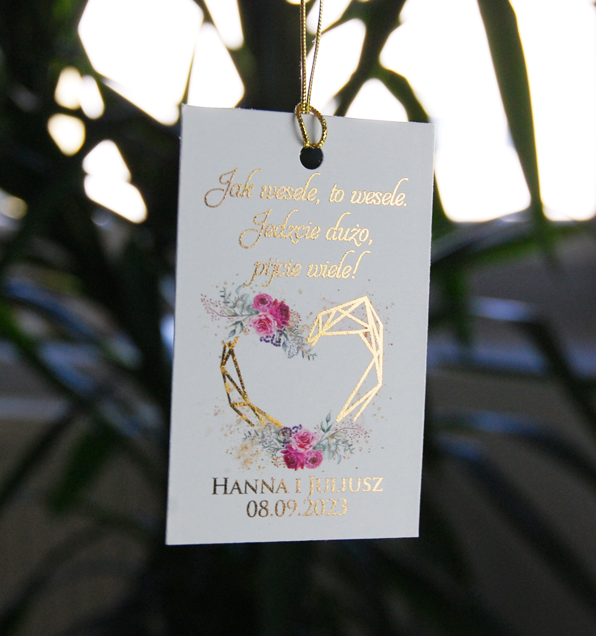 Stylowe zawieszki ślubne to idealny dodatek do ozdoby stołu weselnego! Kwiatowy wzór z pozłacanym sercem dodaje im elegancji, a złoty sznurek nadaje im wystawny ton. Możesz na nich umieścić aż 10 dowolnych tekstów, które nadadzą zawieszkom jeszcze bardziej osobisty charakter.